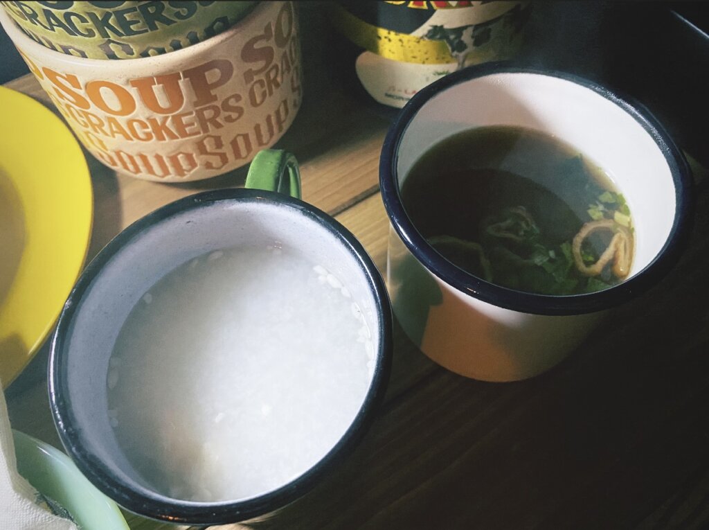 (真後ろにでかでかとスープと書かれたスープボウルがあるのに、何故エナメルマグを使っているかと言うと、お湯で溶かすタイプのレトルトスープだとマグくらいのサイズ感がちょうど良いんですよね〜)