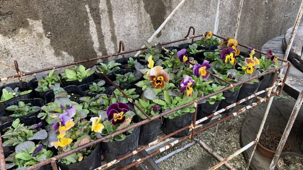 お庭では、去年のビオラから種取りし、夏の終わりに種まきした子達が開花し始めました。
