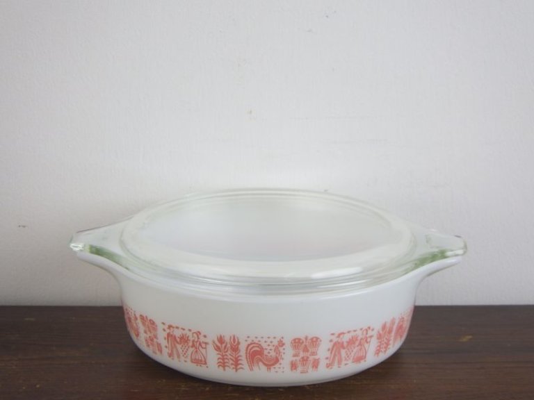 | 正式名称「シンデレラベイクサーブ&ストア」と言い、オーブン料理をそのまま食卓へ並べられる、便利でおしゃれなアイテムです。 こちらの「バタープリント」は、「アーミッシュ」とも呼ばれ、農夫、にわとり、トウモロコシ等の農作風景がプリントされており、「グーズベリー」と共に50年代を代表するシリーズです。 ピンクのタイプは生産数が少なく、ターコイズよりも希少なアイテムです。 |