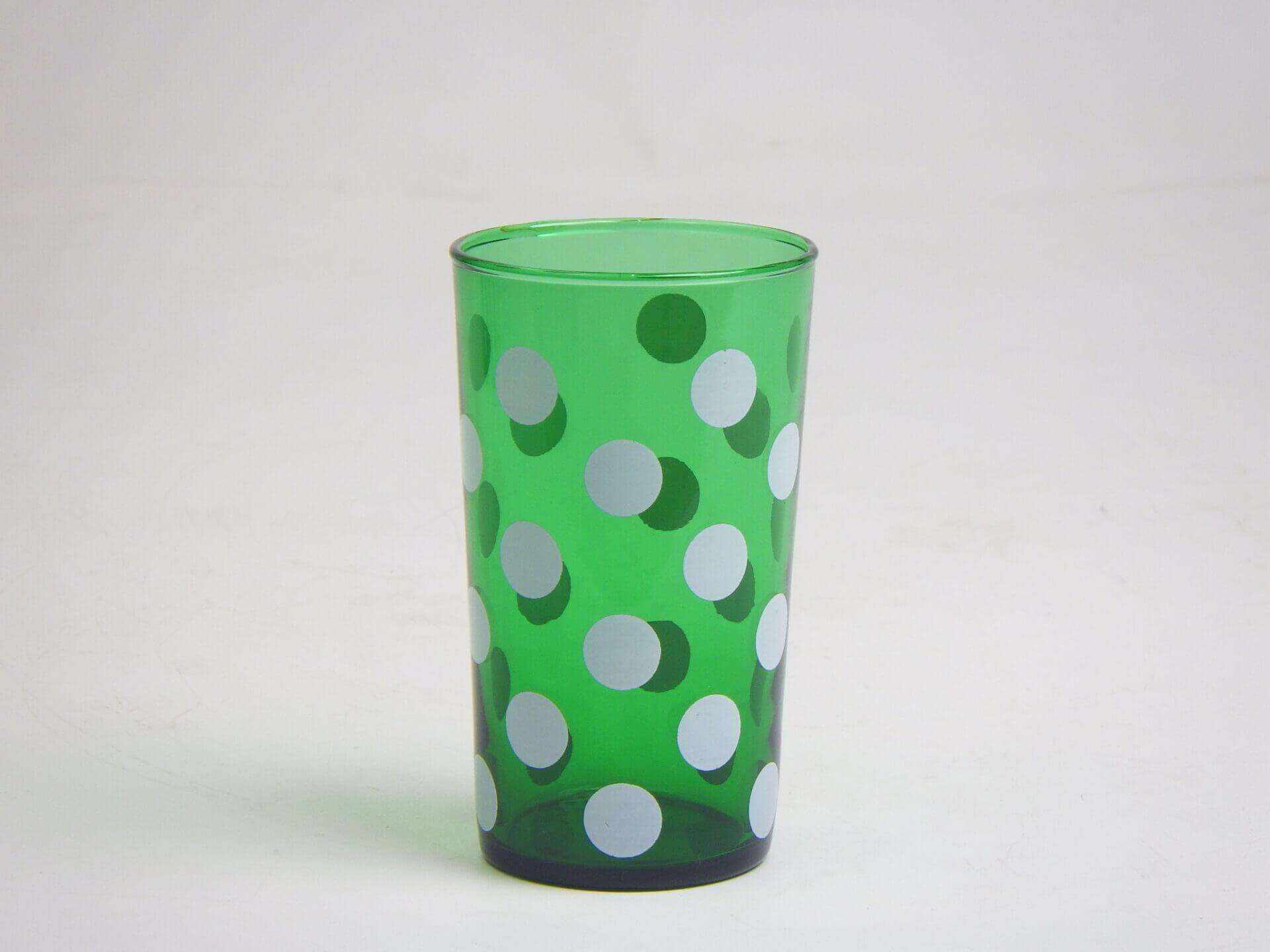 | ファイヤーキングでお馴染みの「アンカーホッキング社」製のガラスのタンブラーです。 深いグリーンが美しいこちらは、フォレストグリーンのホワイトドットシリーズです。 |