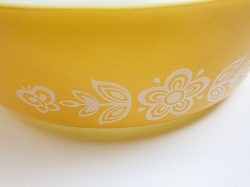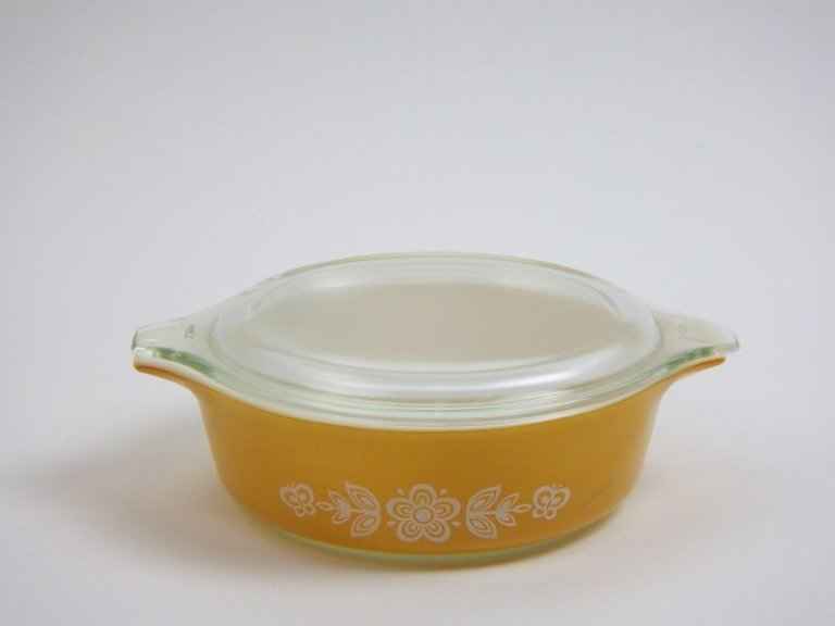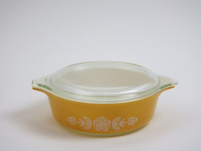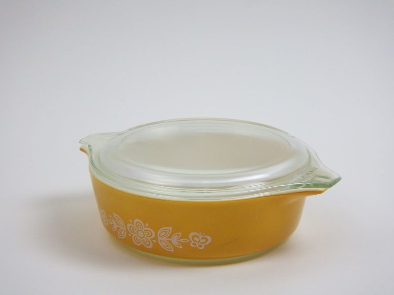| 正式名称「シンデレラベイクサーブ&ストア」と言い、オーブン料理をそのまま食卓へ並べられる、便利でおしゃれなアイテムです。 オールドパイレックスのシリーズの中でも、このバタフライゴールドは比較的ポピュラーで、マグやバターケース、ミキシングボウルなど数々のアイテムが揃っています。 同じ柄で揃えてみるのも良いですね! |