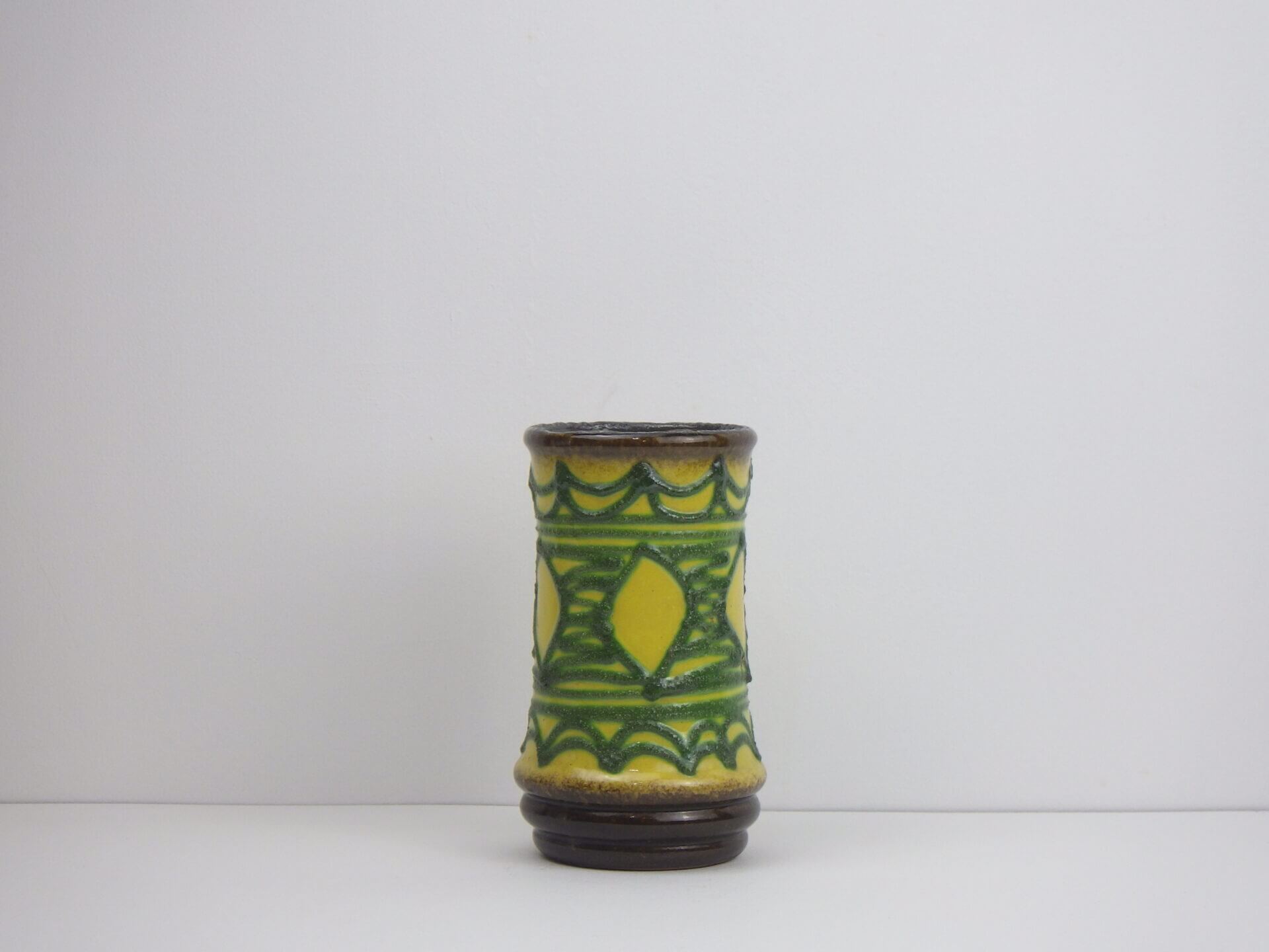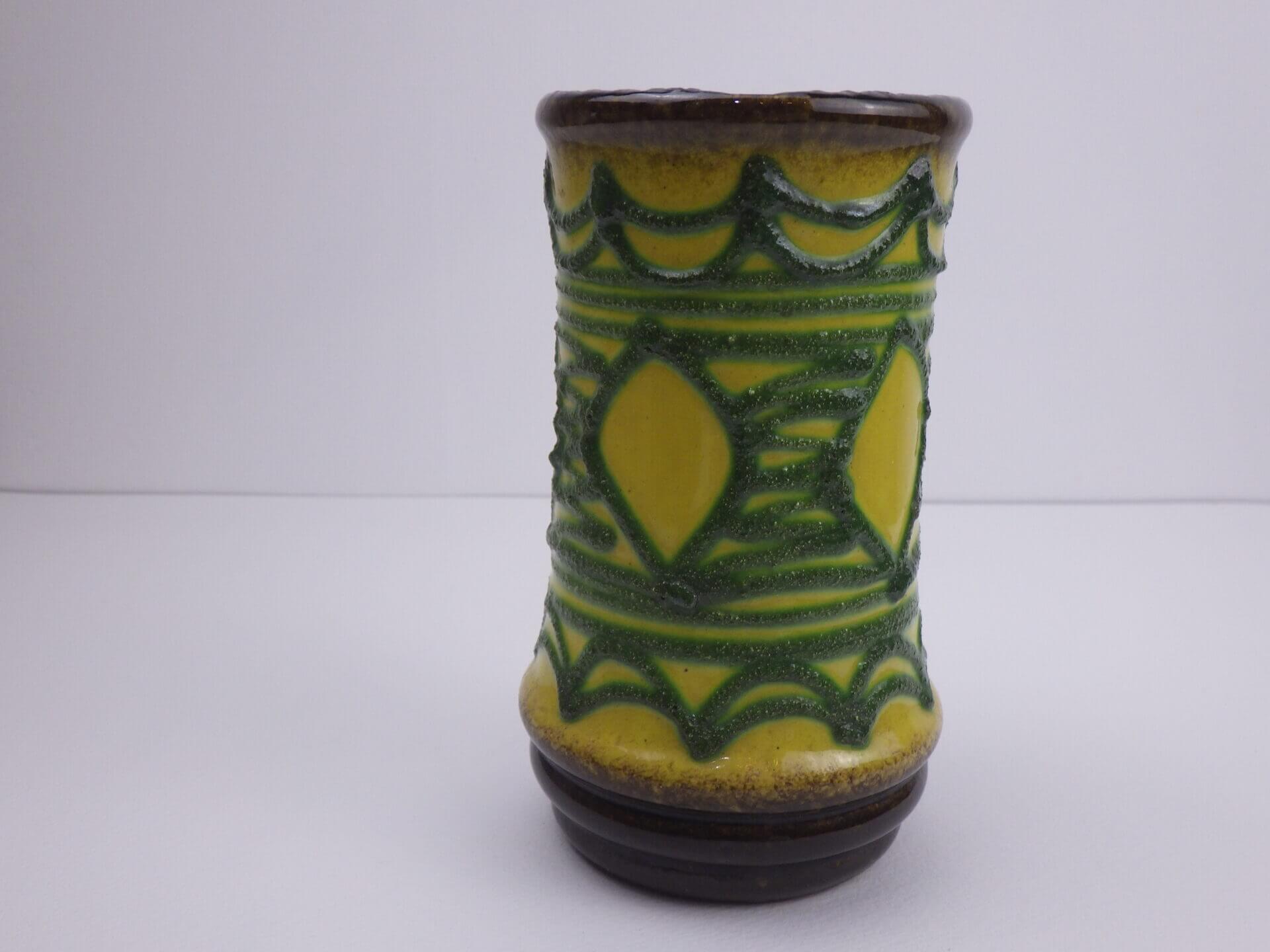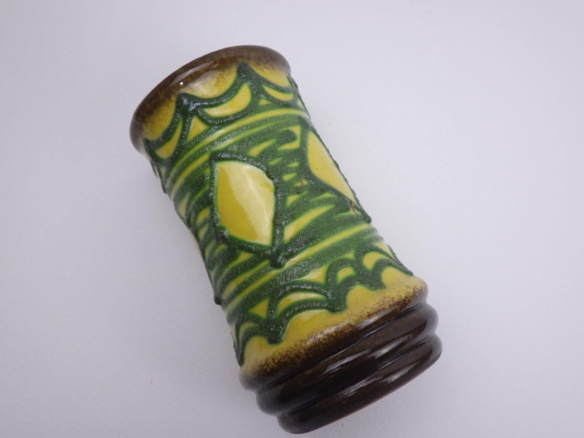 | 1960~70年代の東ドイツの国営企業、「Strehla Keramik」のFat Lava Vaseです。 西ドイツのファットラヴァに比べてドクドクしく、落ち着いた色味の物が多い印象。 こちらはめずらしく南米風な香りのするカラフルでポップなデザインの一品。 お部屋を明るい印象にしたい方におすすめです。 花を生けなくてもこれだけで絵になるアイテムですね。 |