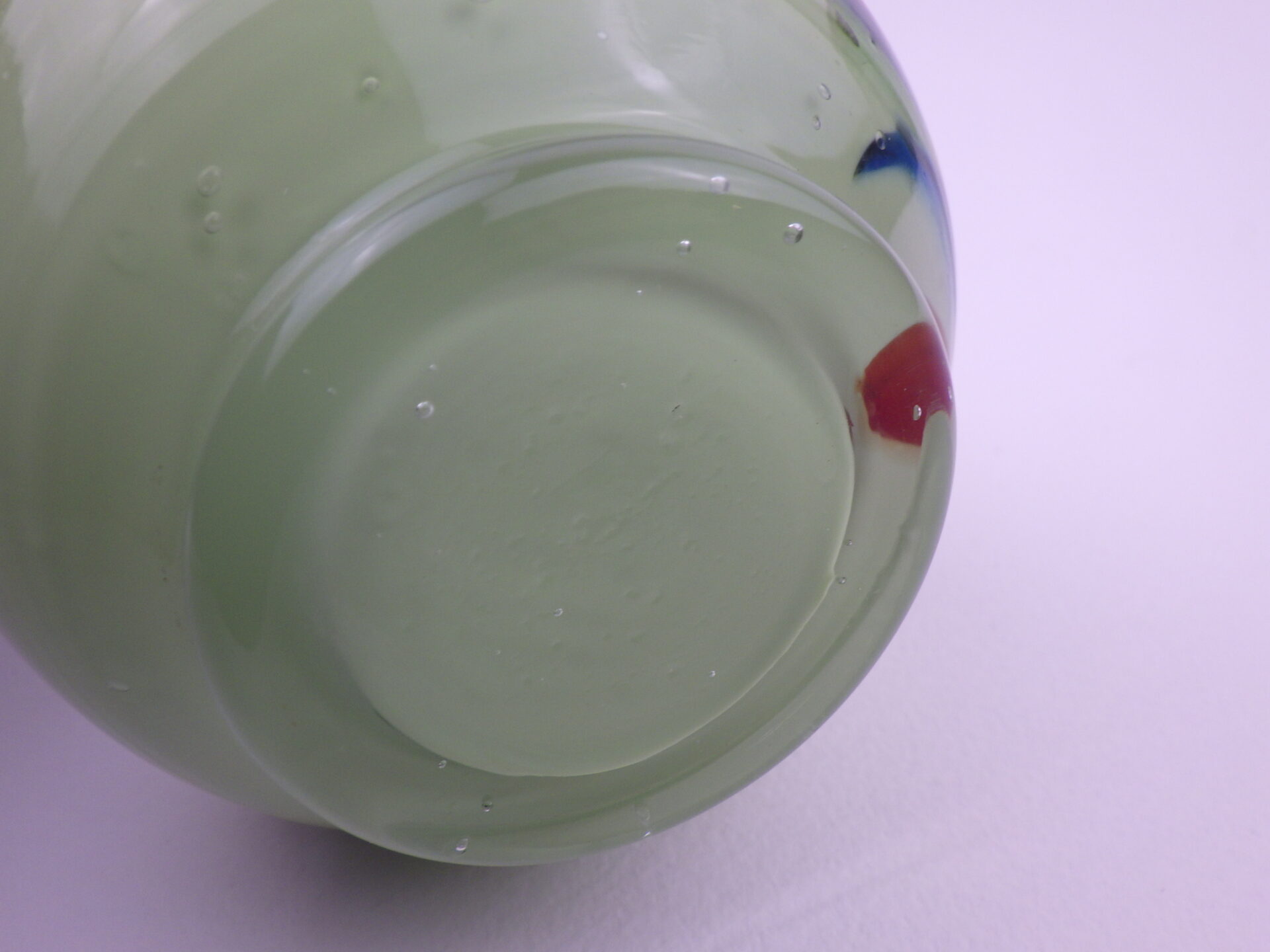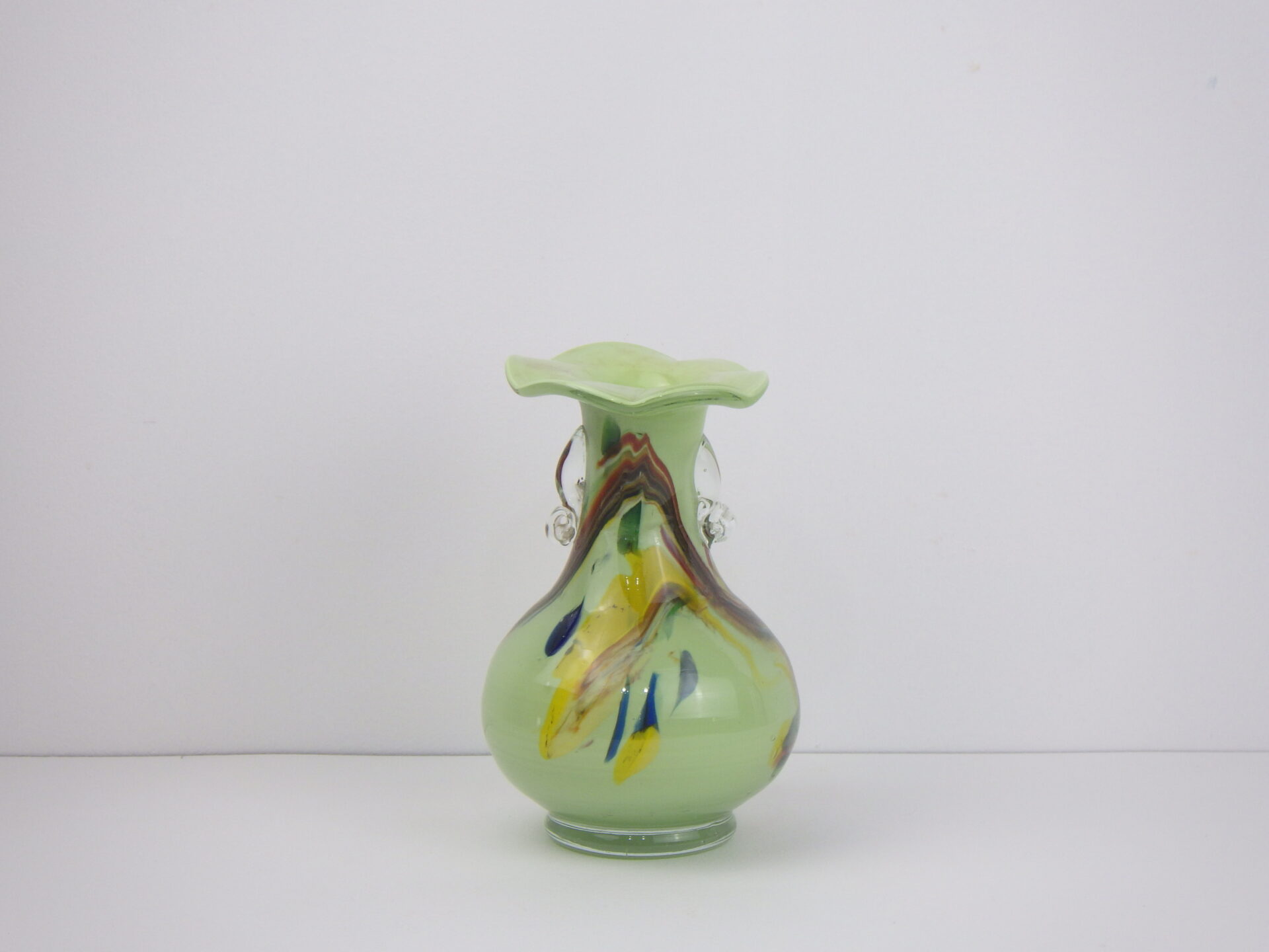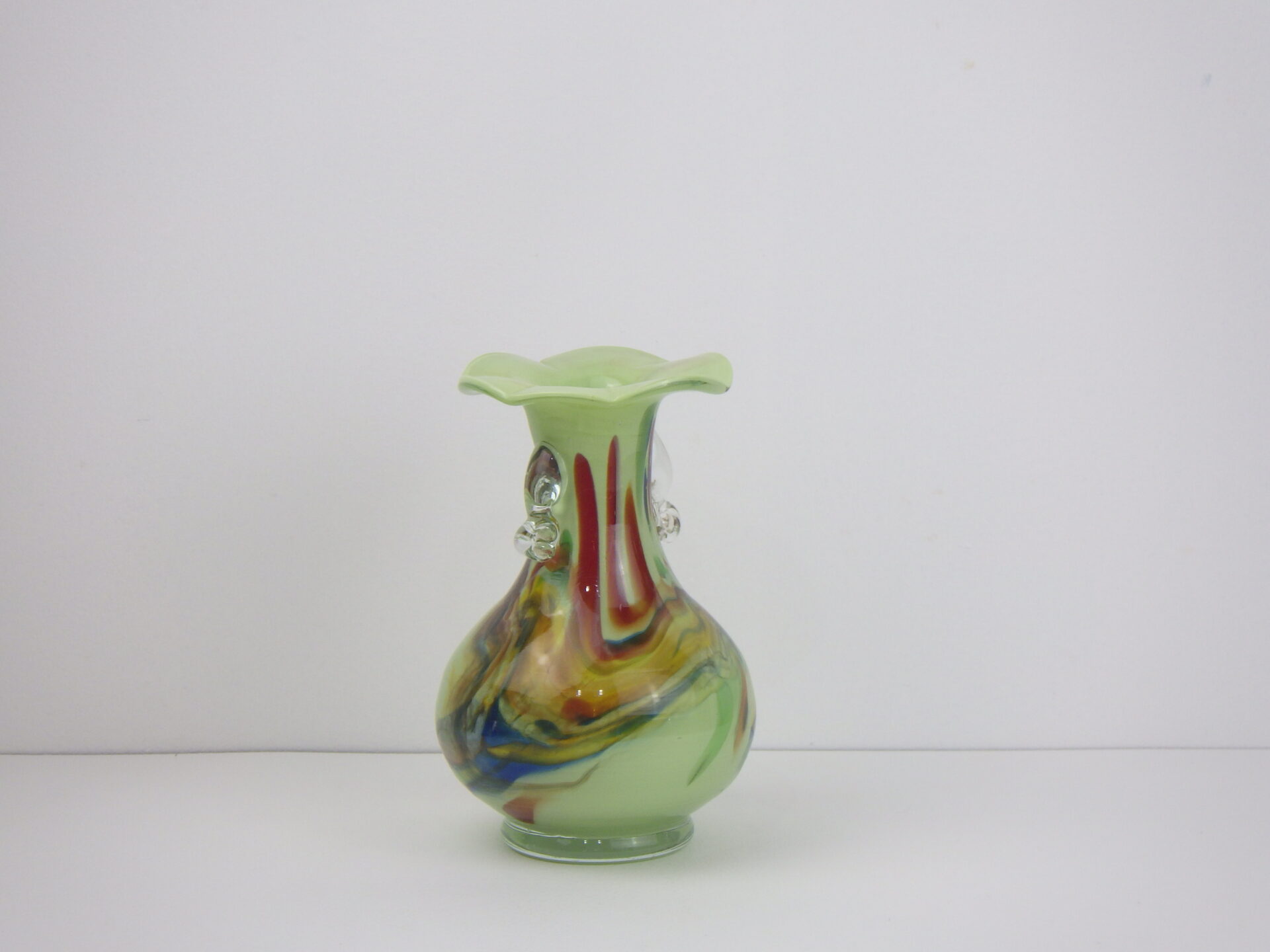 | アメリカで買い付けました。 ビンテージムラーノスタイルのフラワーベースです。 グリーンベースに色とりどりのマーブリングが施されており、何だかヴェネチアの風を感じますね。 ちょっとしたスペースにもディスプレイ出来るサイズ感なのが嬉しいアイテムです。 |