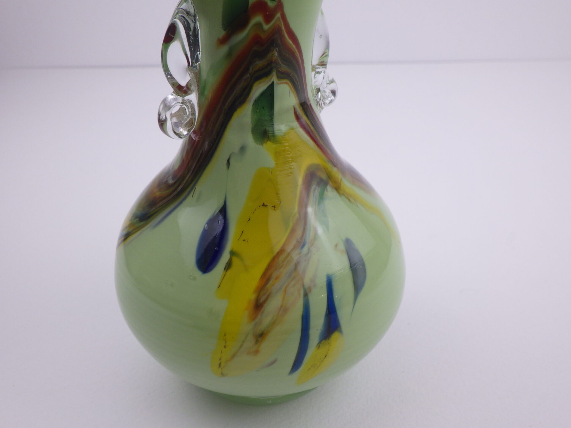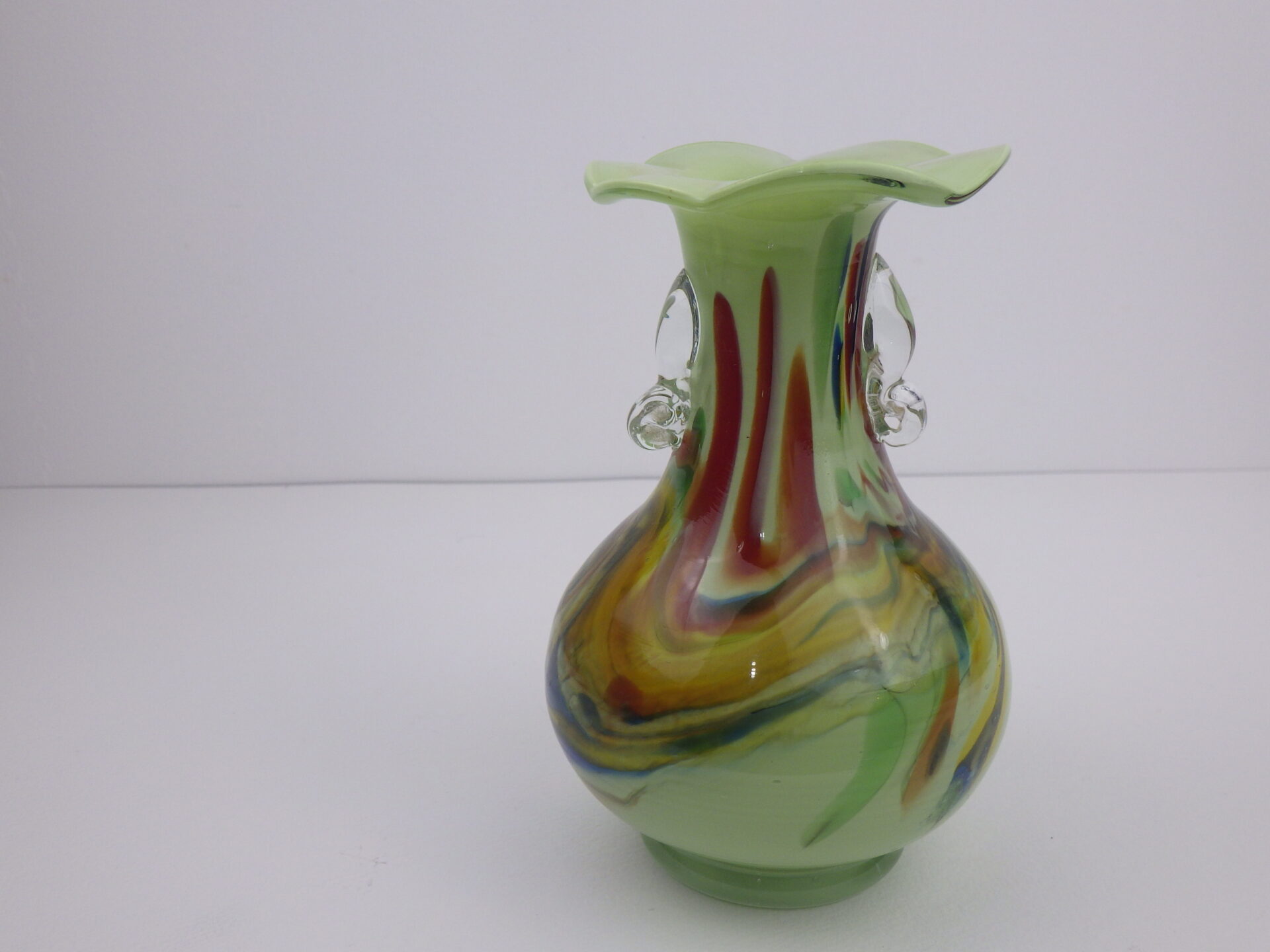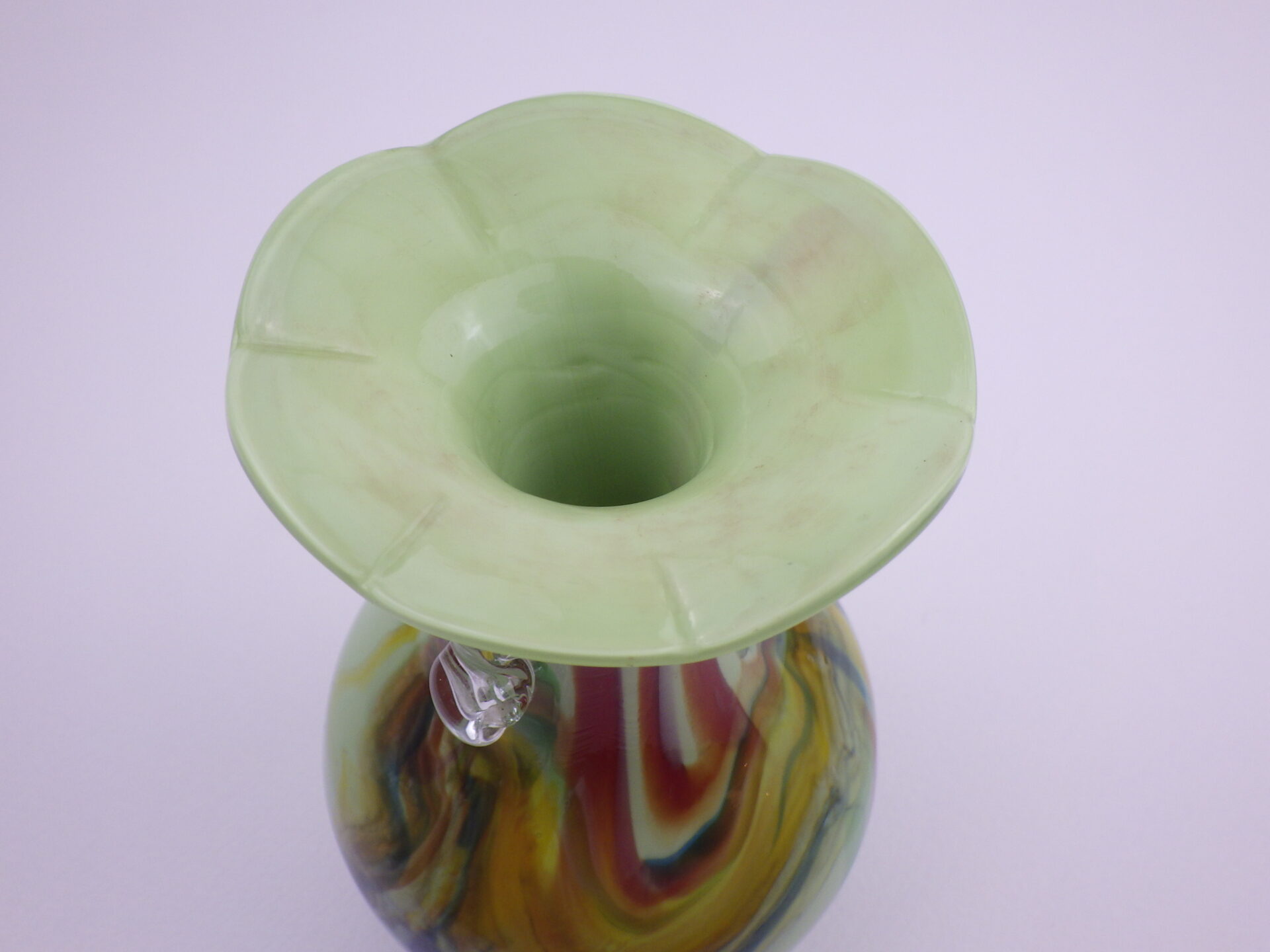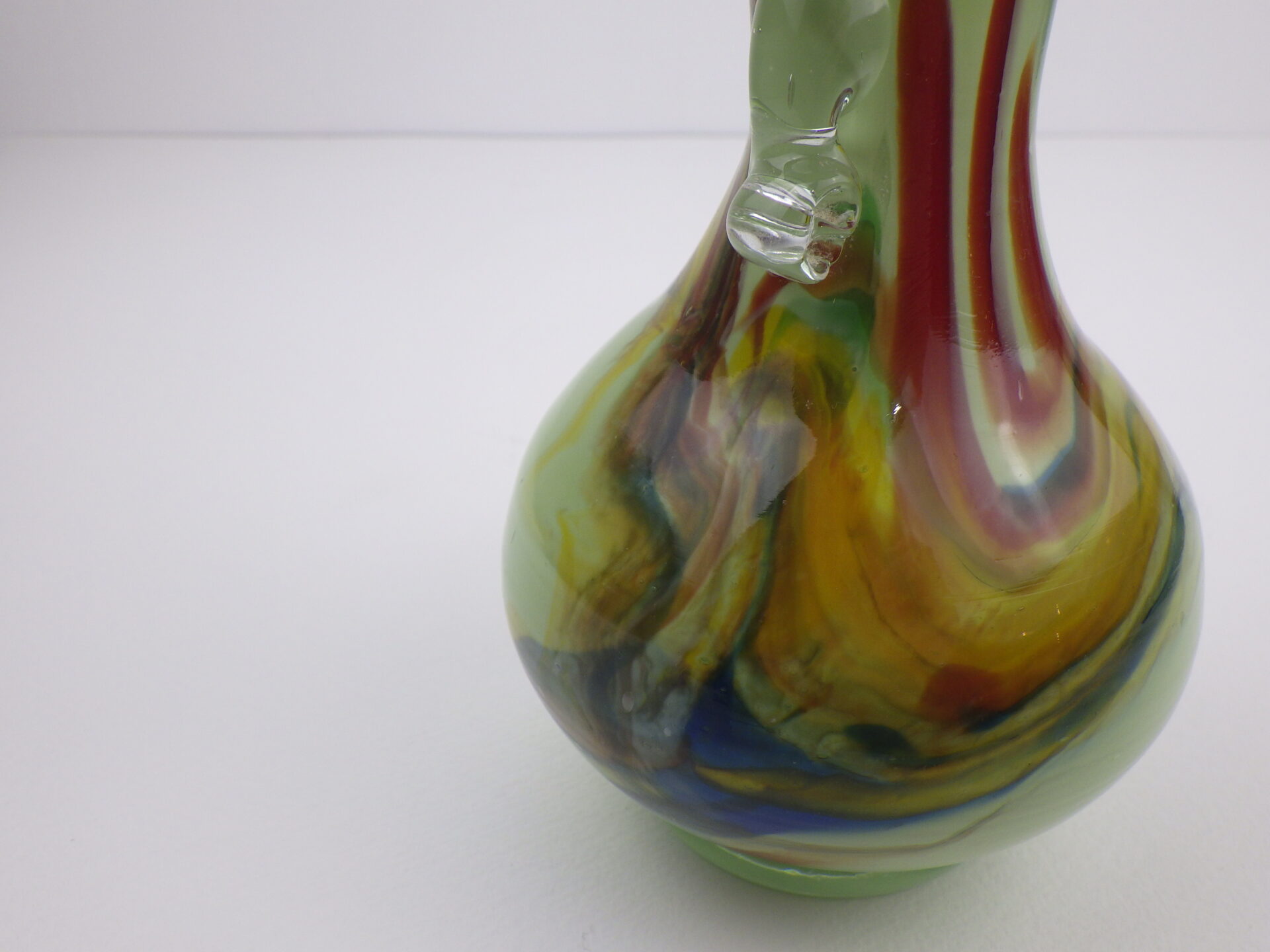 | アメリカで買い付けました。 ビンテージムラーノスタイルのフラワーベースです。 グリーンベースに色とりどりのマーブリングが施されており、何だかヴェネチアの風を感じますね。 ちょっとしたスペースにもディスプレイ出来るサイズ感なのが嬉しいアイテムです。 |