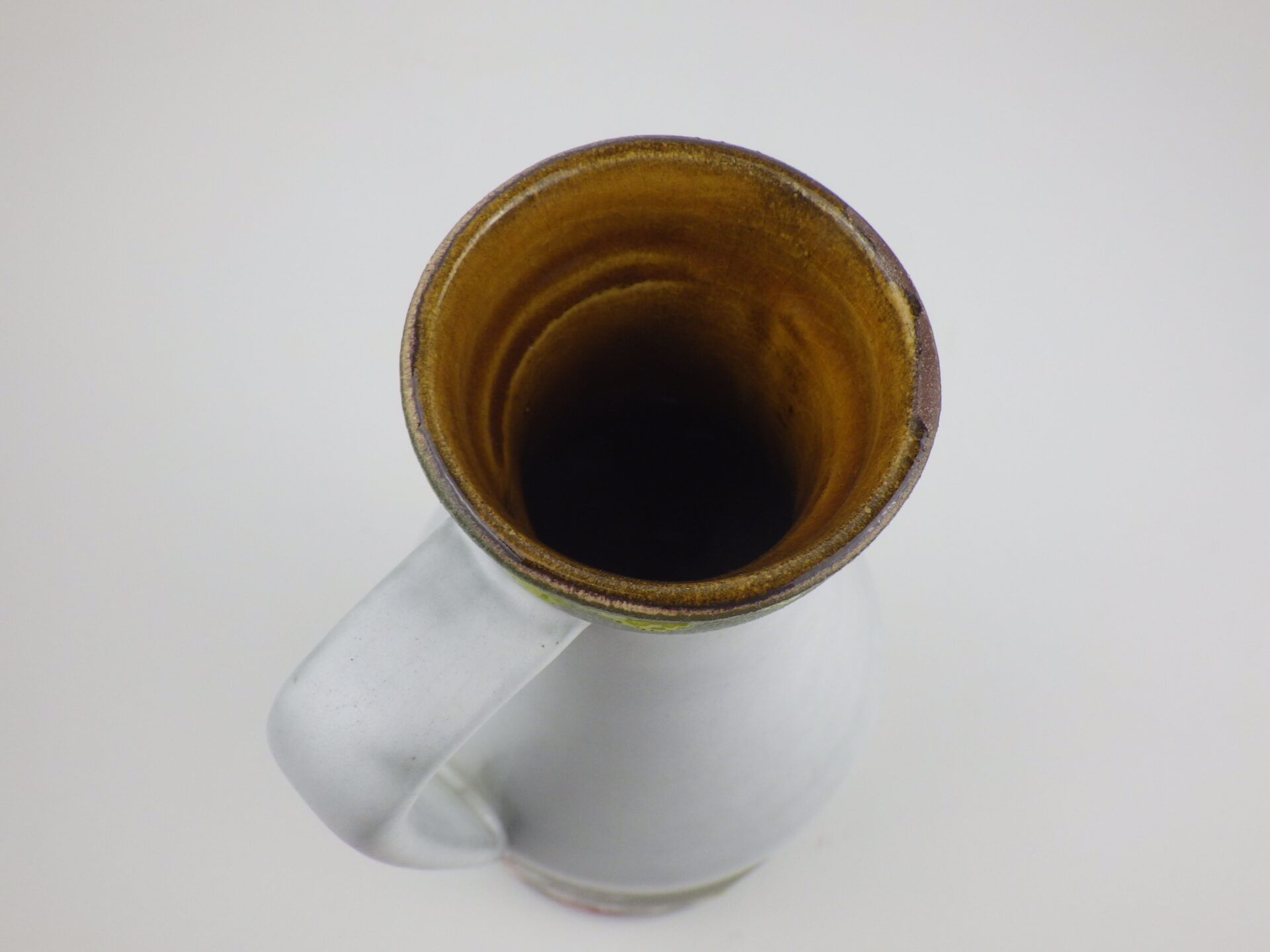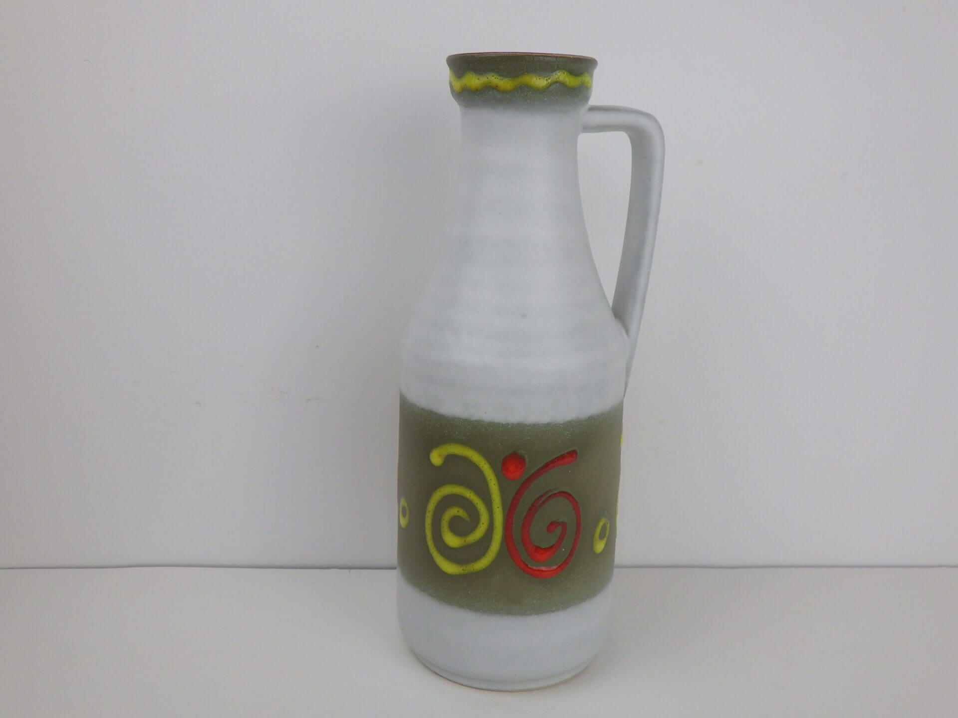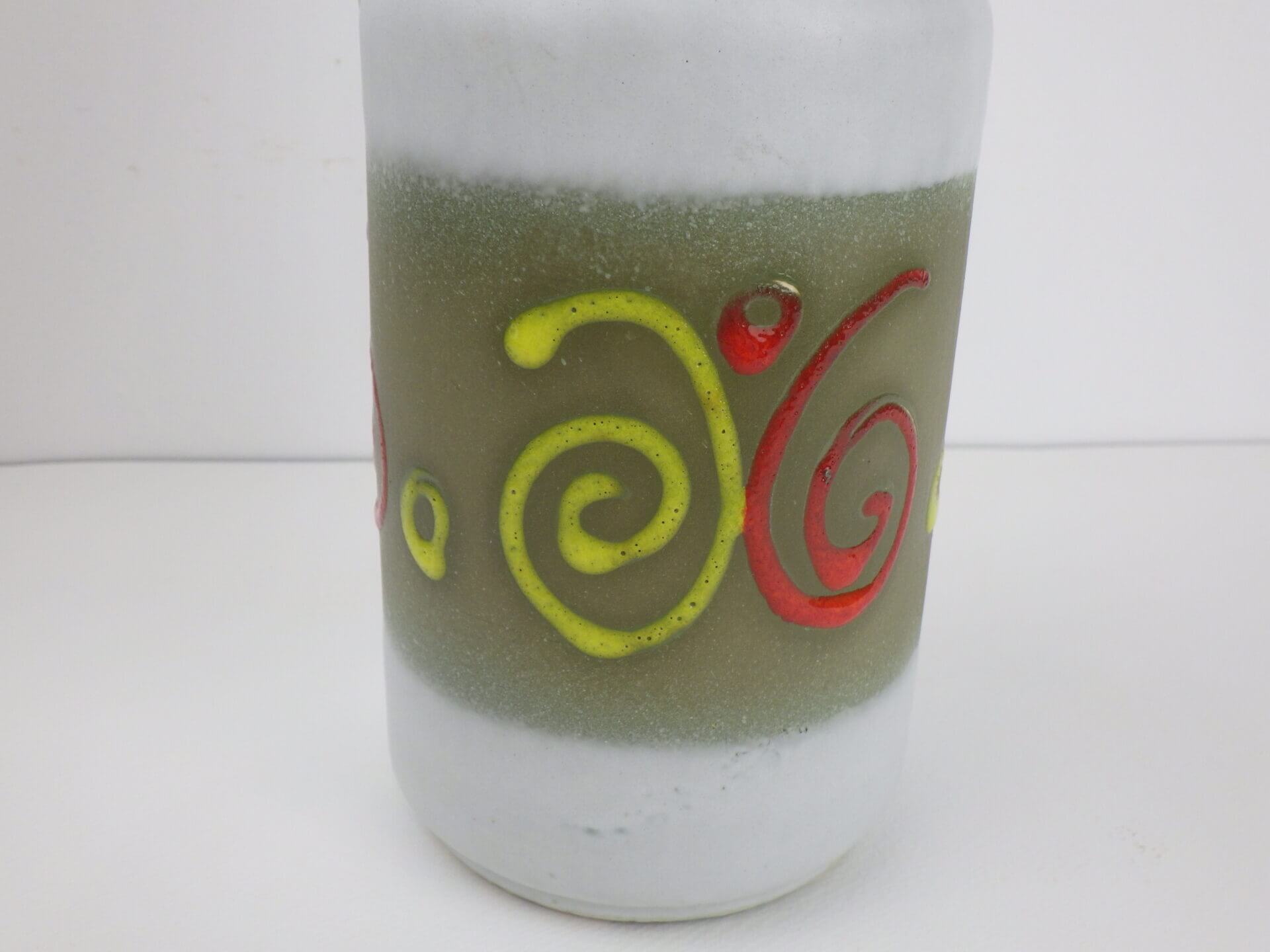 | 1950年~70年代に主に旧西ドイツで「Fat Lava」と呼ばれるビンテージ花器です。 Fat Lavaは超えた溶岩を意味し、流れ出る溶岩のような表情、色合い、ゴツゴツとした溶岩のようなテクスチャーの物が多く存在します。 こちらは1933年設立のBay Keramik製です。 よくあるFat Lavaとはまた違い、赤と黄色の渦巻き模様や落ち着いたベースの色合いなどが、日本の住宅にもよく馴染むかと思います。 角度によってちらりと見える内側の黄土のエナメル釉薬が美しいところもポイントです。 |