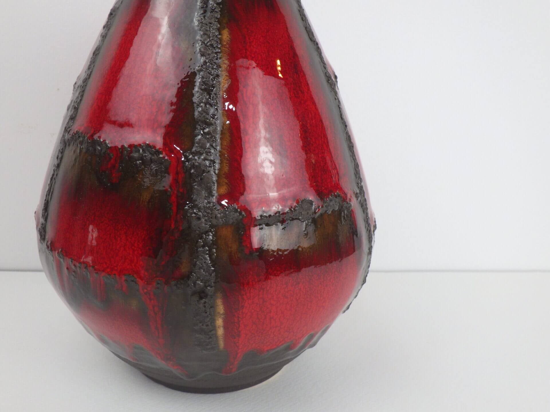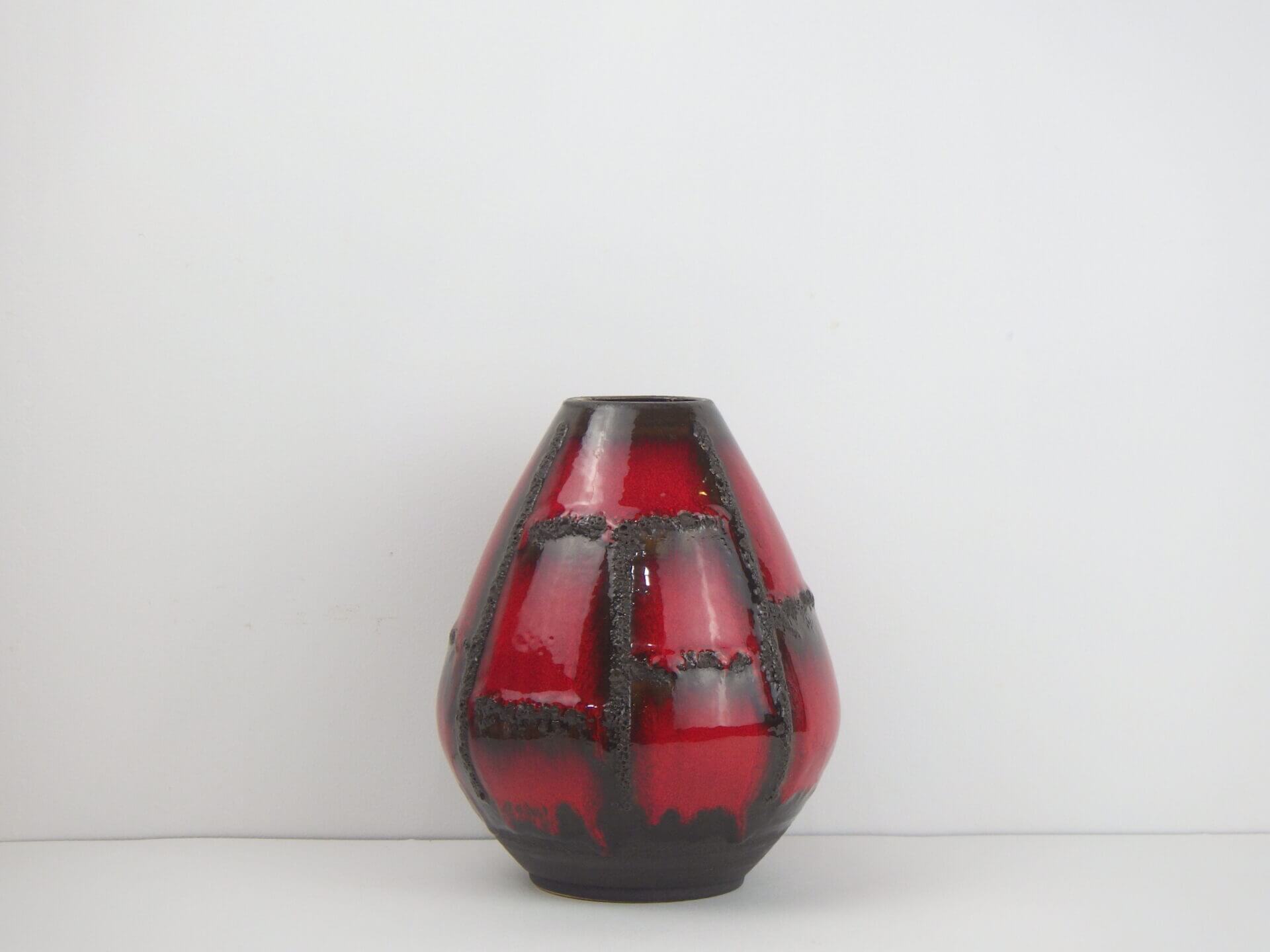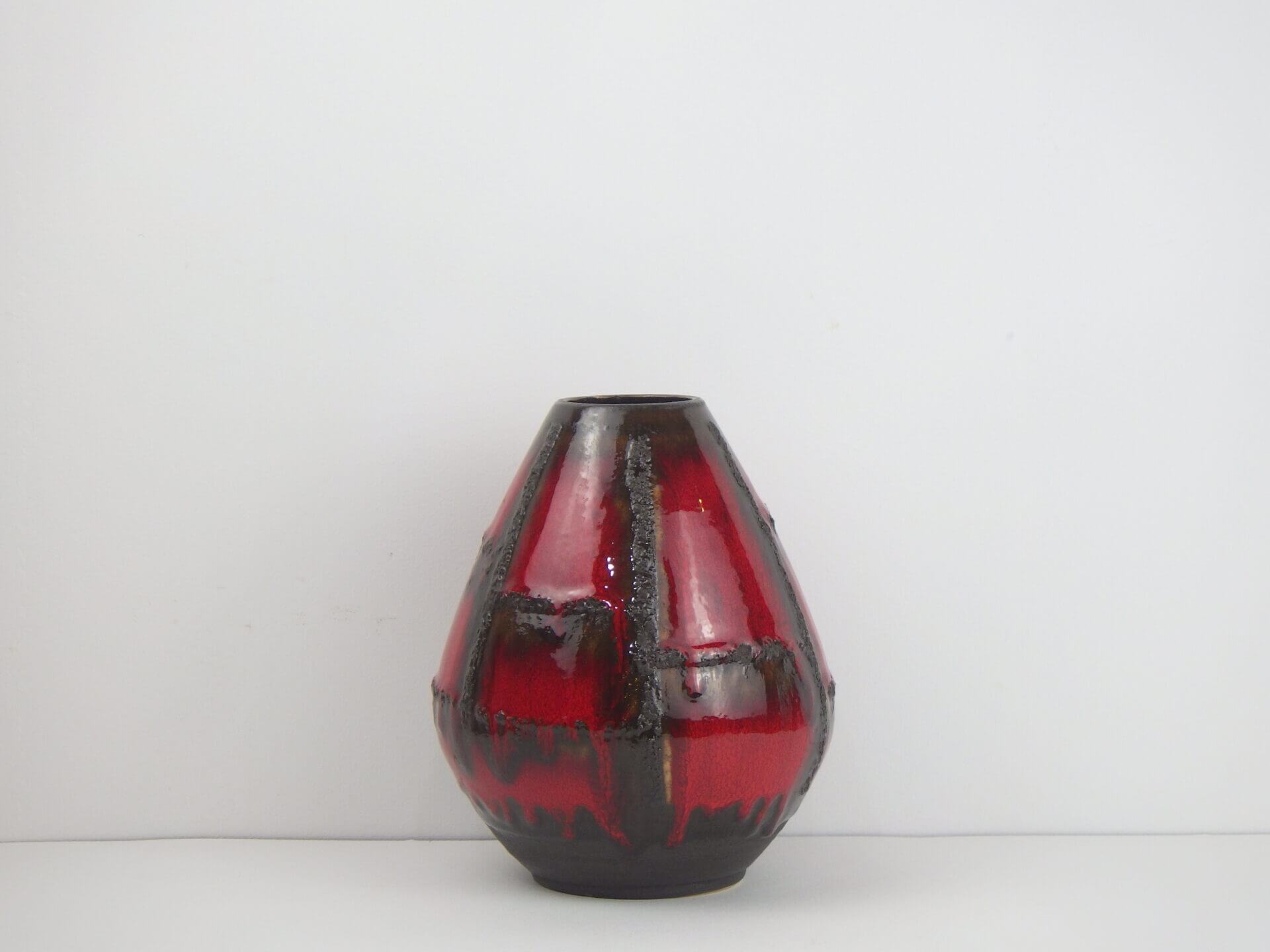 | 1950年~70年代に主に旧西ドイツで作られた「Fat Lava」と呼ばれるビンテージ花器です。 Fat Lavaは肥えた溶岩を意味し、流れ出る溶岩のような表情、色合い、ゴツゴツとした溶岩石のようなテクスチャーのものが多く存在します。 この時代のドイツ製陶器の多くは、職人による手作業で製作されていた為、全く同じものが他に存在しないところも魅力の一つかもしれません。 近年では日本でもコレクターズアイテムとして注目されています。 ミッドセンチュリー家具とも相性抜群ですね。 こちらは赤ベースに黒くゴツゴツしたテクスチャーがいかにも溶岩らしい、力強い一品ですね。 |