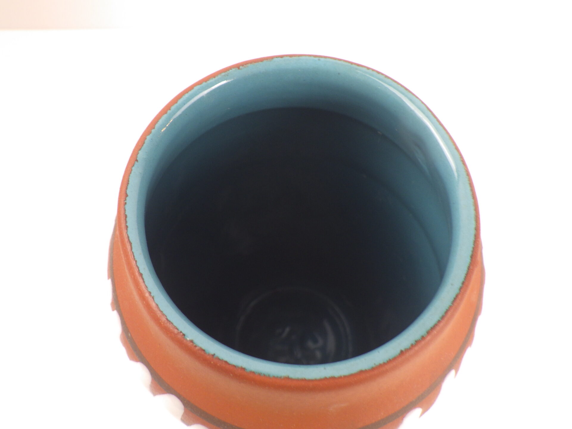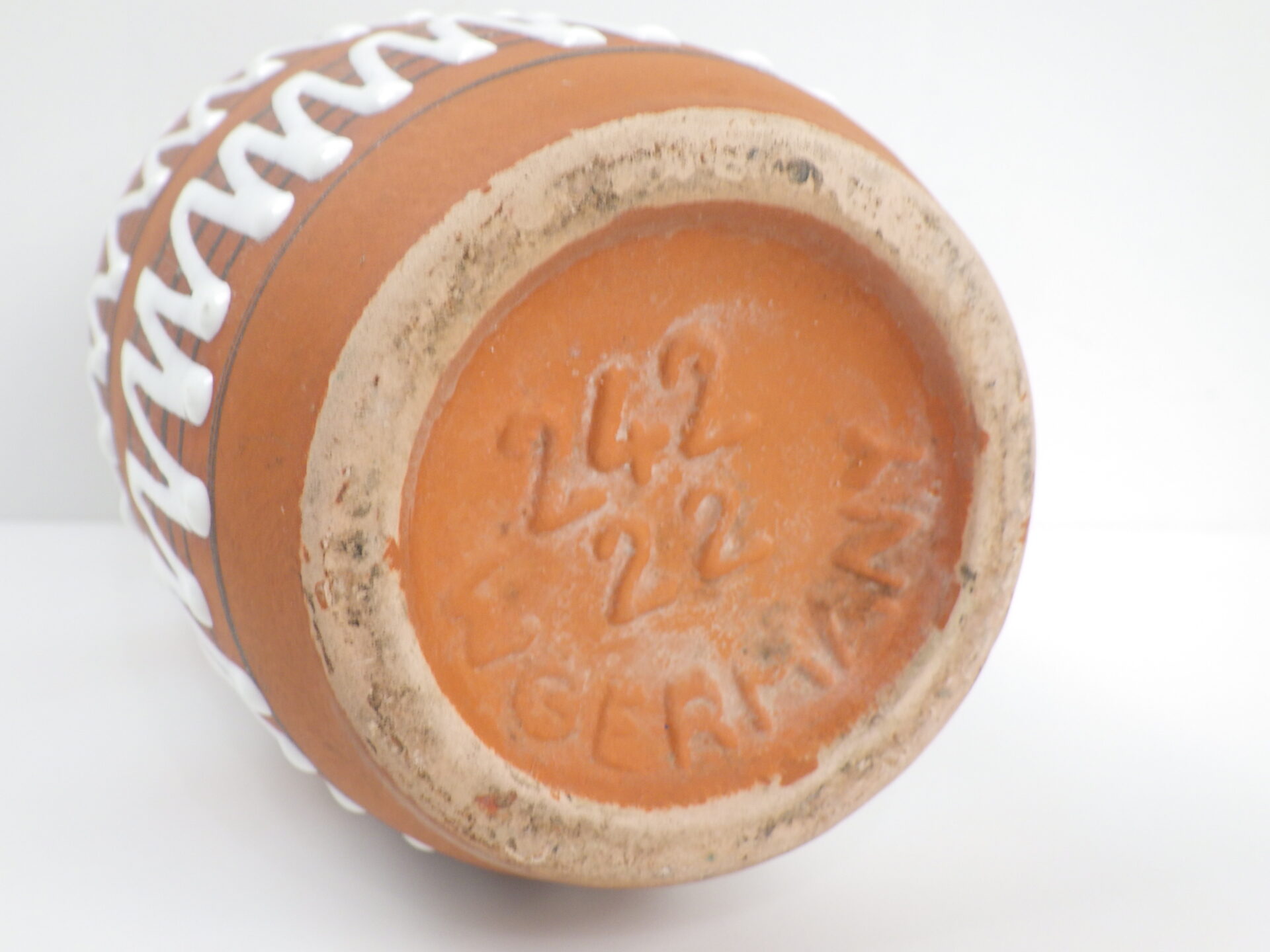 | ヨーロッパで買い付けました。 ジャーマン・アートポタリーと呼ばれるこの時代の陶器は、多くが職人による手作業で製作されており、同じシリーズでも一つとして同じ表情の物が存在しません。 こちらはざらつきのある赤茶色のテクスチャーに、ツヤのあるホワイトでジグザグ模様が描かれています。 何だか壺のような印象を与えるアイテムですが、内部は鮮やかなブルーの釉薬で、可愛らしい印象も。 シルエットが美しいので、お花を飾らずともそのものがインテリアのアクセントとして活躍してくれそうです。 |