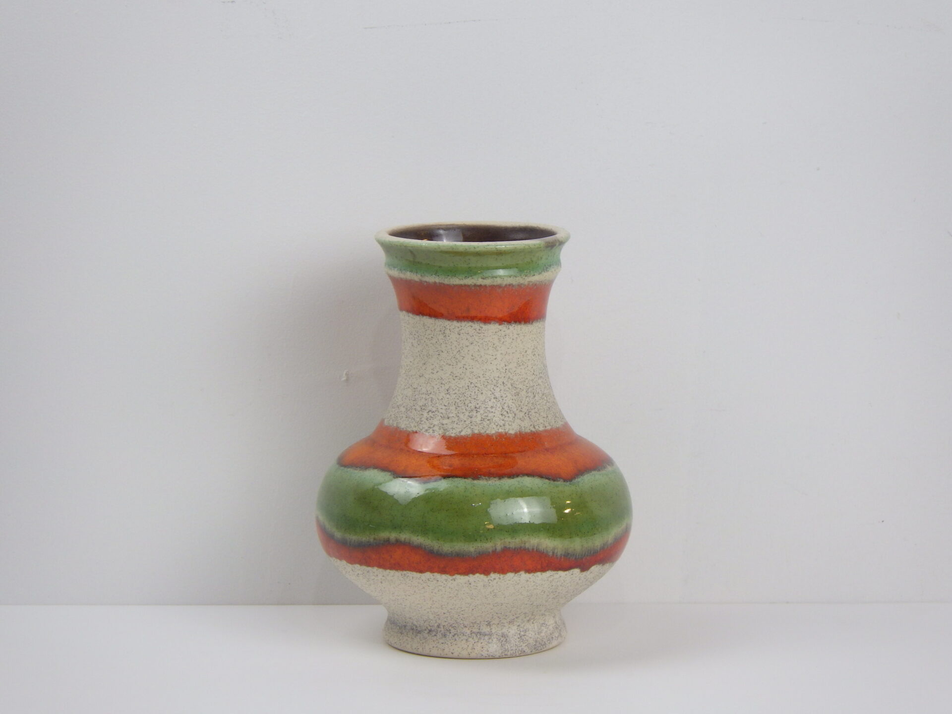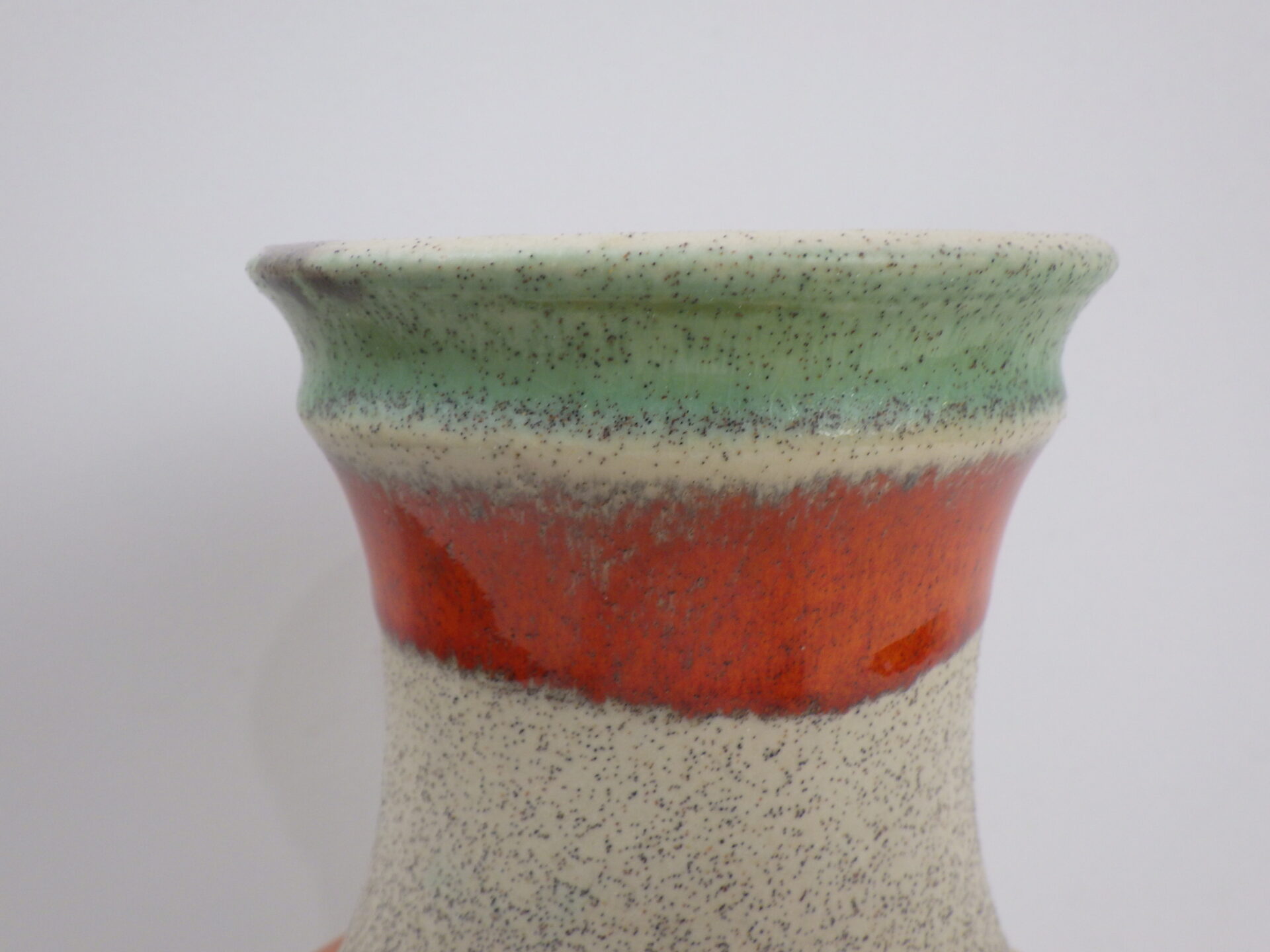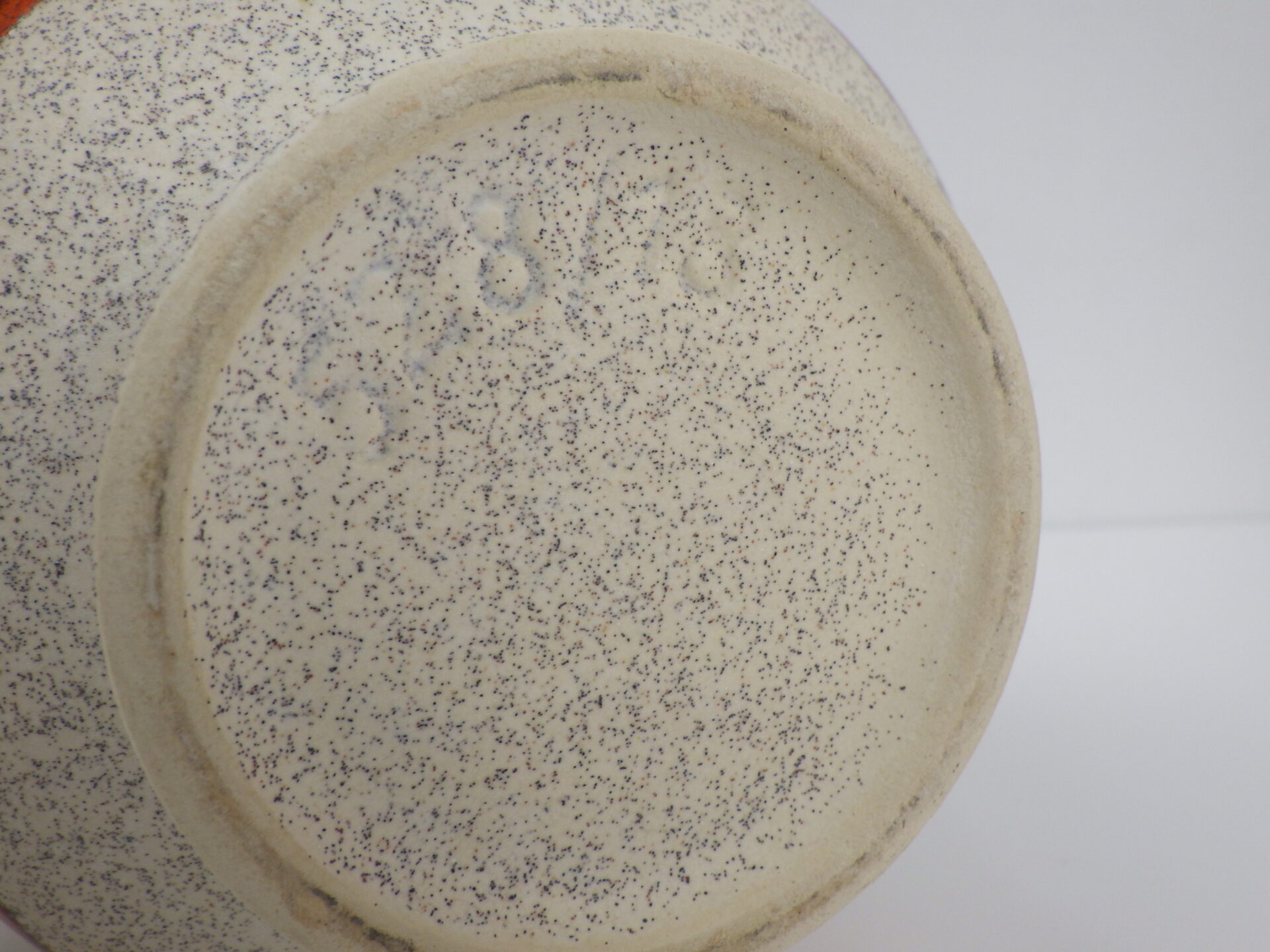 | ヨーロッパで買い付けました。 ジャーマン・アートポタリーと呼ばれるこの時代の陶器は、多くが職人による手作業で製作されており、同じシリーズでも一つとして同じ表情の物が存在しません。 こちらは種類やカラーが豊富で、70年代にドイツ国内で最大手に躍進したScheurich製です。 砂のように細かい粒子状の模様が入ったホワイトアイボリー地に、鮮やかなオレンジとグリーンの釉薬が美しいコントラストを描いています。 インテリアのアクセントにいかがですか? |