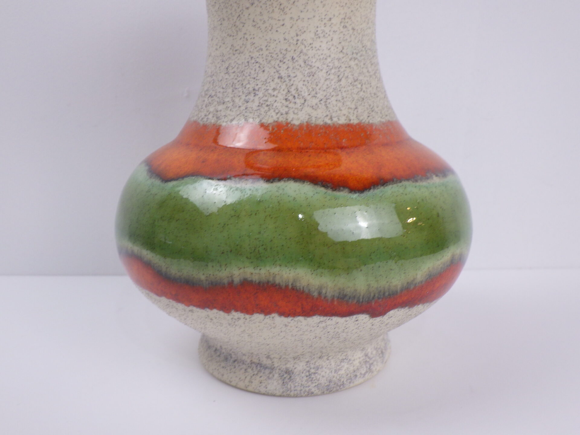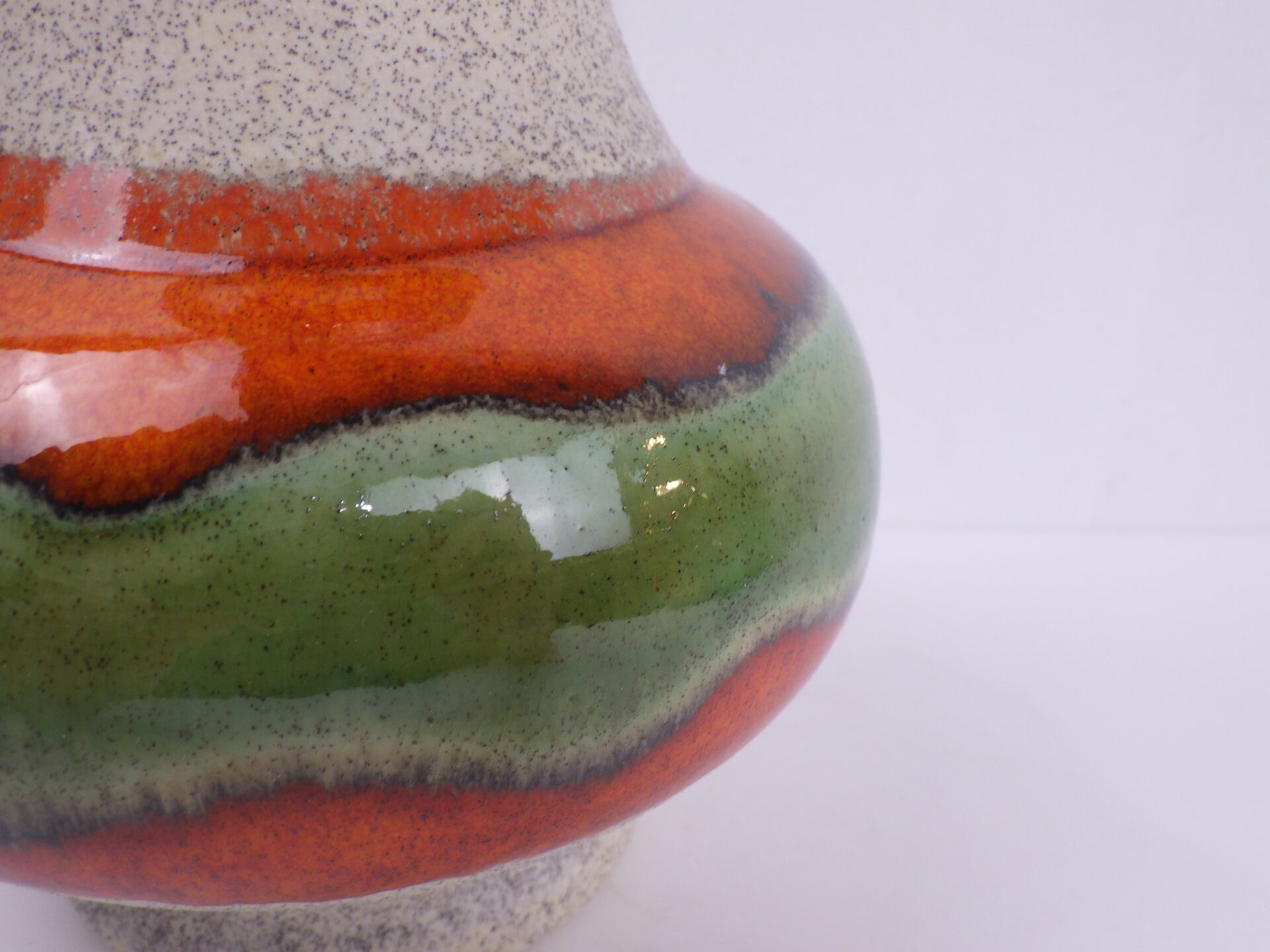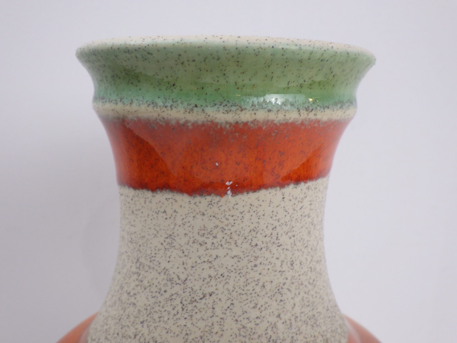 | ヨーロッパで買い付けました。 ジャーマン・アートポタリーと呼ばれるこの時代の陶器は、多くが職人による手作業で製作されており、同じシリーズでも一つとして同じ表情の物が存在しません。 こちらは種類やカラーが豊富で、70年代にドイツ国内で最大手に躍進したScheurich製です。 砂のように細かい粒子状の模様が入ったホワイトアイボリー地に、鮮やかなオレンジとグリーンの釉薬が美しいコントラストを描いています。 インテリアのアクセントにいかがですか? |