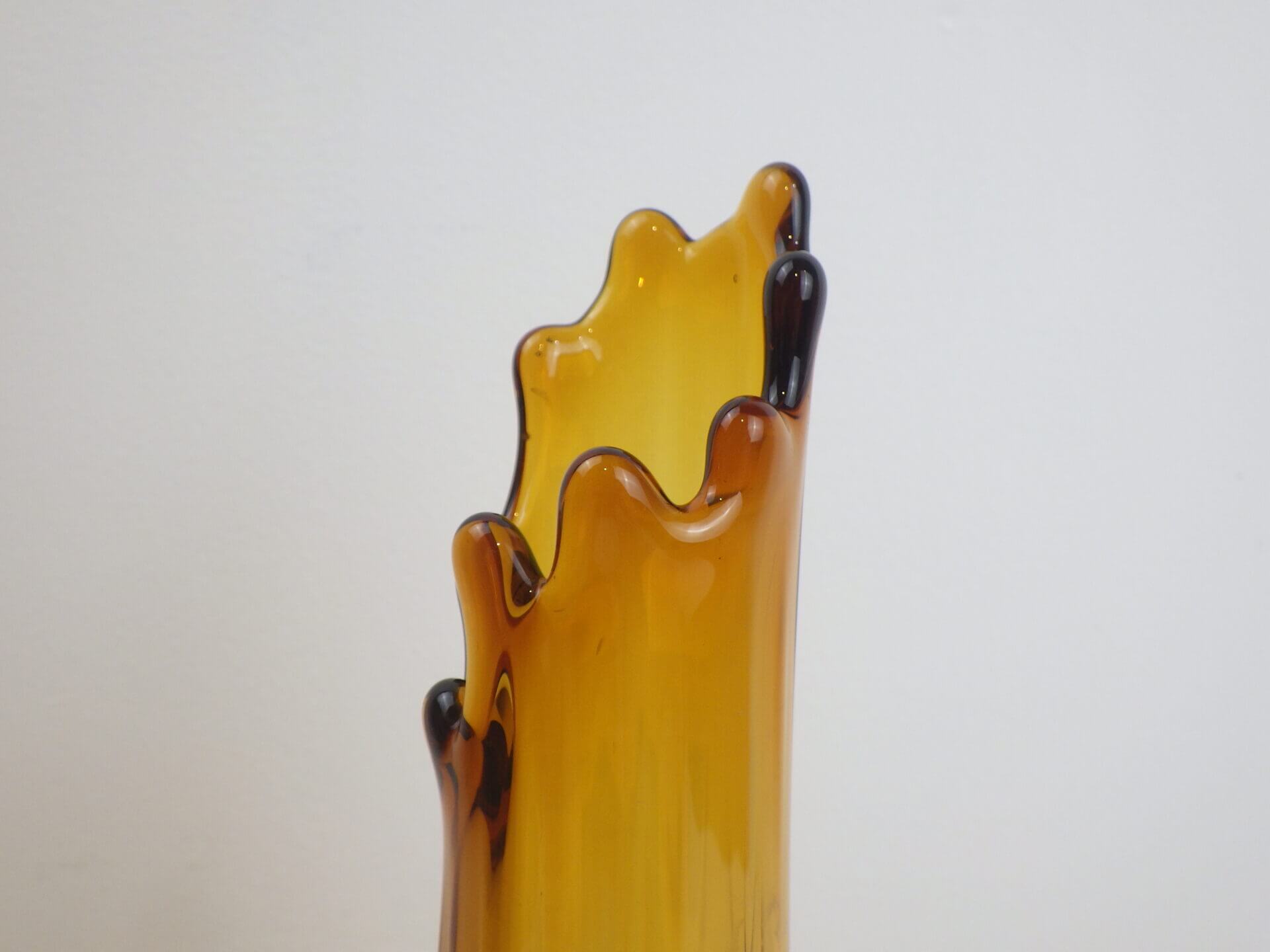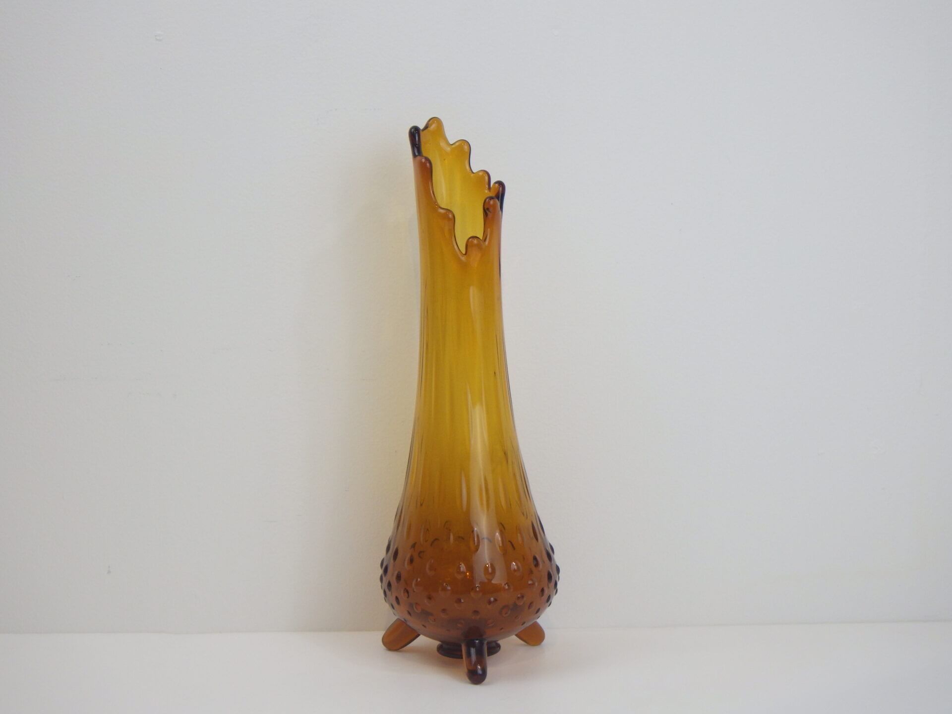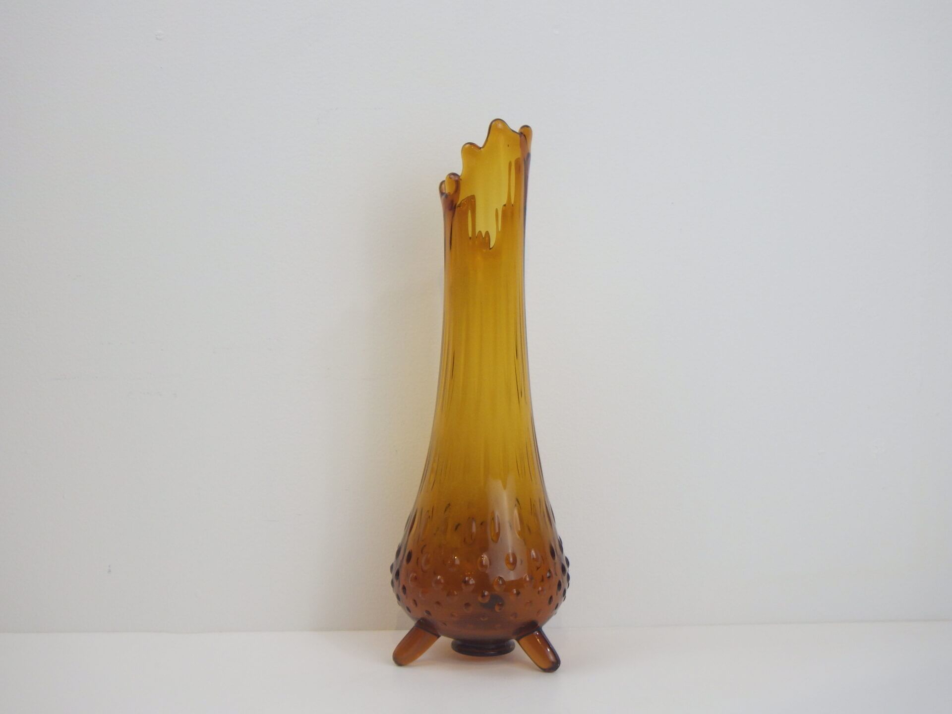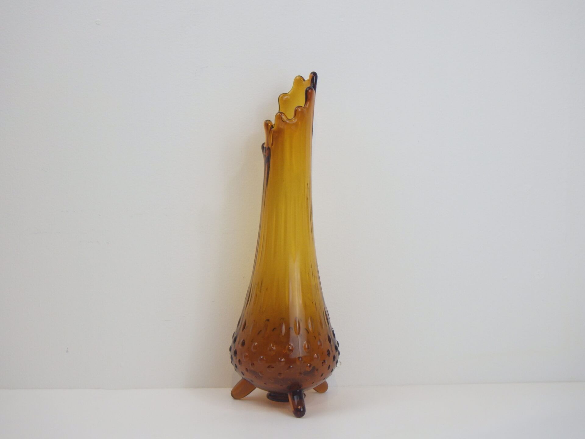 | アメリカで買い付けました。 1907年にペンシルベニア州で設立されたガラスメーカー「L.E.Smith Glass Company」のビンテージのフラワーベースです。 口部分は波打つような形状をしています。 側面は全体にエンボス加工が施されており、見る角度によって光の入り方が変わり、ライトアンバーに見えたり深いアンバーに見えたりと表情を変えます。 脚付きなのが嬉しいですね。 実用性もありますが、アートとして、インテリアのアクセントとしても活躍してくれそうです。 |