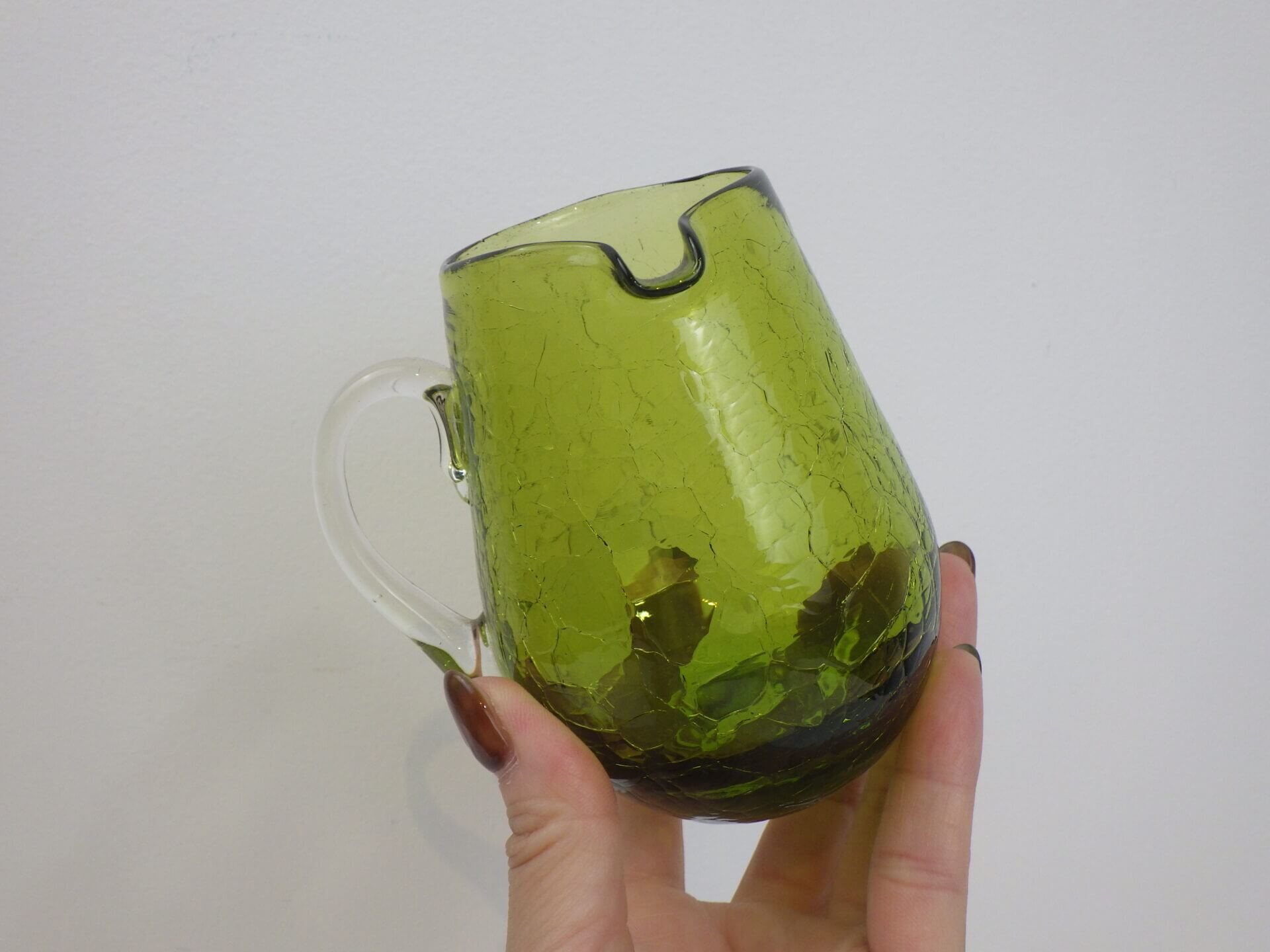 - Vintage Hand Blown Crackle Glass Pitcher Creamer/Vase(H9cm)ビンテージ 貫入ガラス ピッチャー フラワーベース 花瓶 オリーブグリーン N
