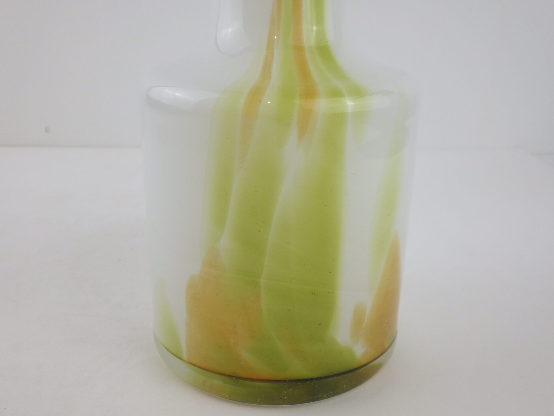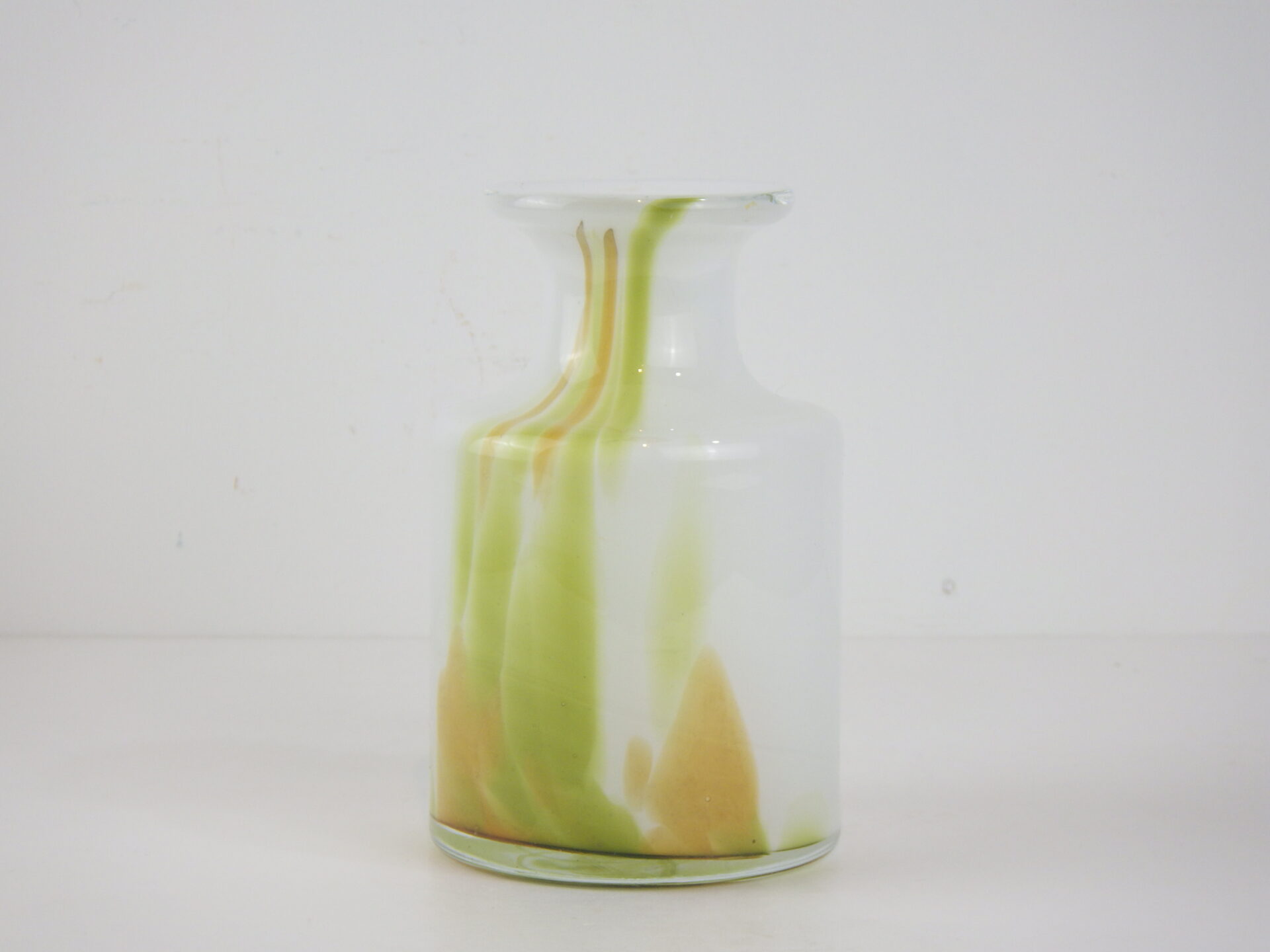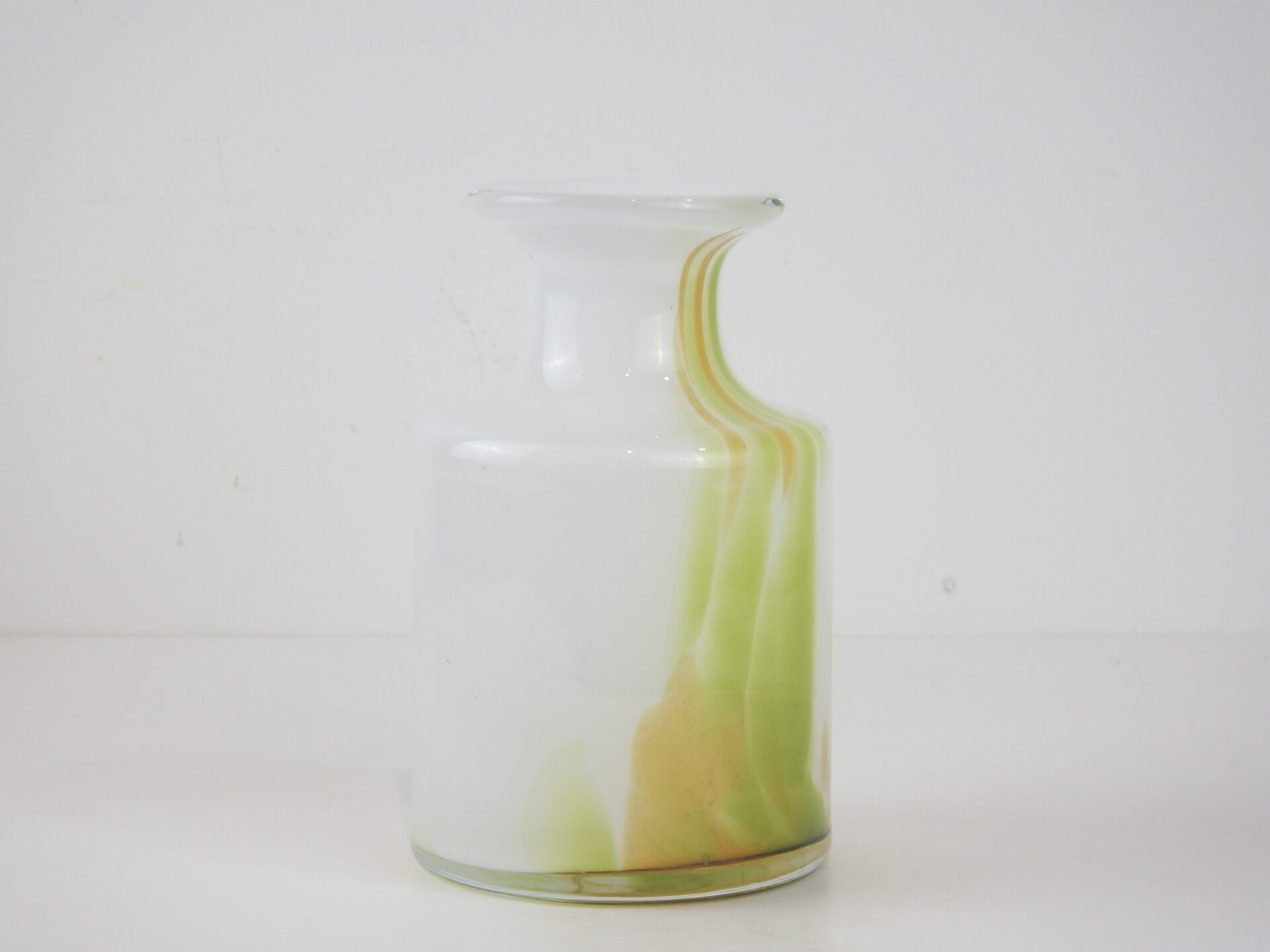 | ヨーロッパで買い付けました。 デンマーク王室御用達、Holmegaardのフラワーベースです。 デザイナーはアートディレクターとして活躍したPer Lukten。 乳白色のベースにピスタチオとオーカーカラーが流れるように配色された、美しいアイテムです。 手吹きガラスならではの一点物の味わいを存分に楽しめるのも、魅力の一つですね。 |