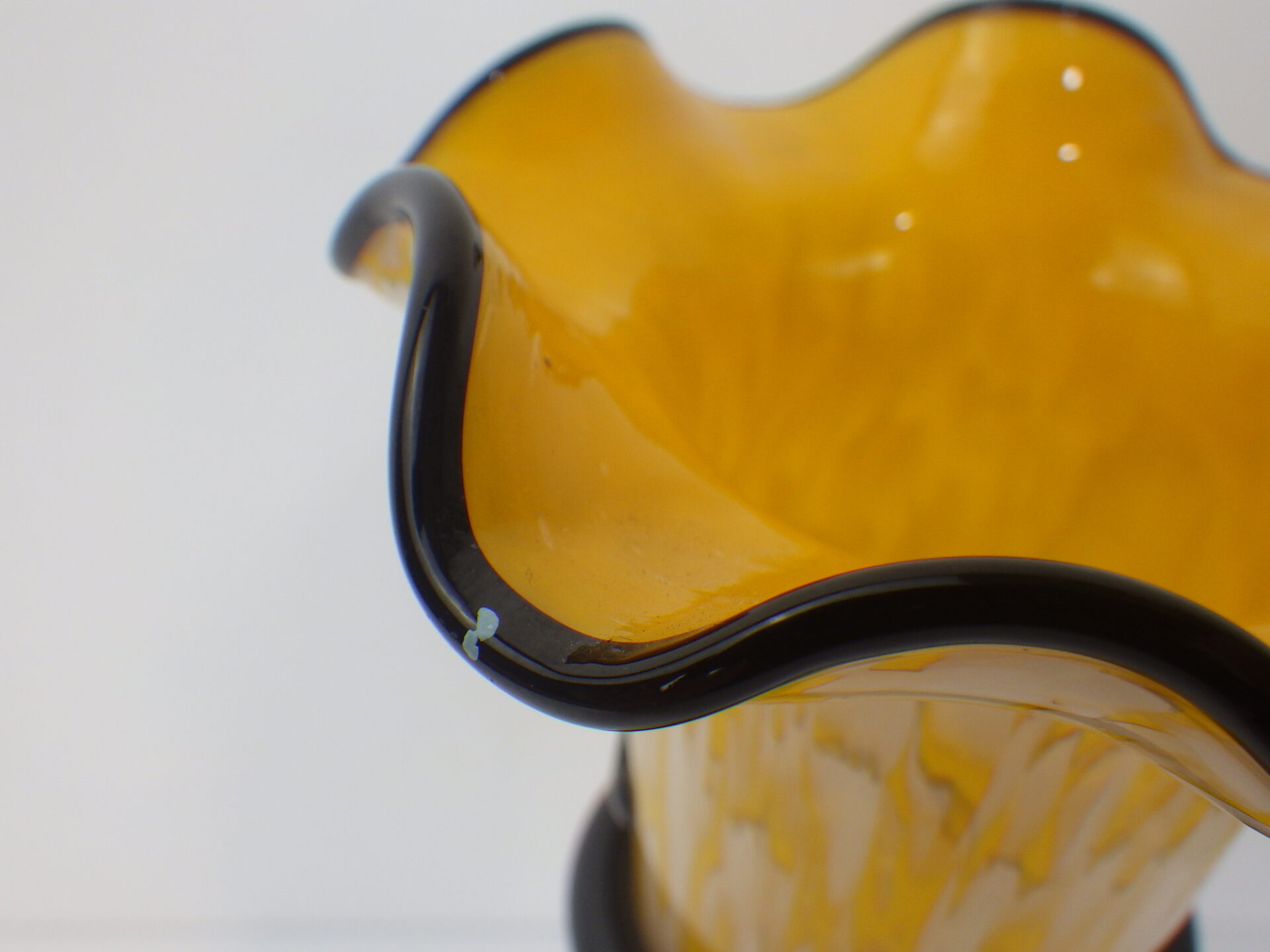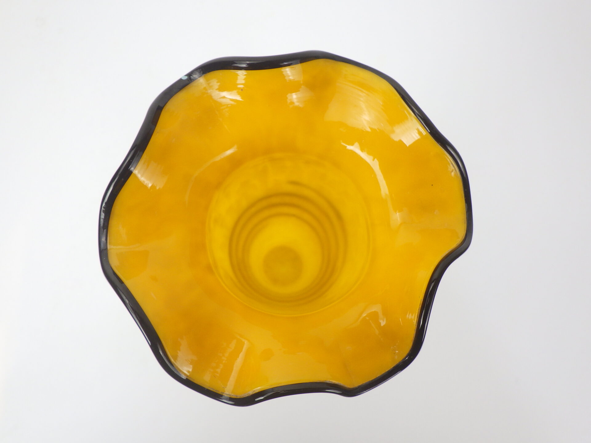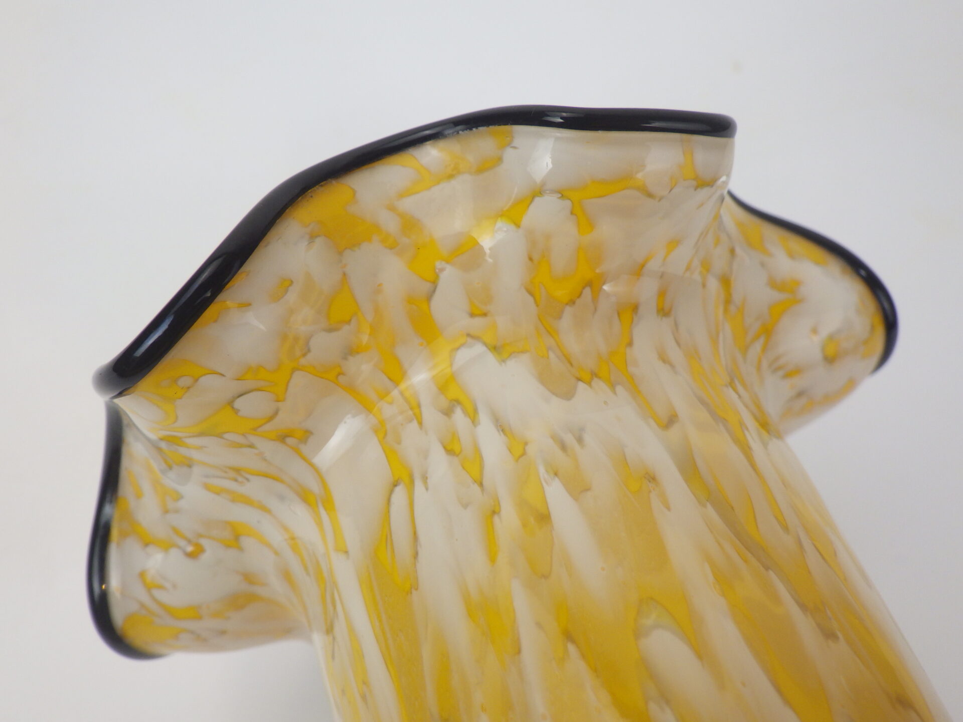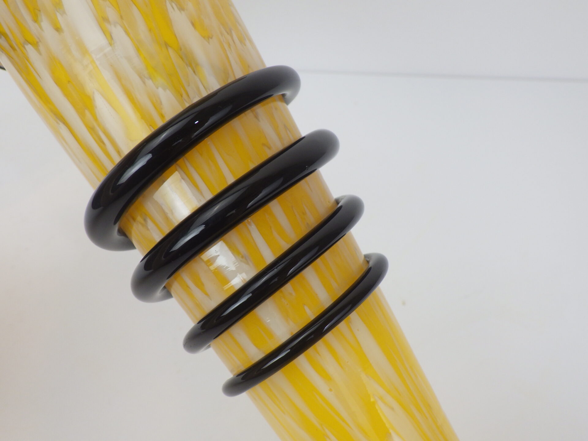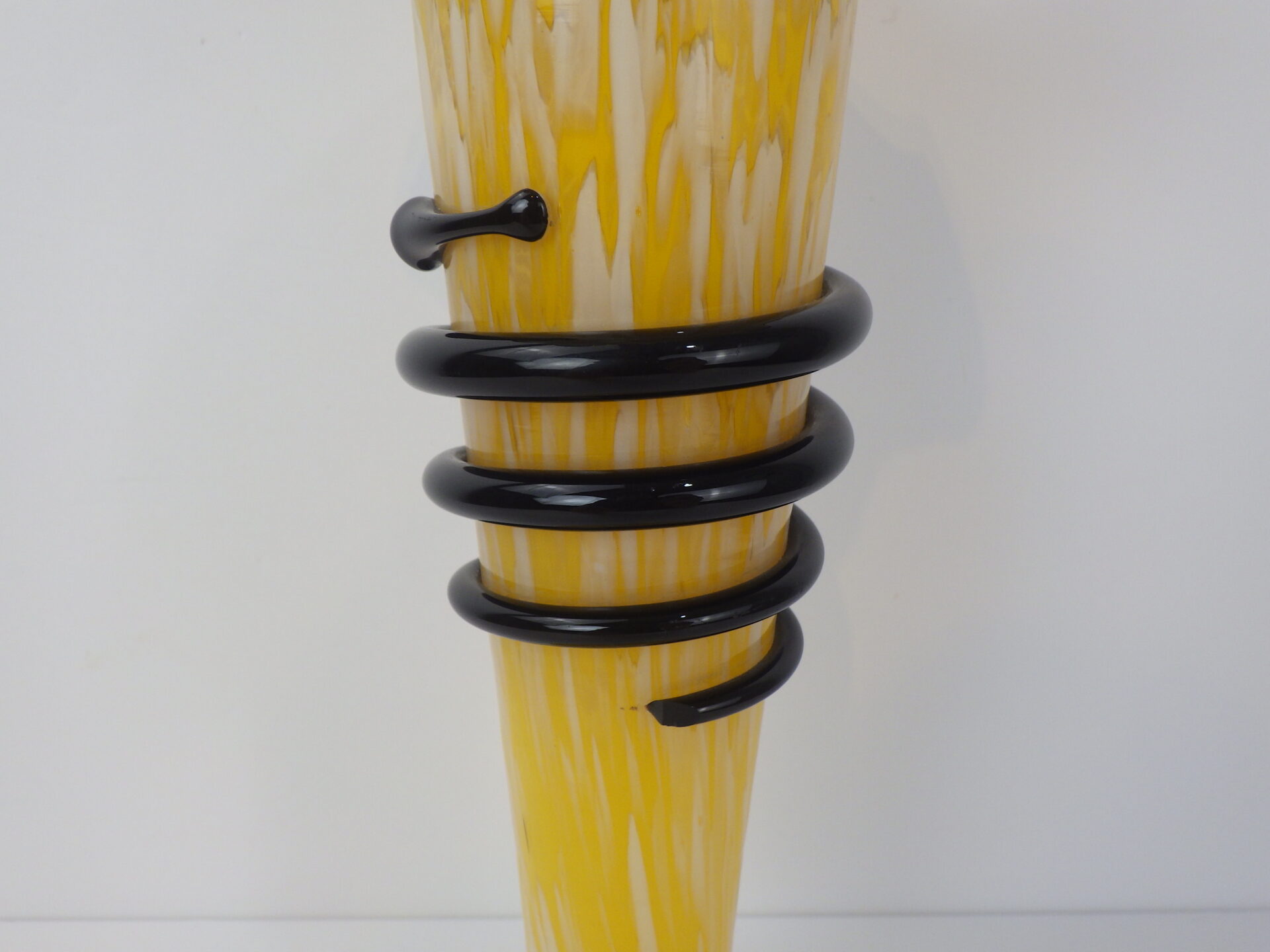 | アメリカで買い付けました。 ガラスのフラワーベースです。 イエロー地にホワイトのマーブル模様が入ったベースと、ブラックのぐるぐるのコントラストがとても良い雰囲気。 お花を飾らなくても、これだけで空間の良いアクセントになってくれそうです。 |