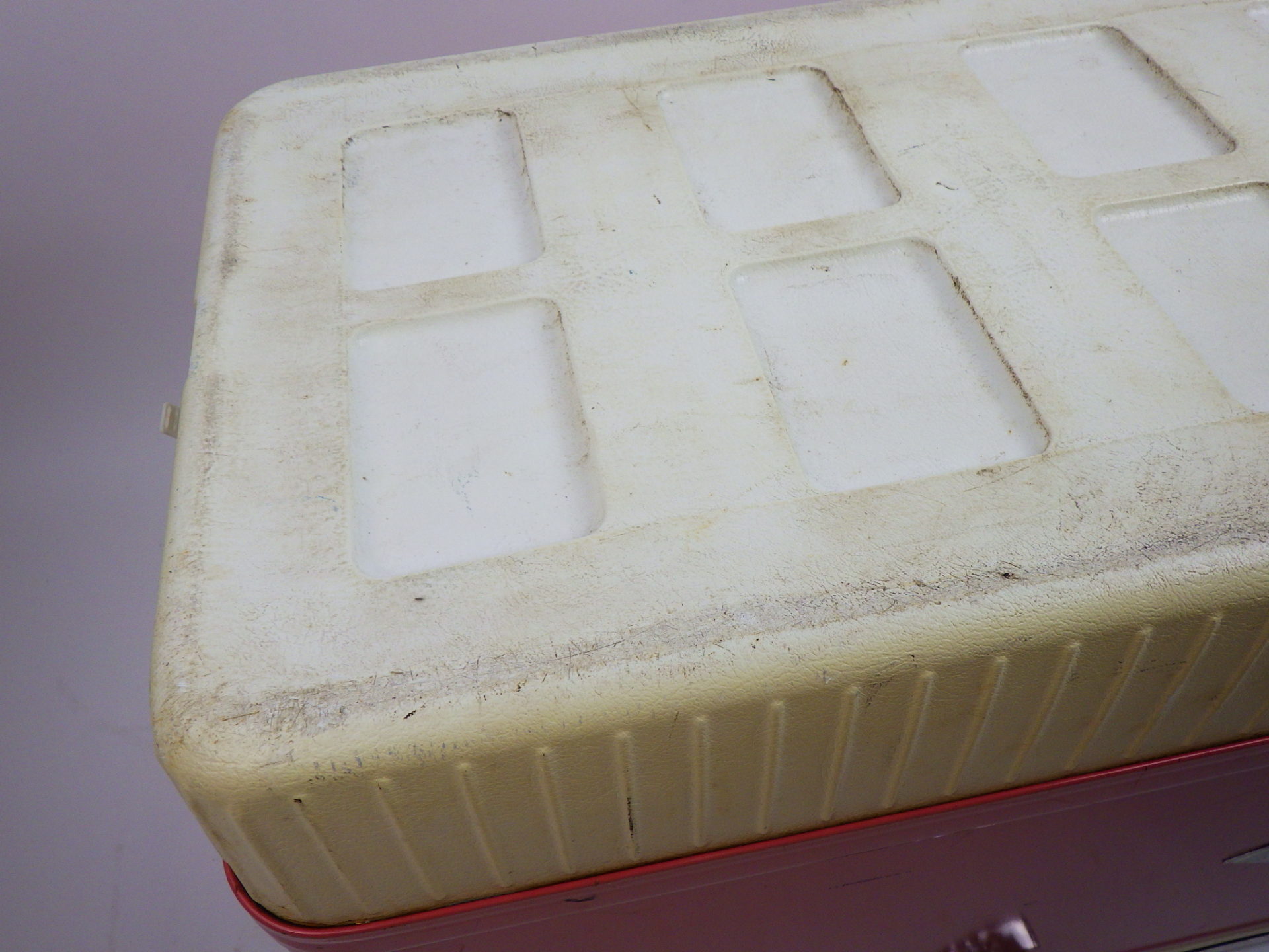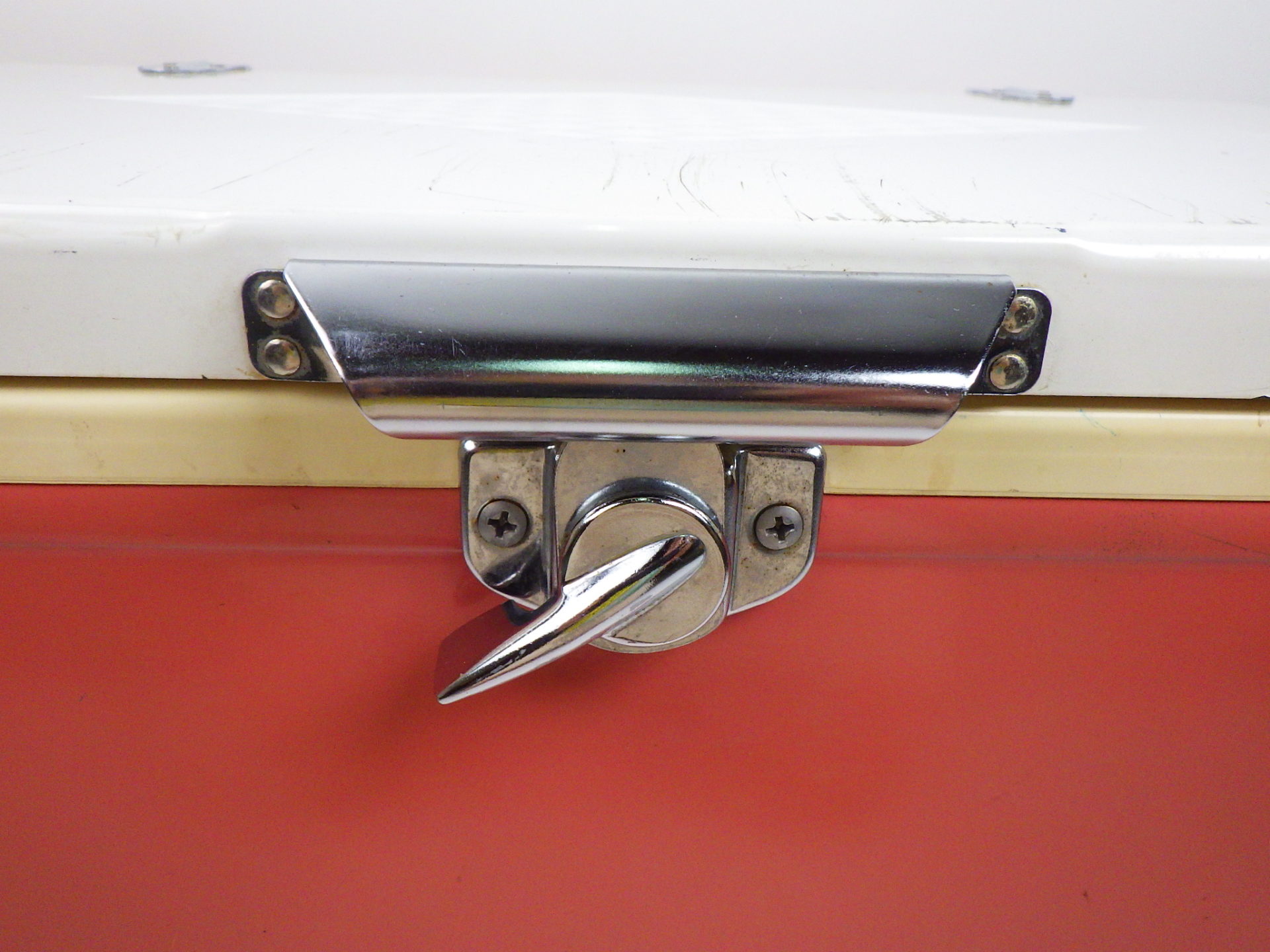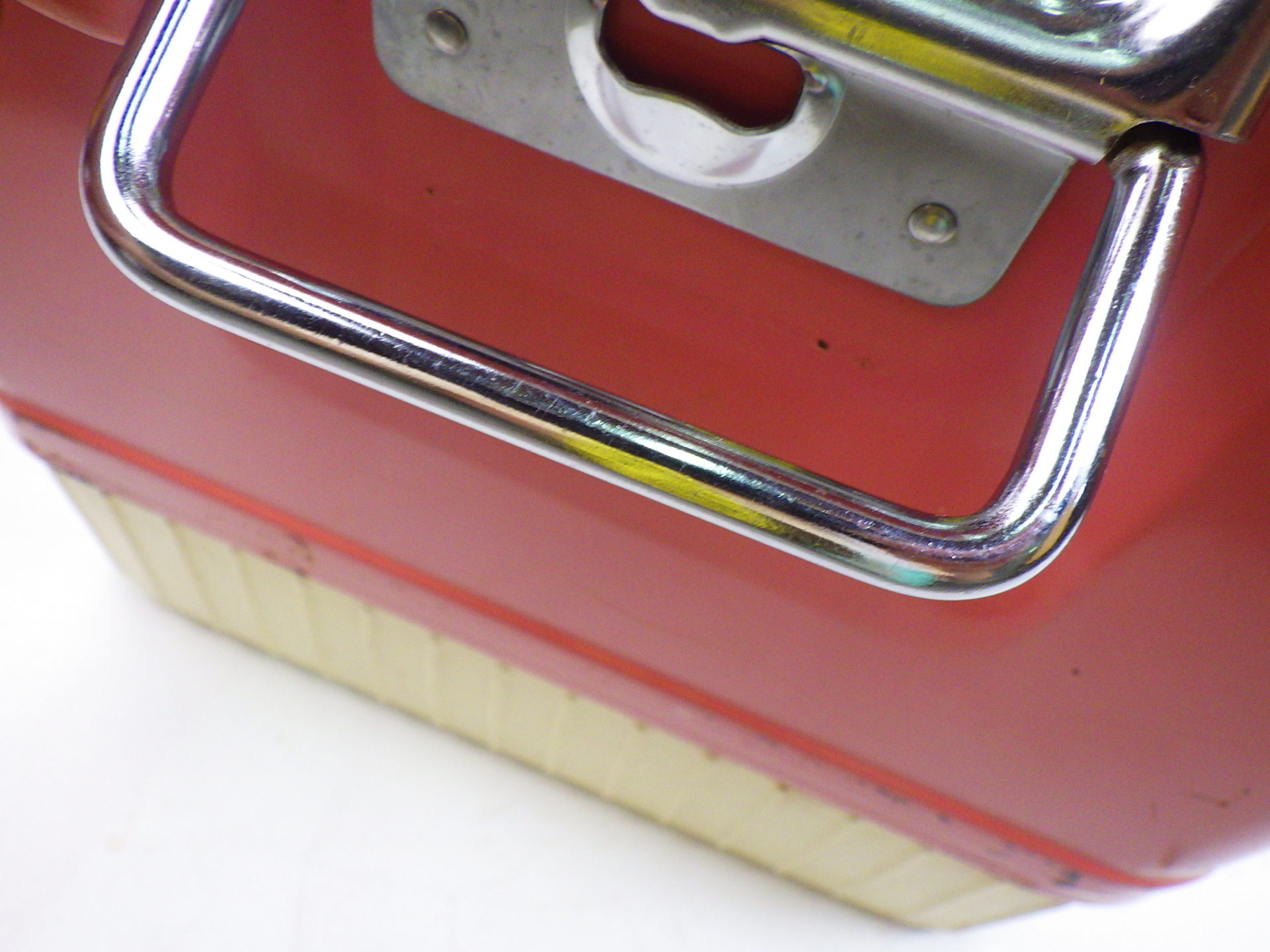 | アメリカで買い付けたコールマンのビンテージクーラーボックスです。 1960's~70's頃に製造されたクーラーボックスやジャグについている「ダイヤロゴ」が格好良いアイテムです。 また、持ち手部分には栓抜きが備えられていますよ。当時栓抜きを必要とした飲み物が多かった事が伺えますね。 |