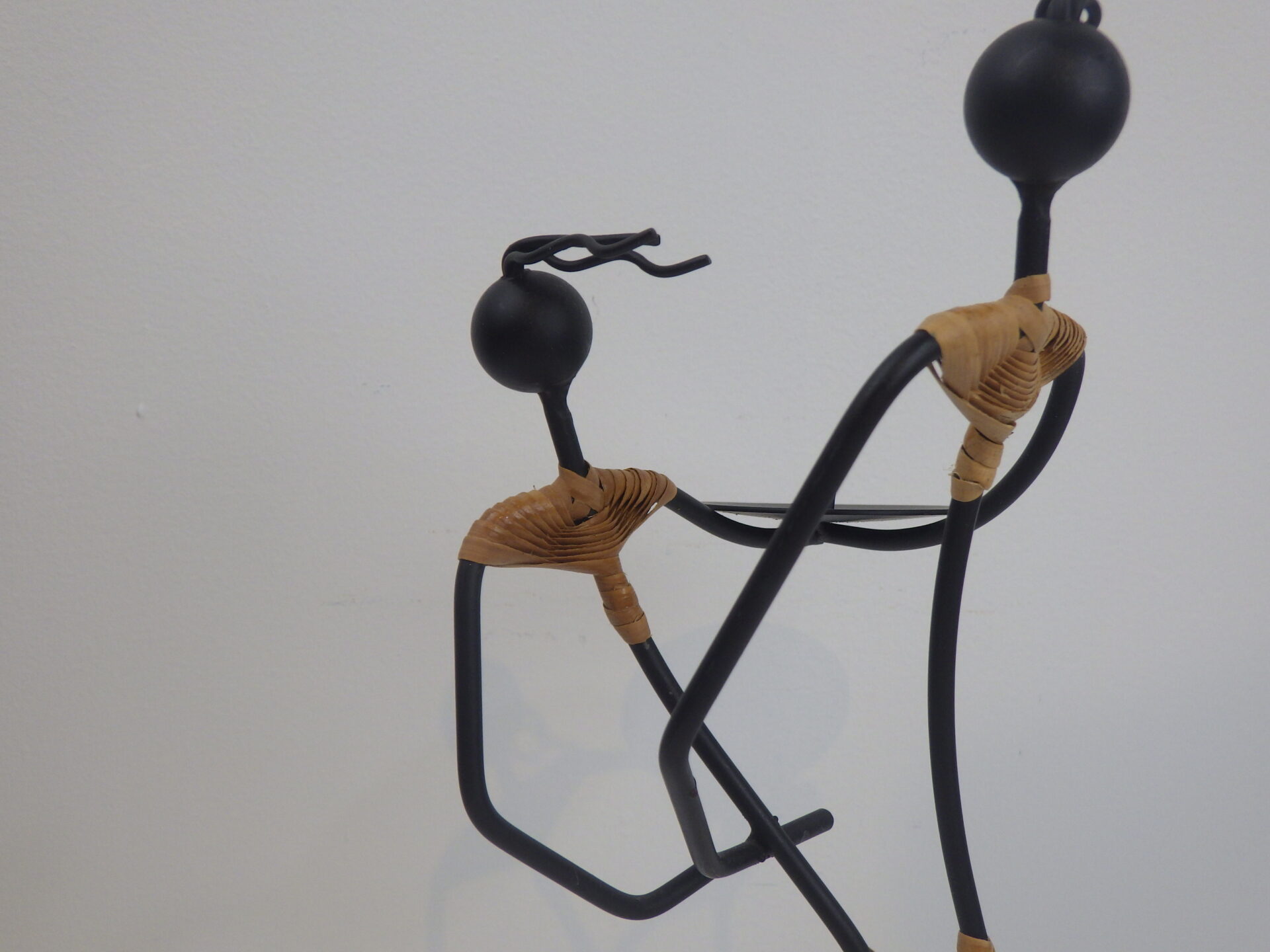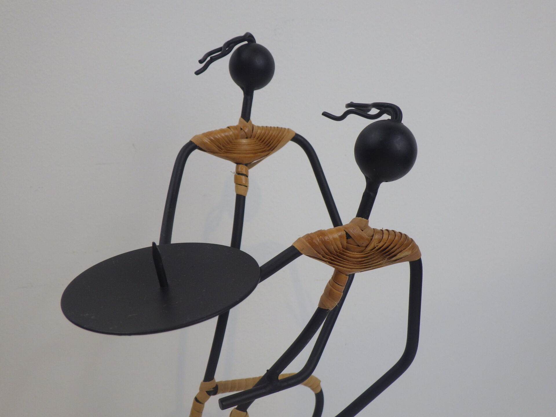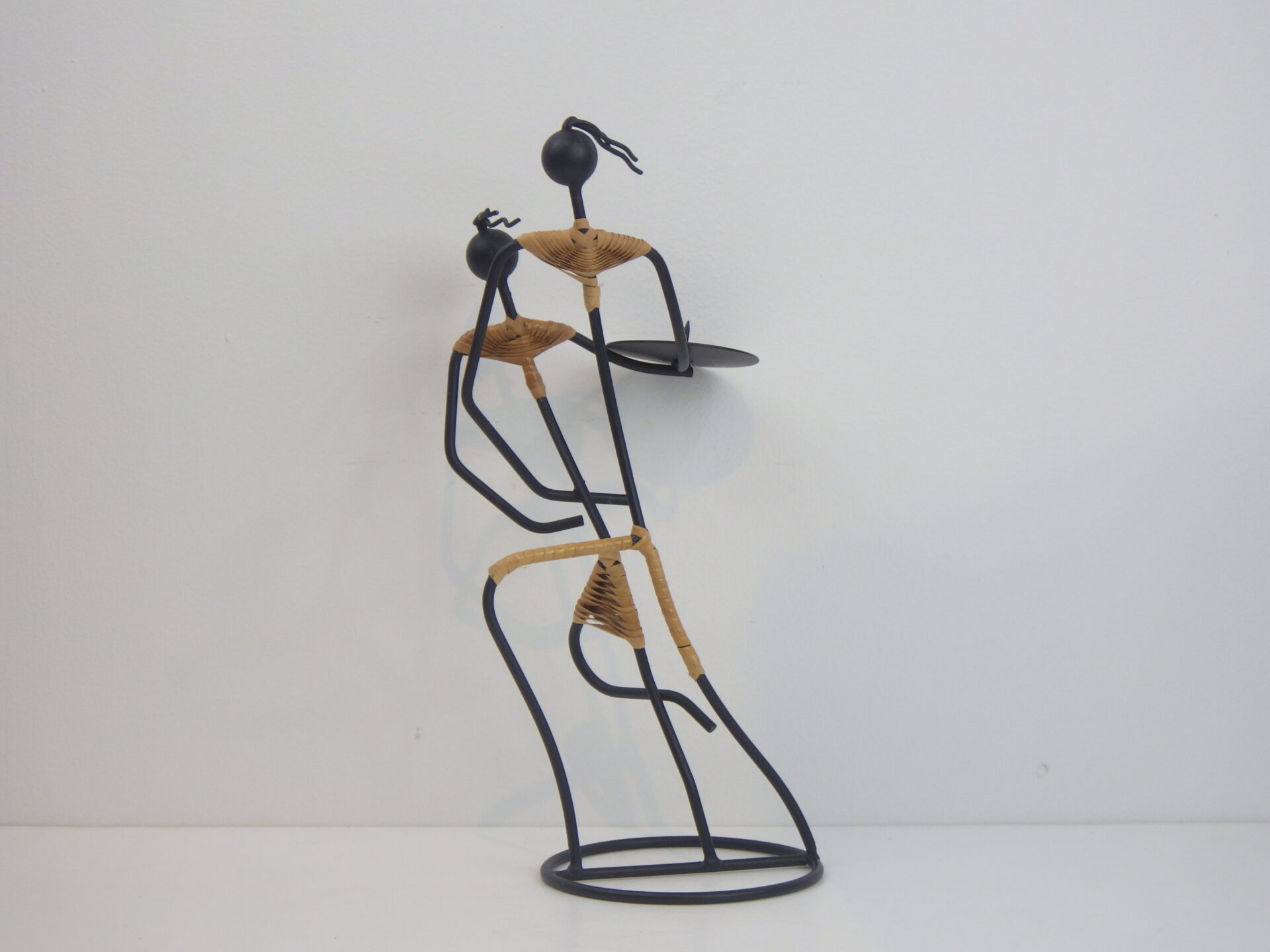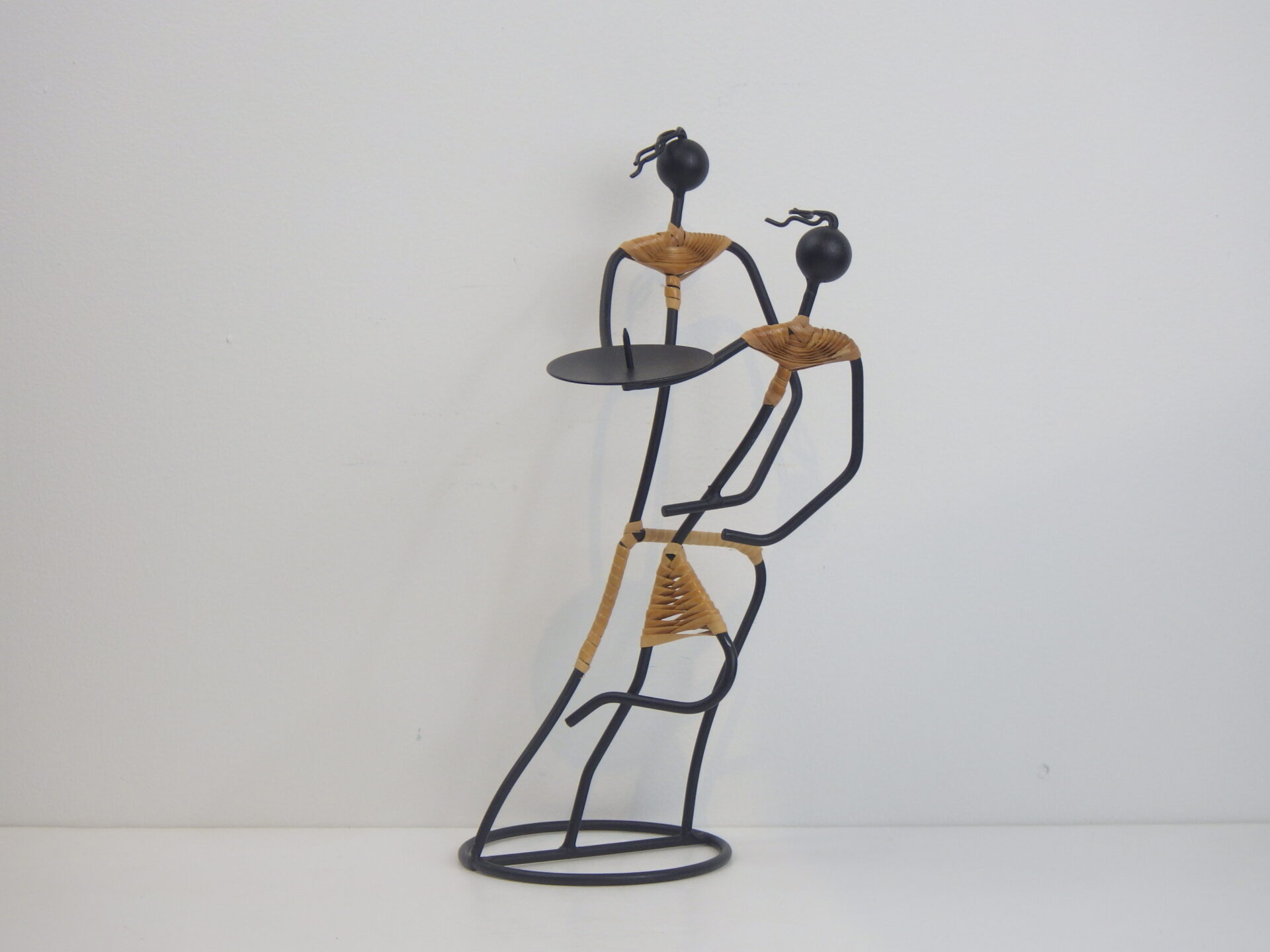 | アメリカで買い付けました。 ビンテージのキャンドルホルダーです。 本体は鉄製で、衣装は竹で出来ています。 エスニックな雰囲気がたまりません。 男女でペアになり、踊りを踊っているようです。 なびく髪が、躍動感を表していますね。 片側に傾いたバランスになっていますが、キャンドルを設置することでバランスが取れる構造になっています。 (キャンドルがなくても自立はします) |