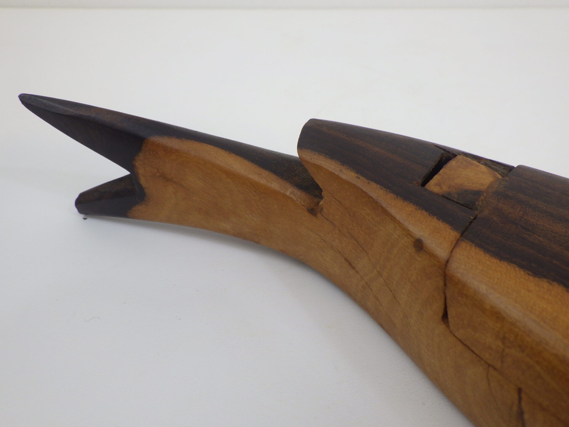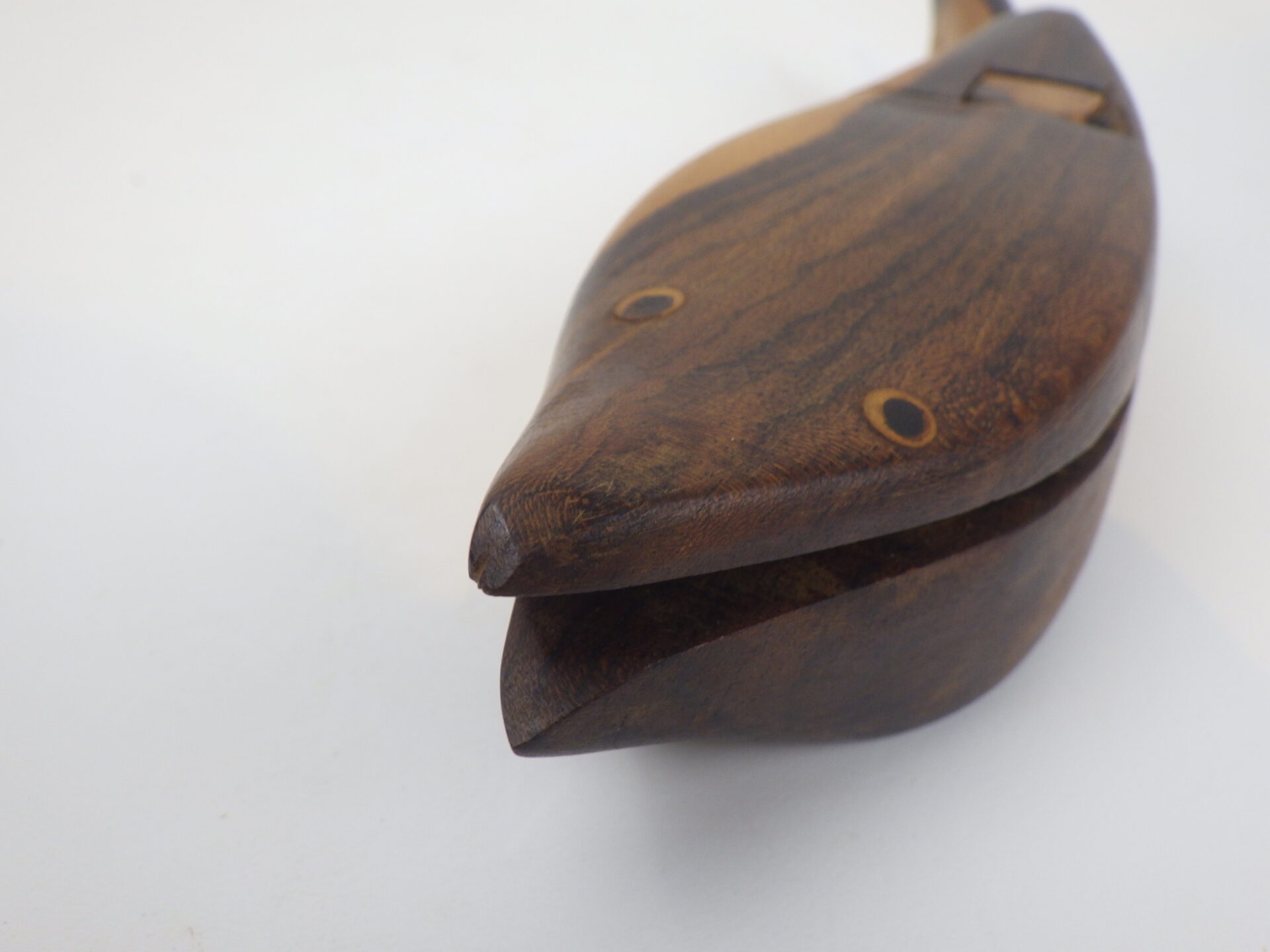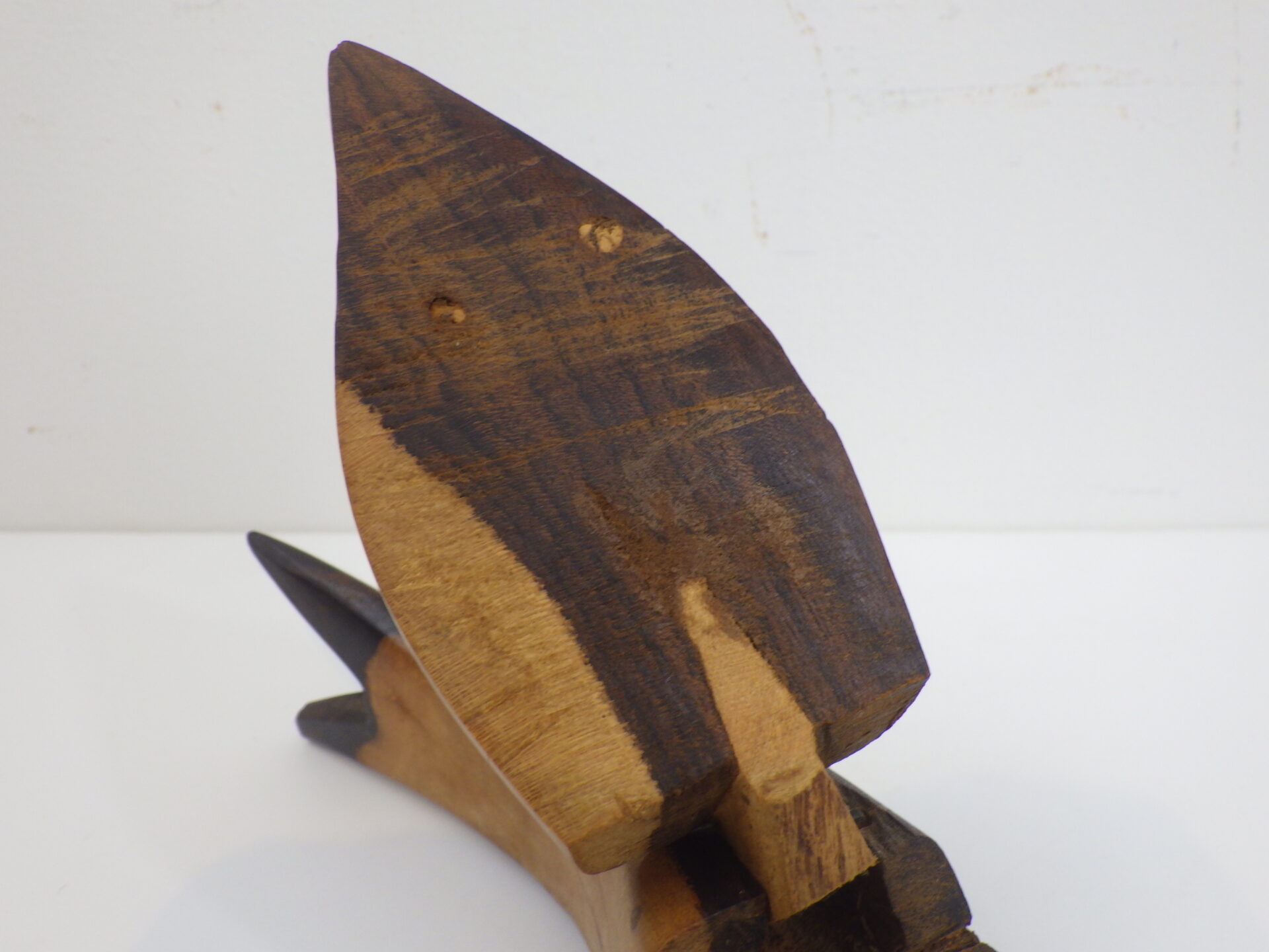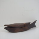 | アメリカで買い付けました。 クジラのように口を大きく開くと内側が受け皿になっている木製オブジェです。 口の開きはクジラのようですが、尾ひれは魚のよう。 つぶらな瞳が可愛らしいです。 元は灰皿、もしくは小物入れとして作られたのでしょうか? 木目を生かしたデザインが、あたたかみのある印象を与えてくれますね。 |