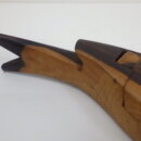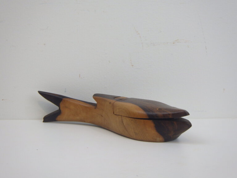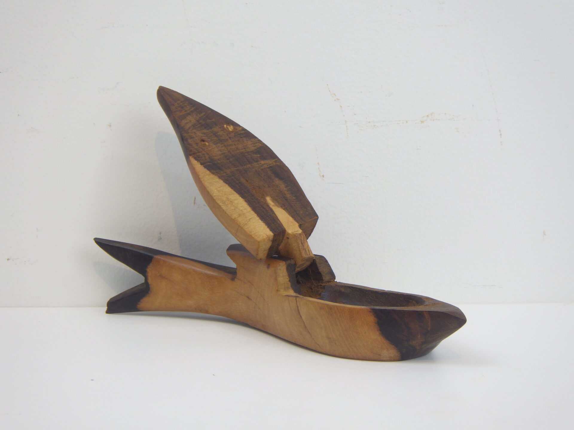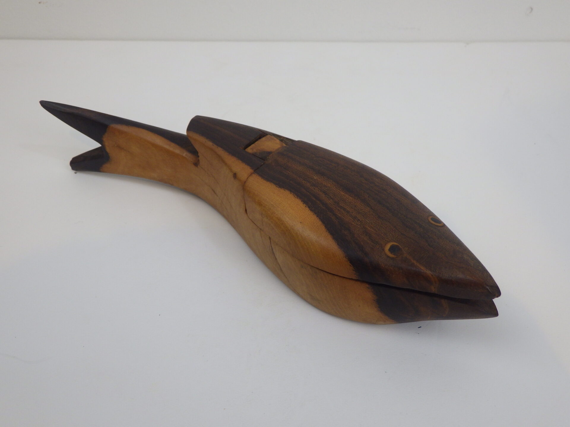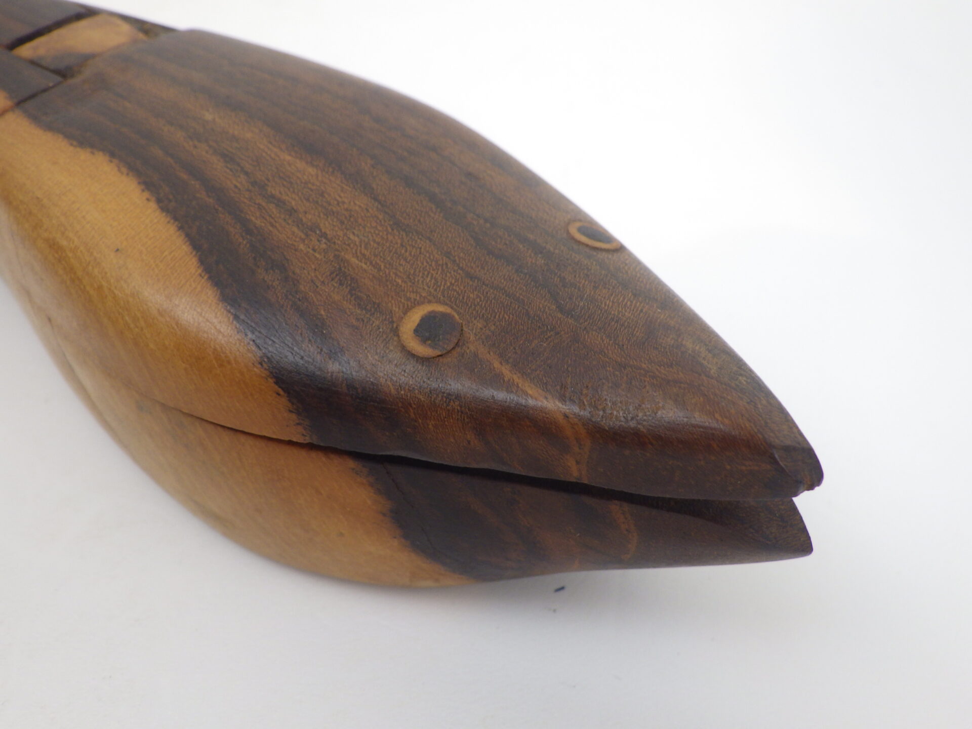 | アメリカで買い付けました。 クジラのように口を大きく開くと内側が受け皿になっている木製オブジェです。 口の開きはクジラのようですが、尾ひれは魚のよう。 つぶらな瞳が可愛らしいです。 元は灰皿、もしくは小物入れとして作られたのでしょうか? 木目を生かしたデザインが、あたたかみのある印象を与えてくれますね。 |