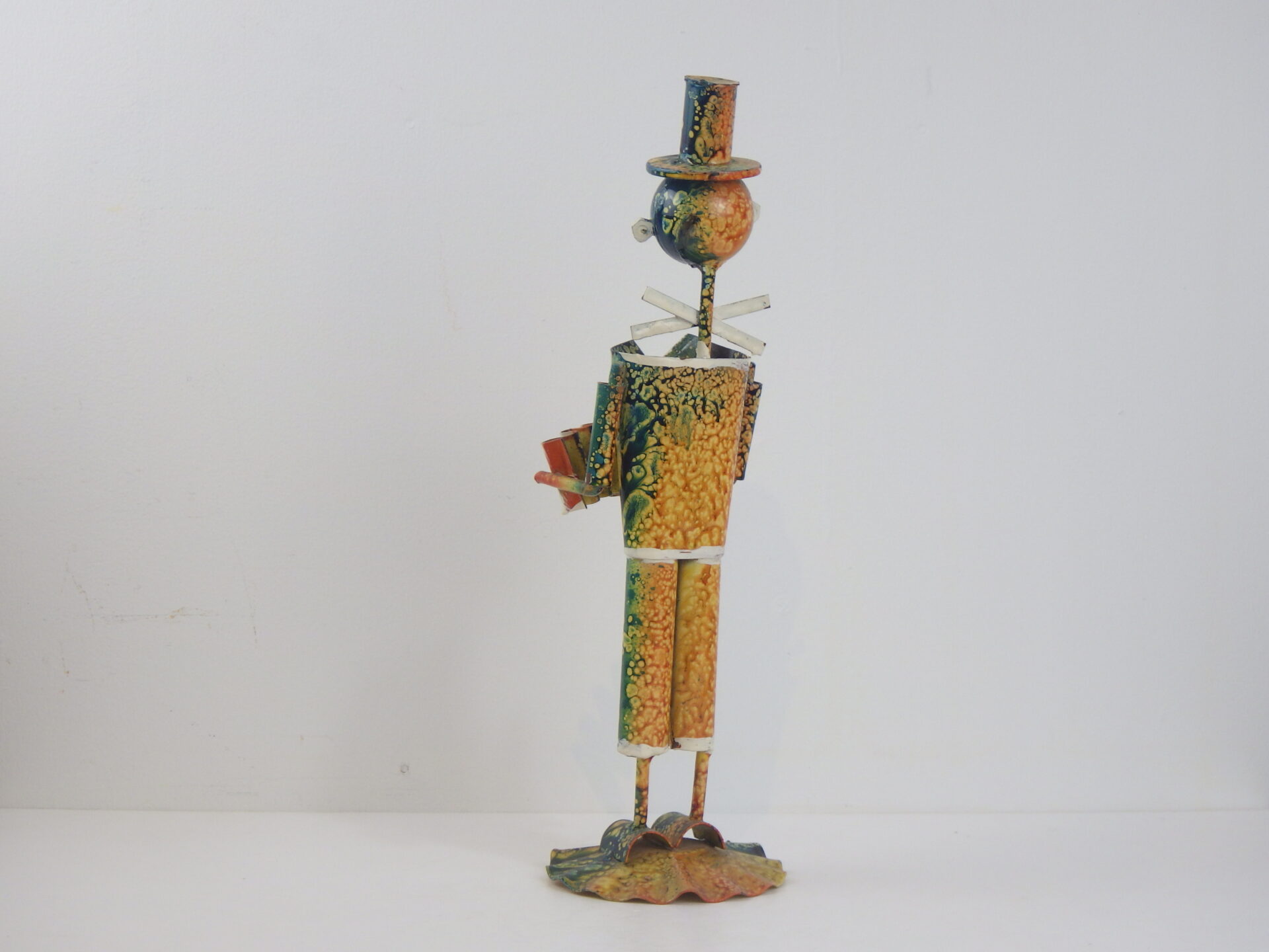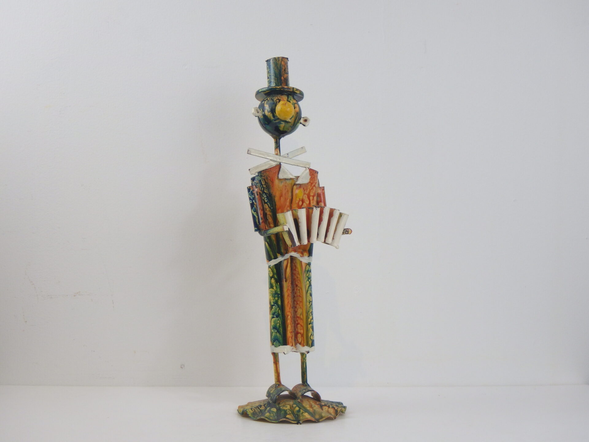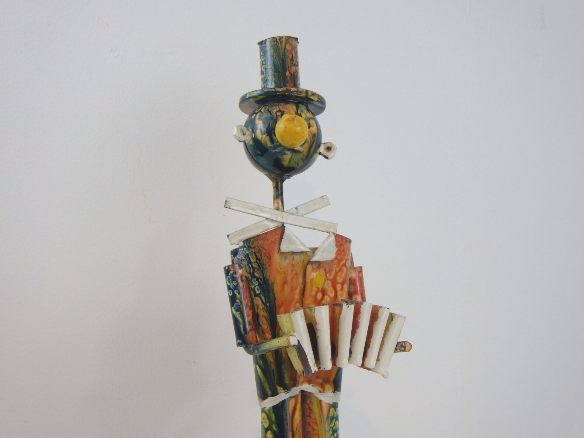 | アメリカで買い付けました。 ピエロのオブジェです。 手にしているのはアコーディオンでしょうか? カラフルなマーブリングが施されており、可愛らしい風貌と相まって良い雰囲気です。 |