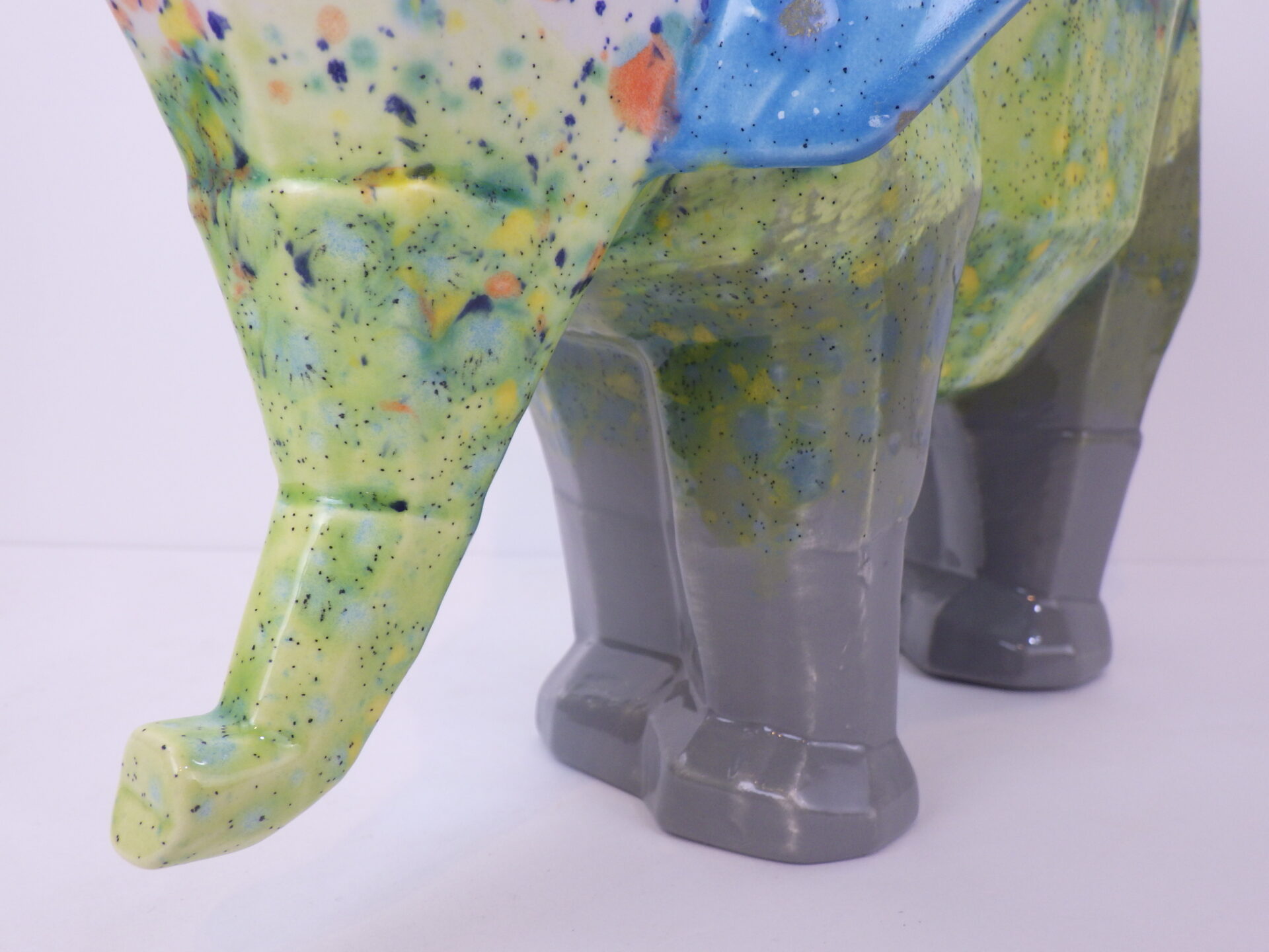 | アメリカで買い付けました。 陶器製の象のオブジェです。 切り子のようにカットされた面で造形されていますが、鮮やかで華やかなカラーリングのお陰か、無機質で冷たい印象はなく、まるでお花畑を散歩しているような、そんな風景が目に浮かぶアイテムです。 |