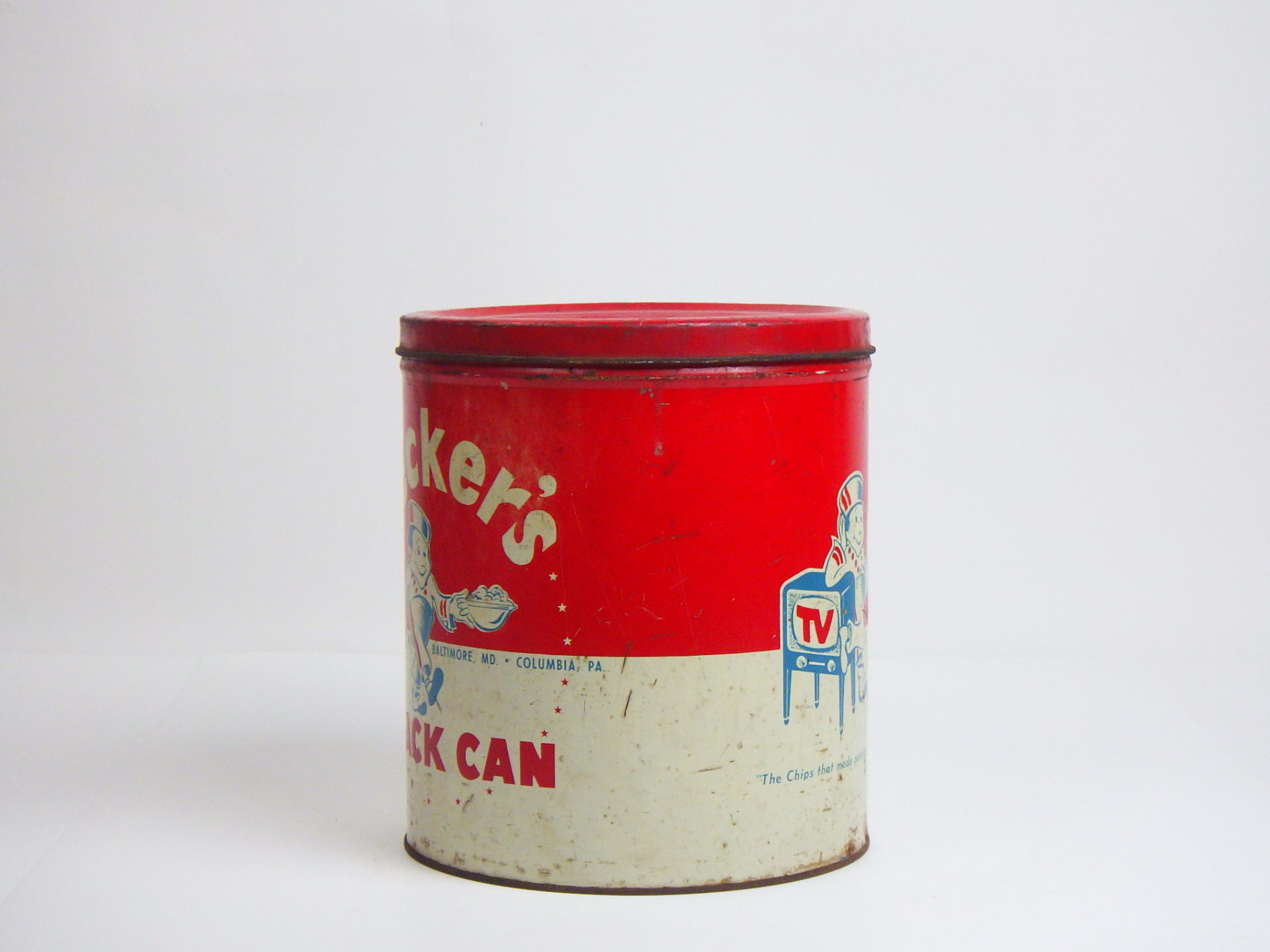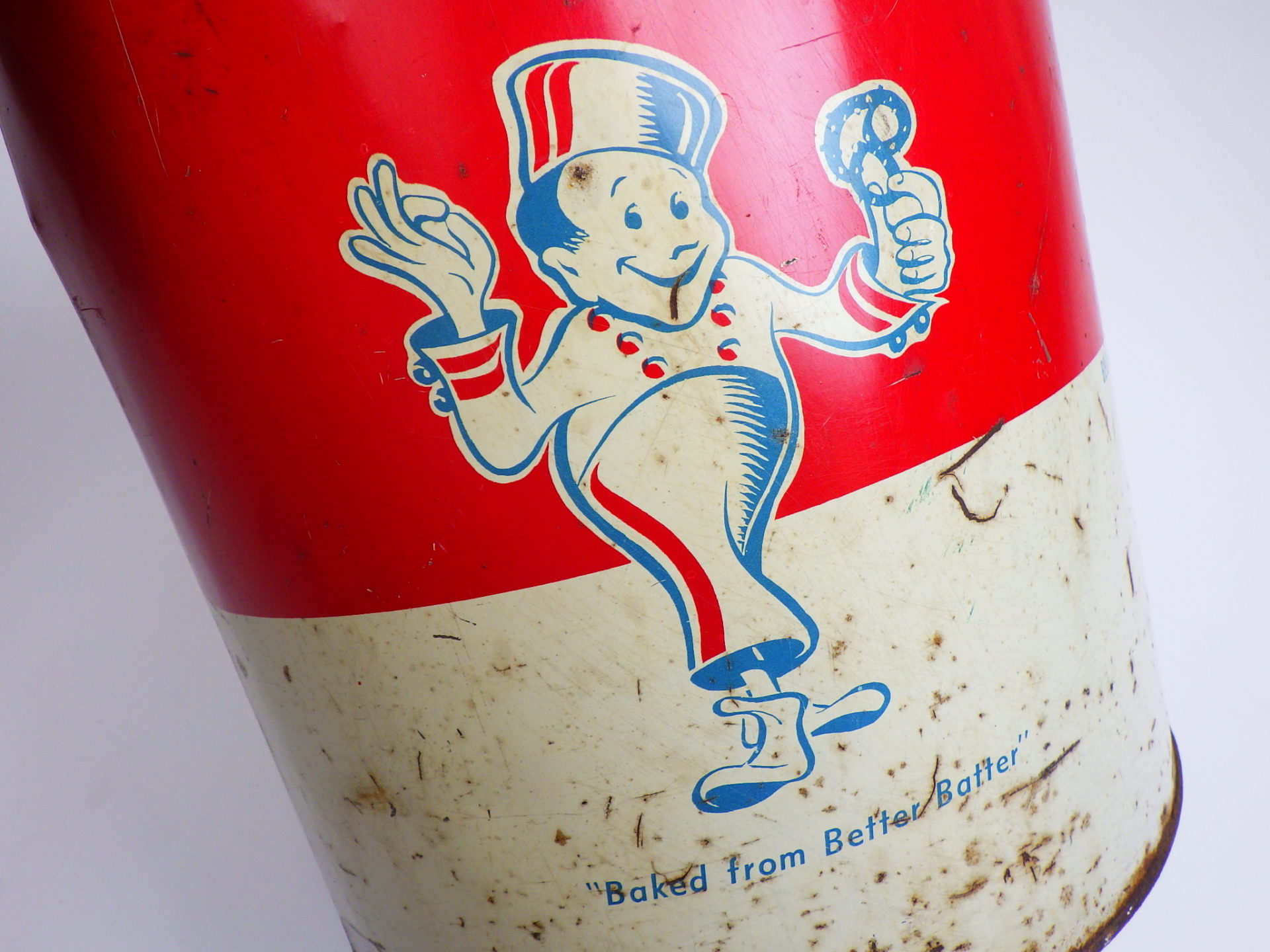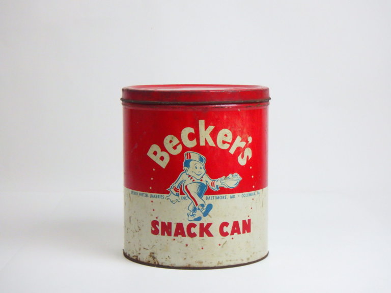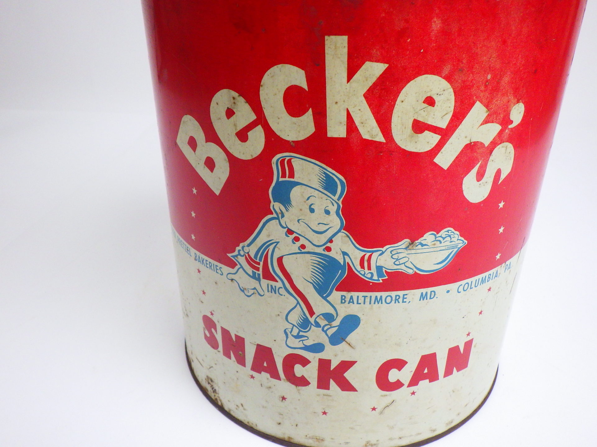| ビンテージのベッカーズのプレッツェル缶です。 プリントが可愛らしく、見せる収納としてもお使いいただけます。 |