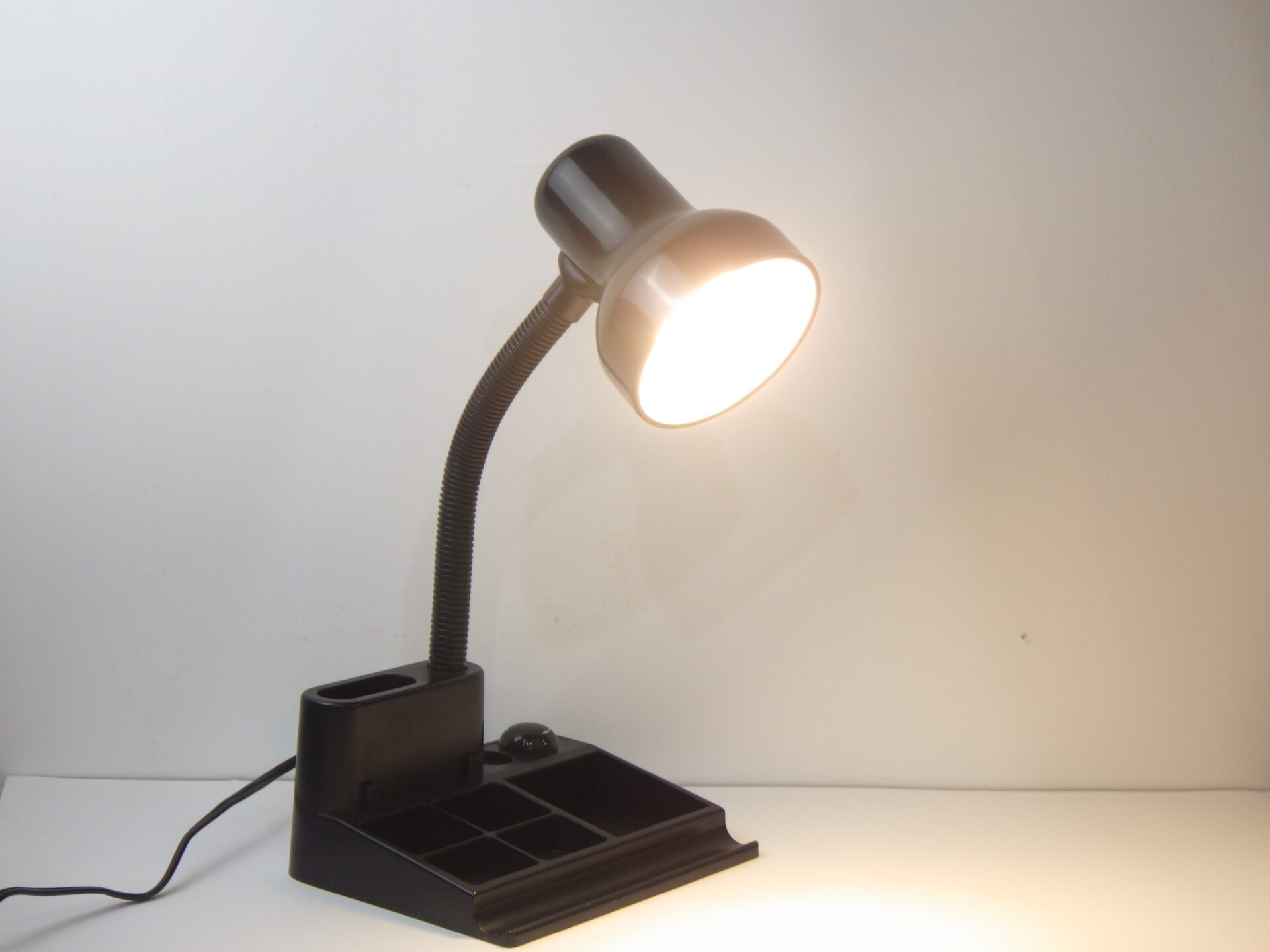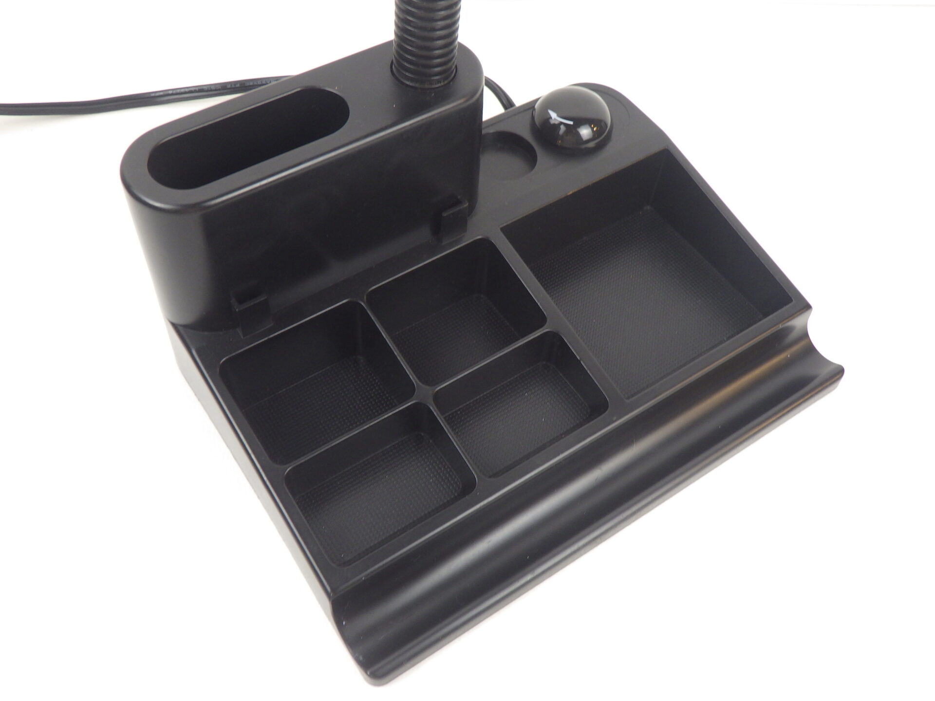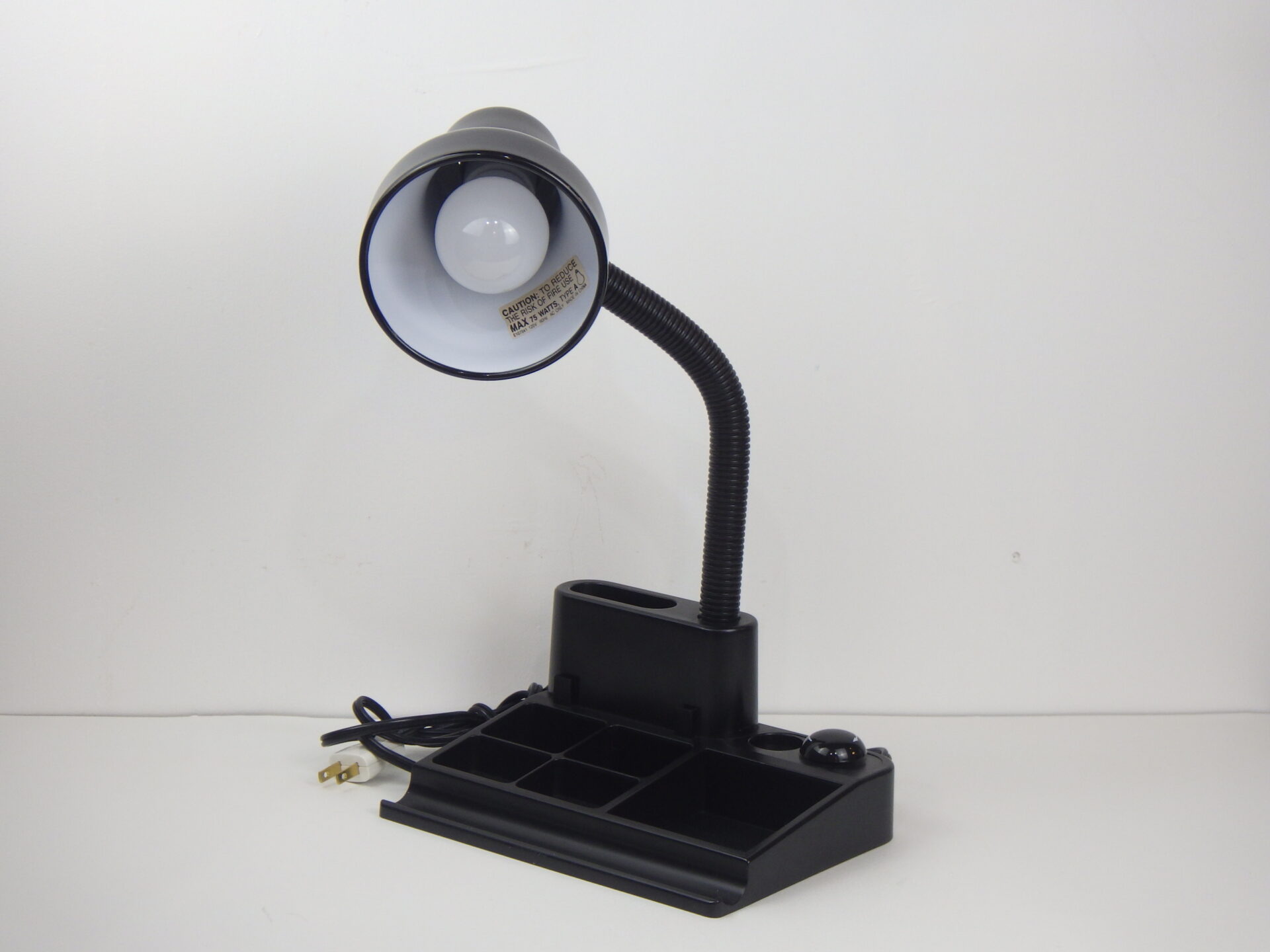 | アメリカで買い付けました。 コンセント式で、土台にON、OFF切り替えスイッチがついています。 (電球の口金サイズ:E26) ヘッド部分は可動式なので、ピンポイントで照らしたい場所に合わせられます。 また、土台部分に事務用品を保管するためのスペースが五カ所、ペン立てもついています。 オフィスや自宅でのリモートワークの際のデスクに合わせてみてはいかがですか? |