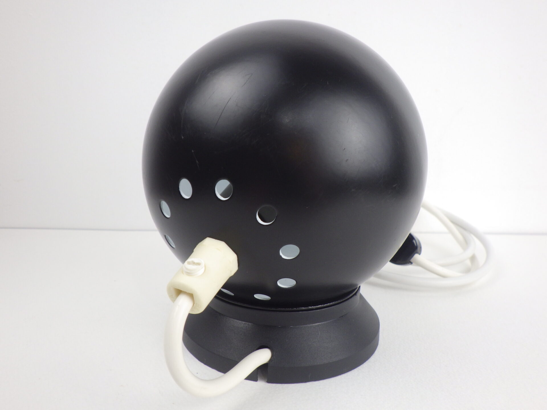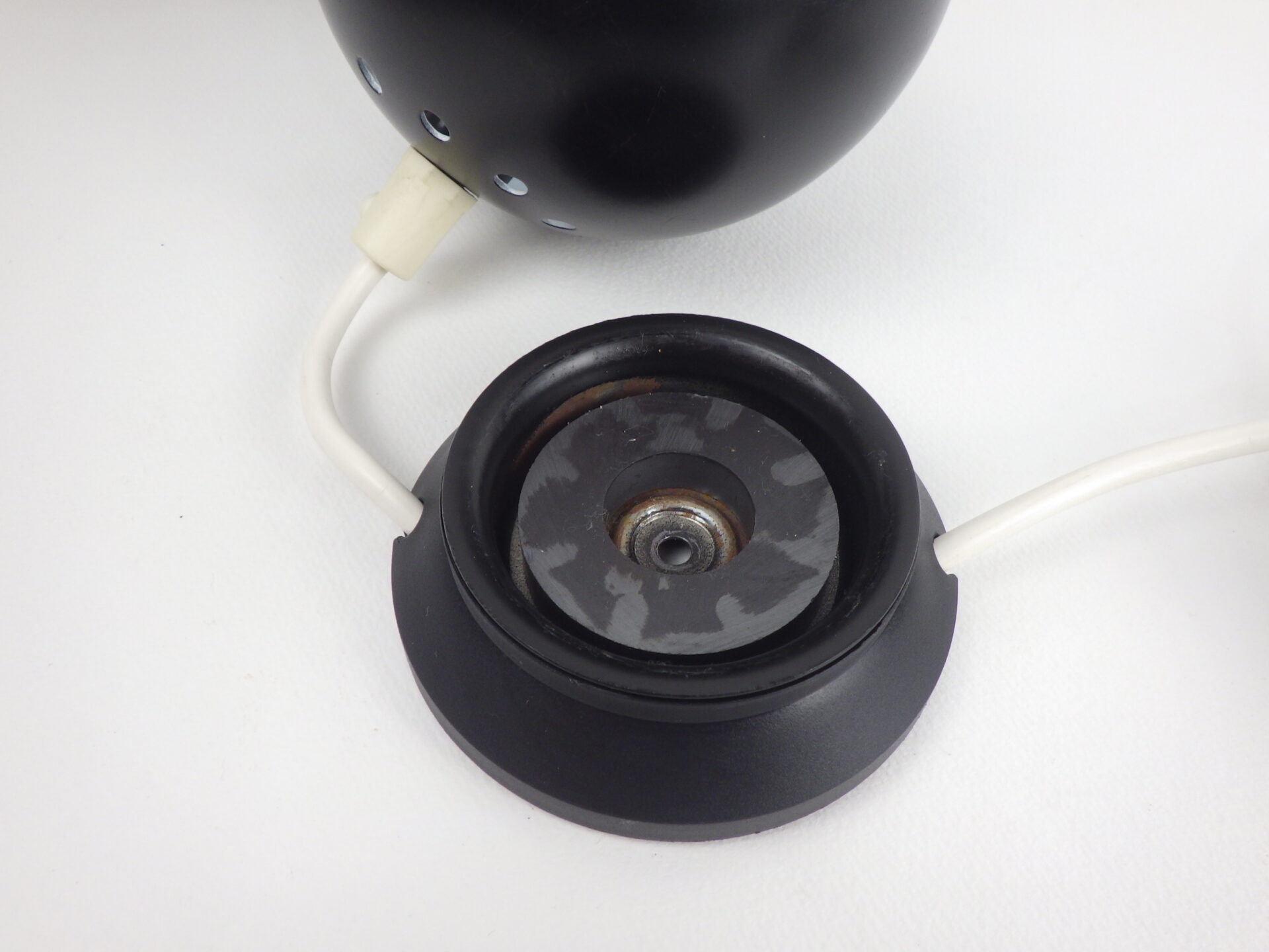 | ヨーロッパで買い付けました。 コロンとしたフォルムが可愛らしいボール型ランプです。 こちらはAbo Randers(アボランダース)製で、Hans Jorgen BerthelによってデザインされたBall Statというランプが元になっています。 こちらの最大の特徴は、ホルダーにマグネットが付いており、磁気でシェードをホルダーに固定するという点。 テーブルランプとしてはもちろんのこと、ホルダーの中心にネジ穴がついているため、壁に取り付けウォールランプとしてもご使用いただけます。 また、ホルダーから外して吊り下げればペンダントライトにも変身する優れもの。 磁器でホルダーにくっついているため、シェードの角度を簡単に変えることが出来るのもグッド。 小ぶりなのでわずかなスペースにもさりげなく取り入れられますし、スペースエイジ感たっぷりなユニークなデザインなのでお部屋のアクセントにもなり、おすすめしています。 (電球サイズ E14 LED電球対応) |