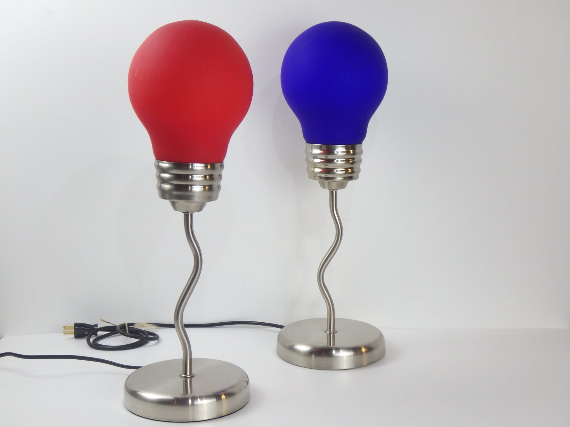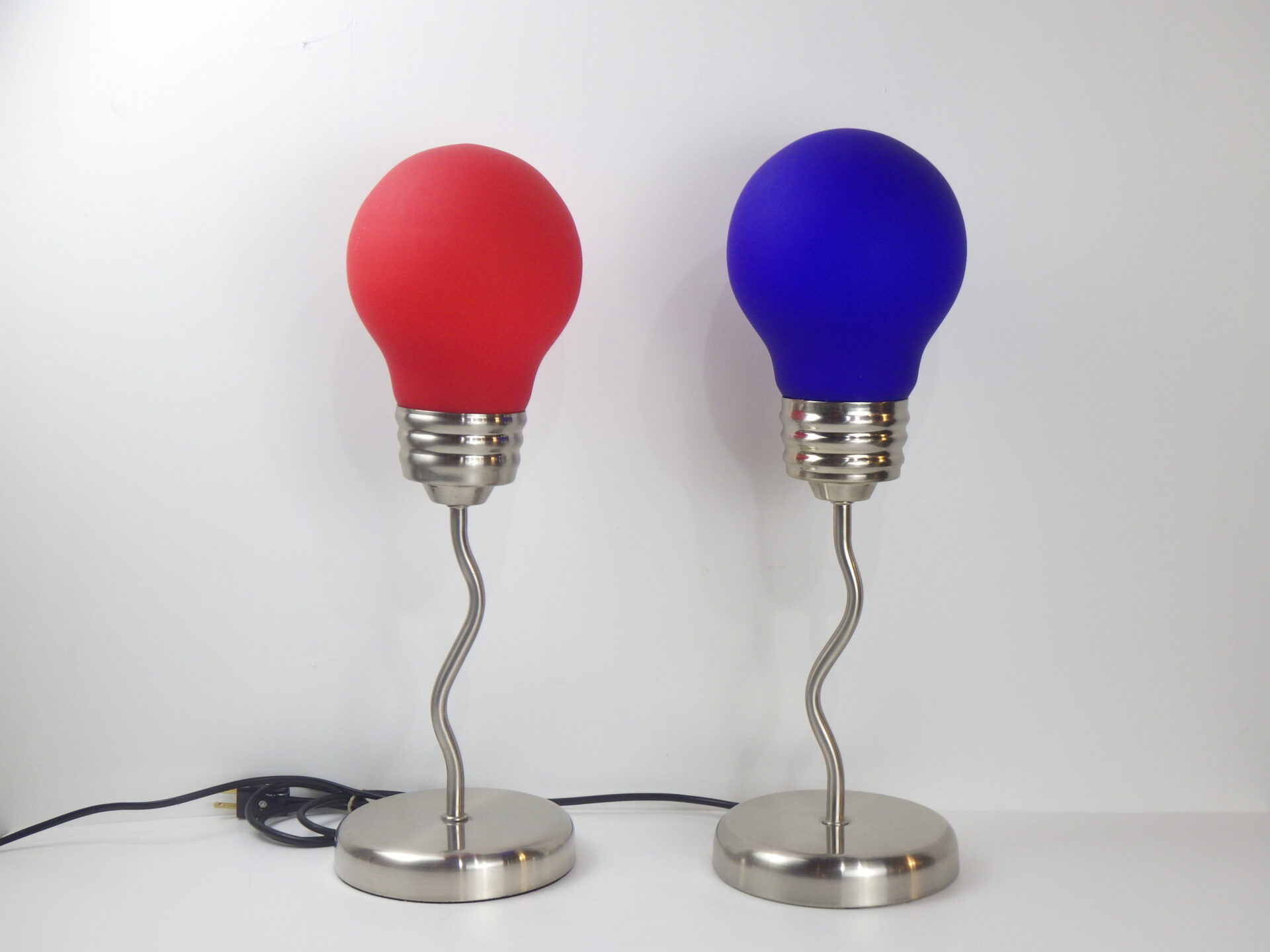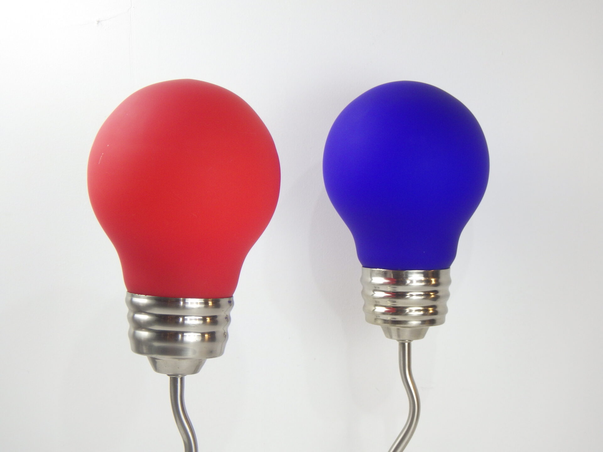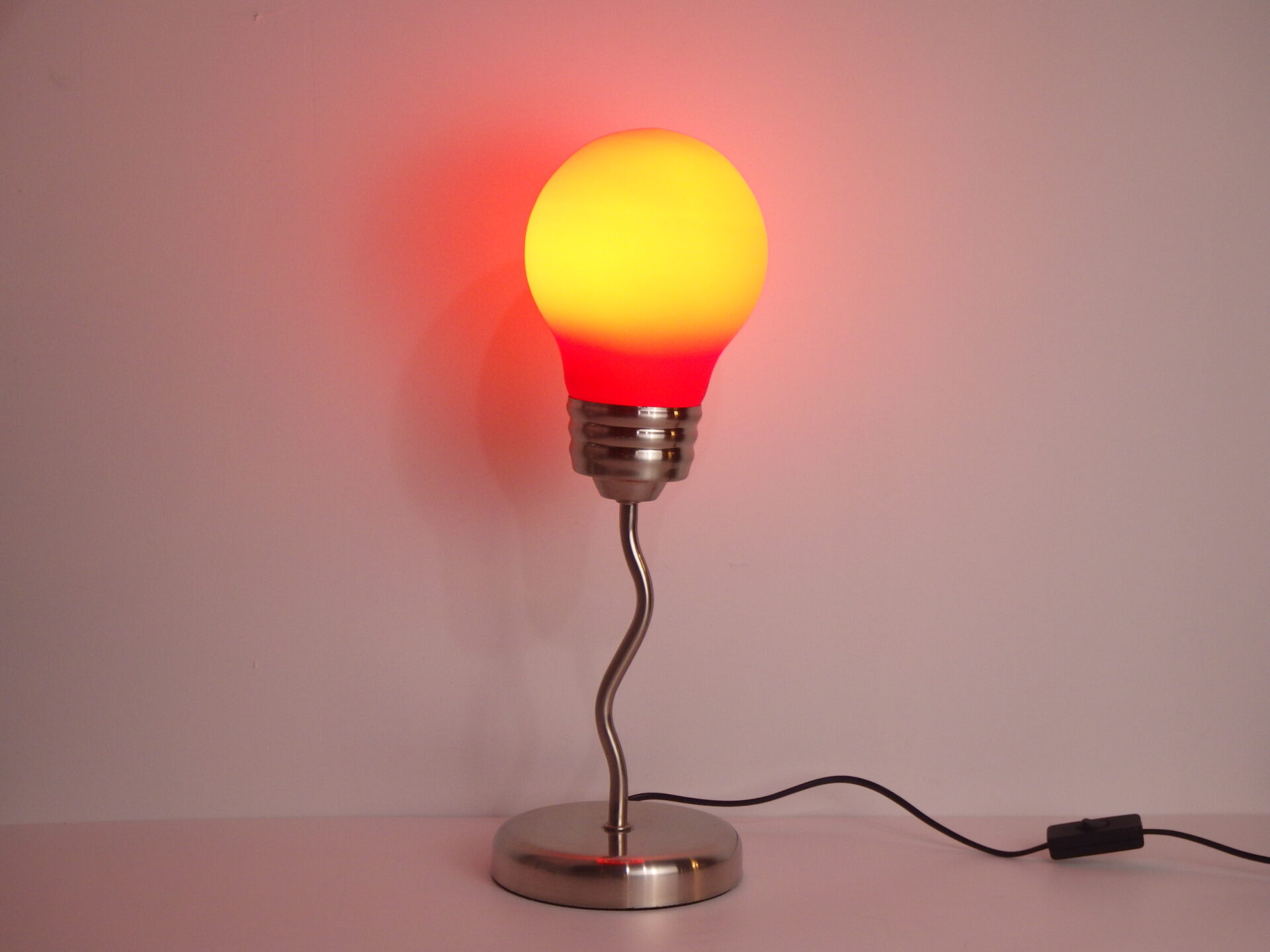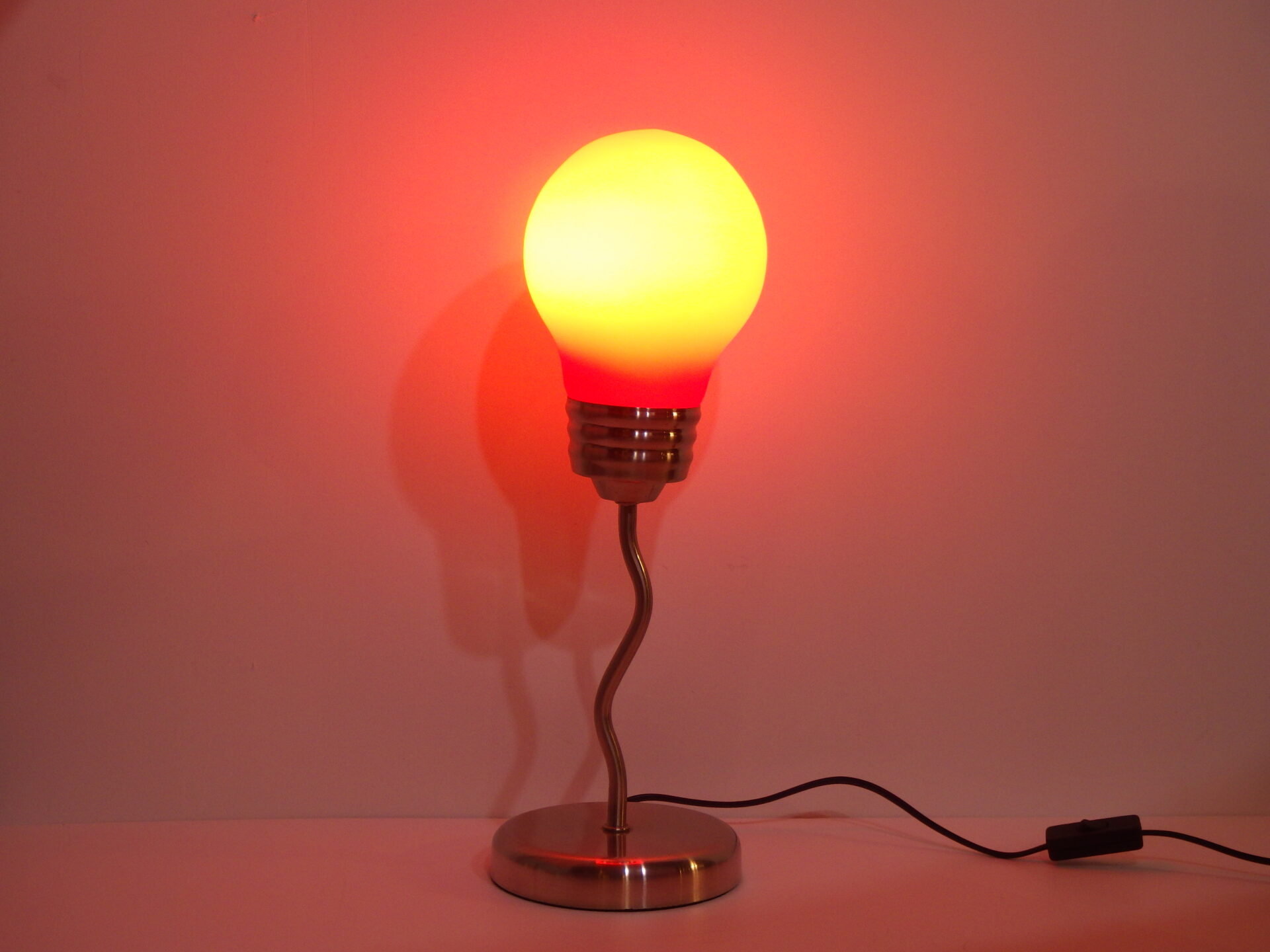 | ヨーロッパで買い付けました。 80年代のポップアートランプです。 大きな電球をひっくり返したようなデザインに、ジグザグのクロームメッキのベースが印象的なアイテム。 写真ではオレンジっぽく光って見えますが、肉眼で見ると赤色に光って見えます。 店舗什器やインテリアのアクセントとしておすすめしています。 スイッチでON/OFFが切り替えられます。 (こちらは青いランプのみの販売ページとなります) (電球サイズ:E26 LED対応) |
