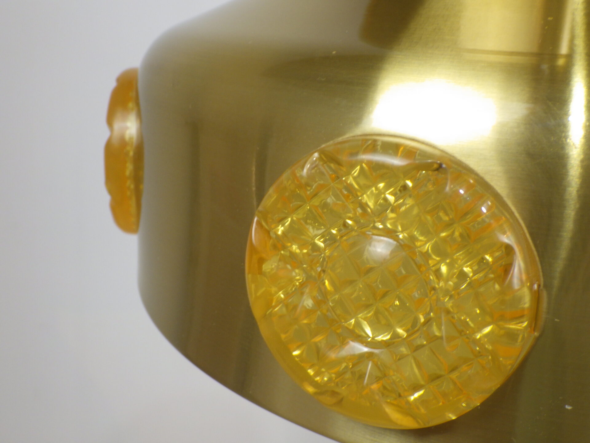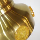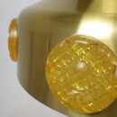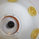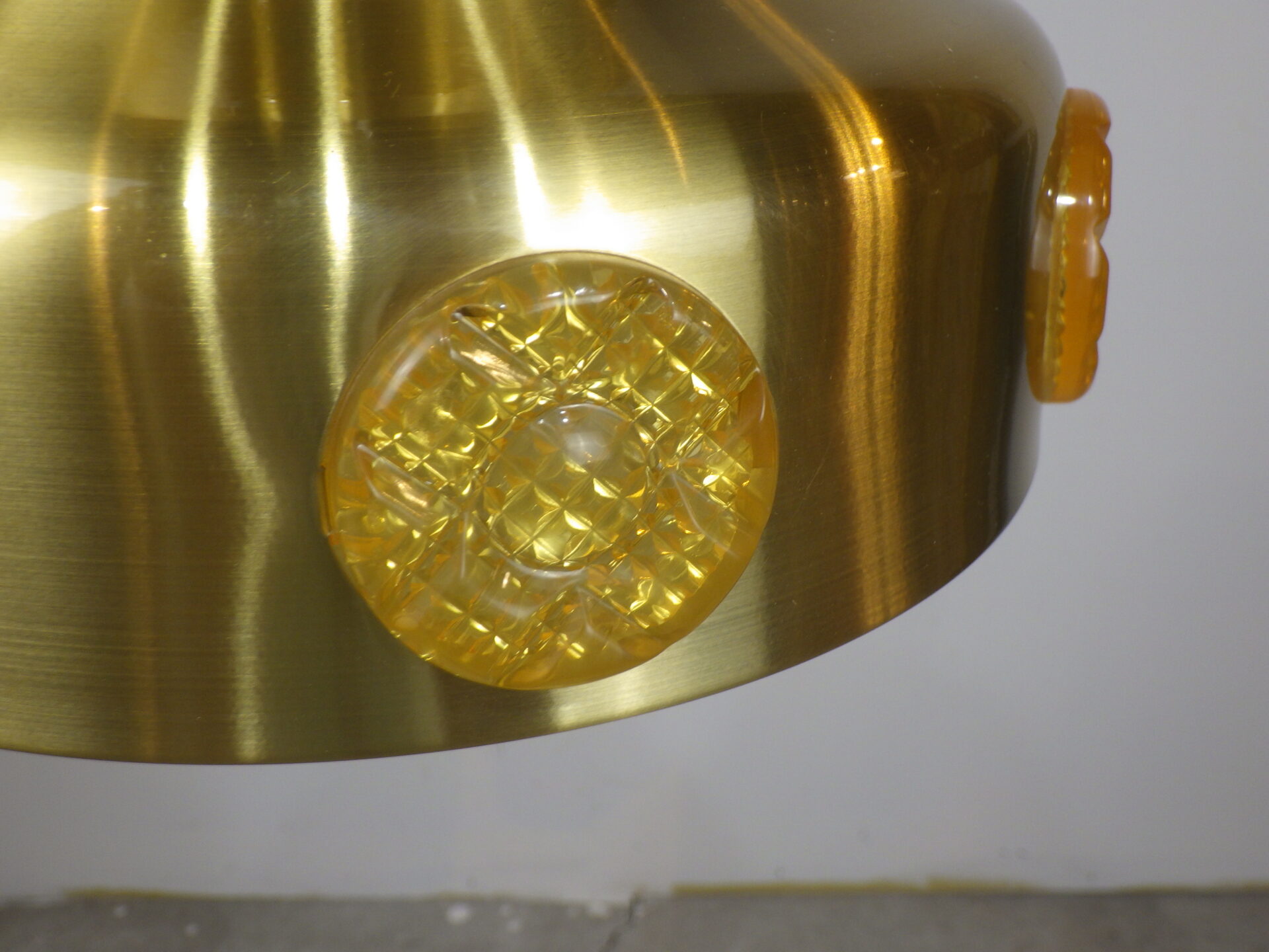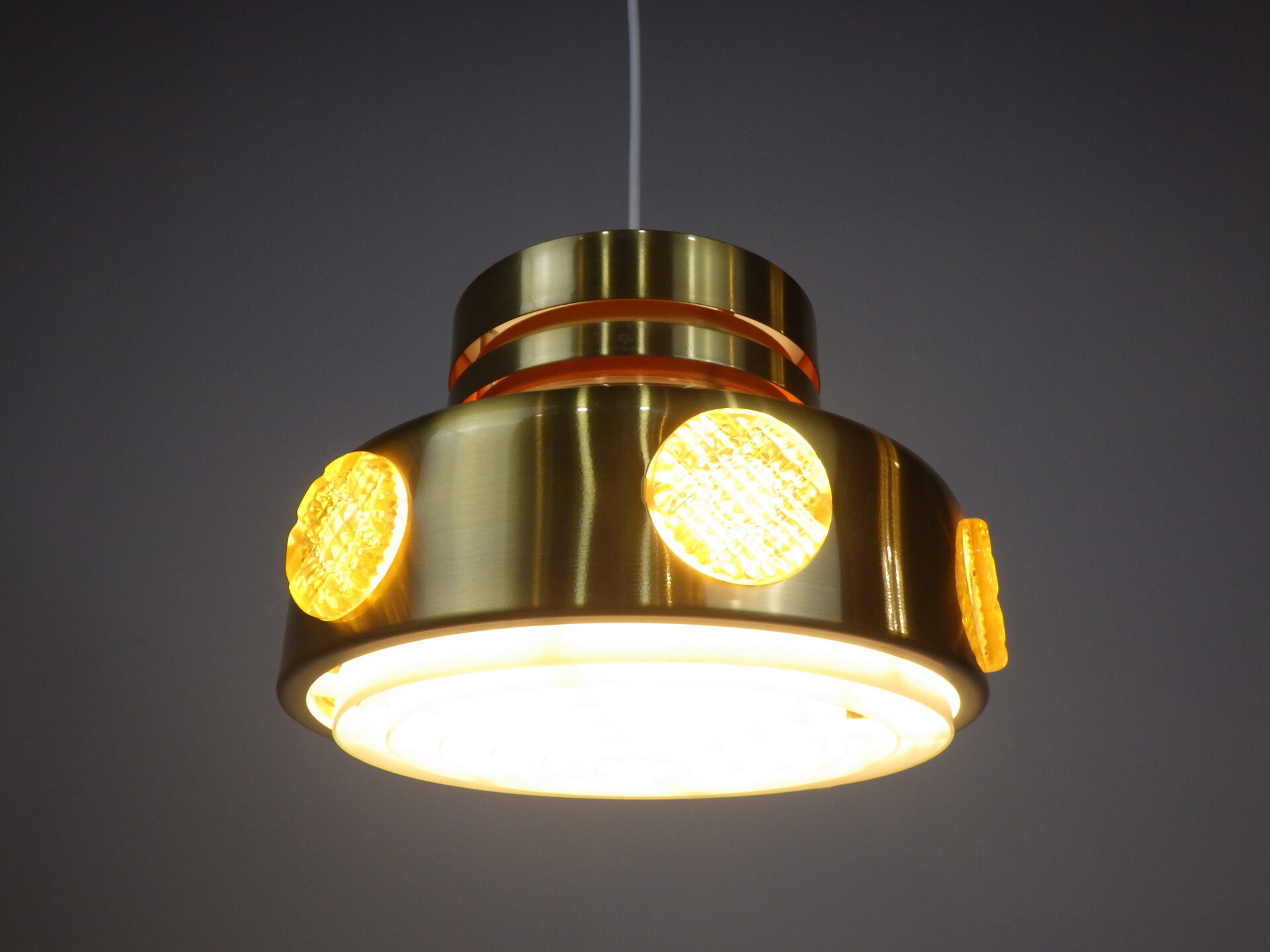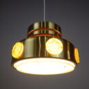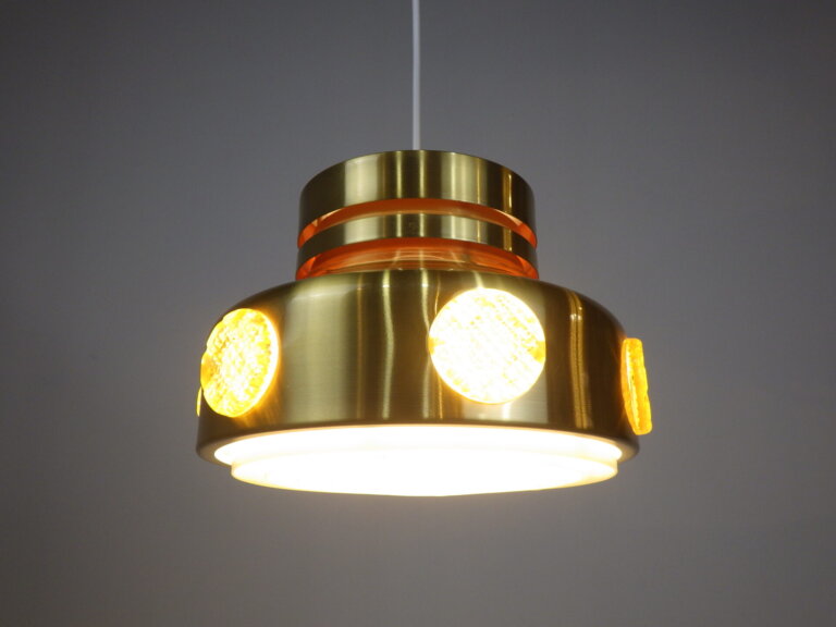 | ヨーロッパで買い付けました。 デンマーク製、UFOペンダントランプです。 北欧やヨーロッパのランプに良く見られるルーバーランプ。ルーバーは過剰な光の拡散を抑え、柔らかく優しい光の波を演出してくれる効果があります。 メタリックゴールドと、サイドのイエロー、そして上部からは内側の塗装のオレンジが光の反射でわずかに漏れ、とても良いカラーバランス。 空間をクールにも、可愛くも出来る、印象的なアイテムです。 お部屋のアクセントに、また店舗什器としても活躍してくれそうです。 |