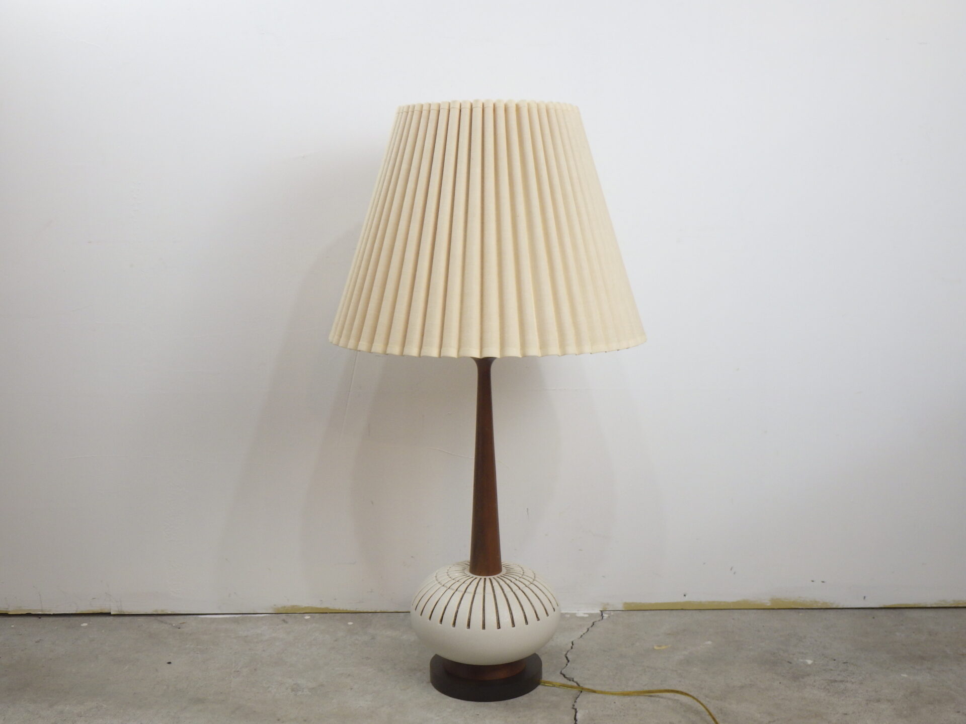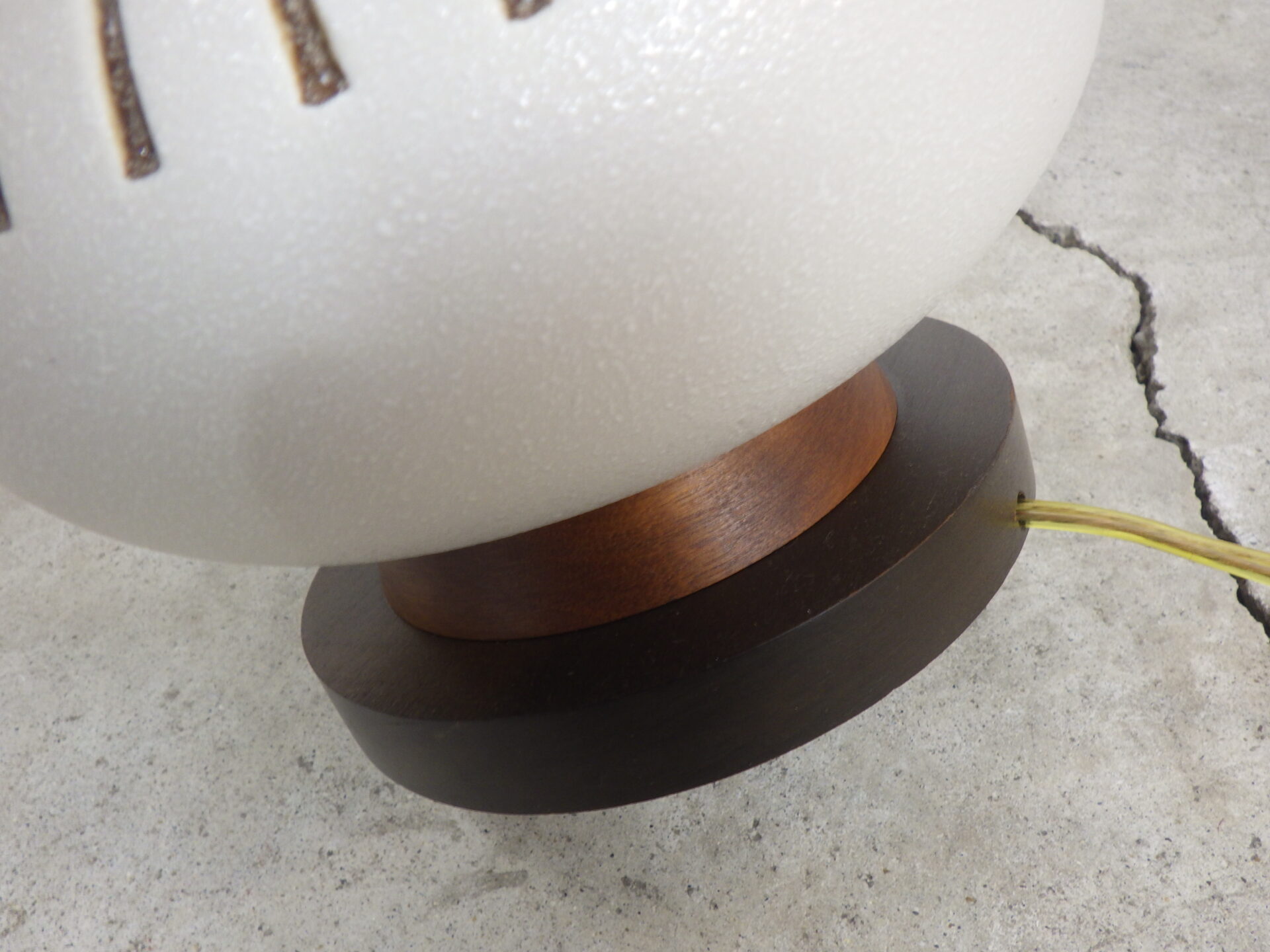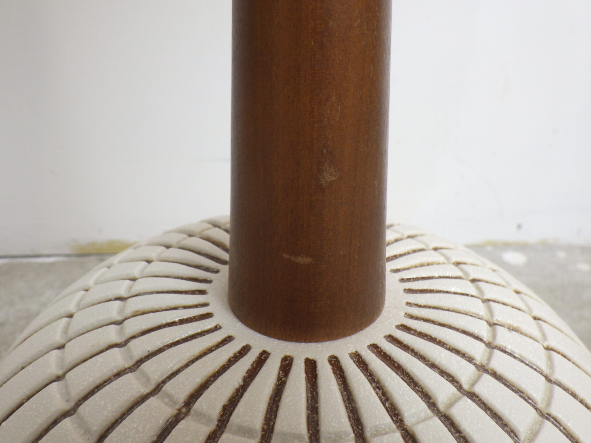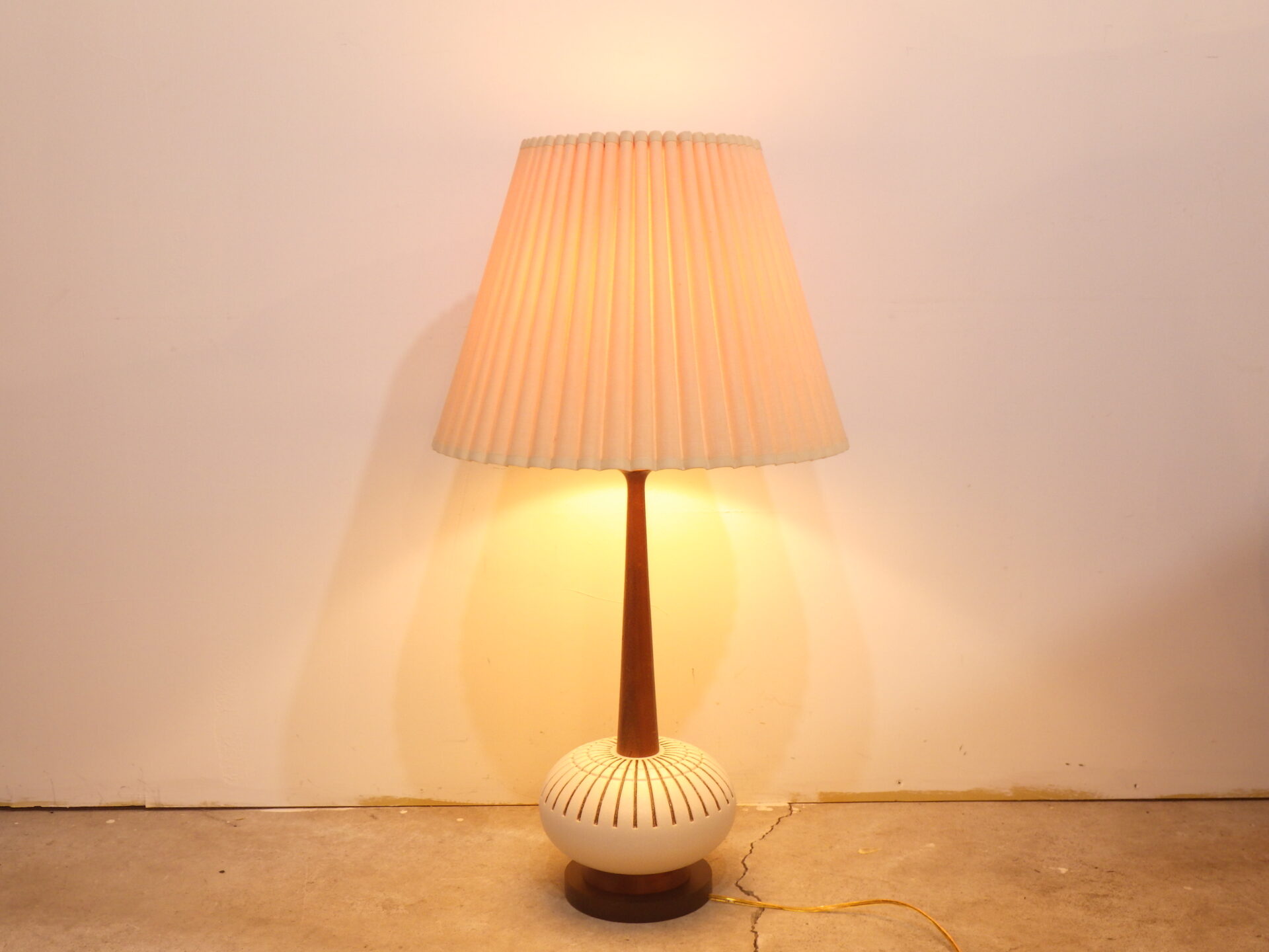 | アメリカで買い付けました。 ベースは陶器と木で出来ています。 ぽってりとしたポタリーベースに、すっと伸びたチーク材が洗練された大人の雰囲気を醸し出す、上品な佇まいのランプです。 高さがあるのでフロアランプの様に床に置いても良さそうです。 間接照明としての役割だけでなく、インテリアとしての存在感を如何なく発揮してくれるアイテムですね。 ソケット部分のスイッチでON/OFFが切り替えられます。 (電球の口金サイズ:E26 LED対応) |