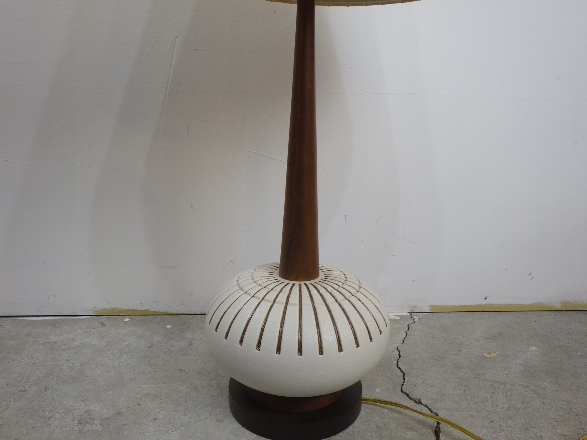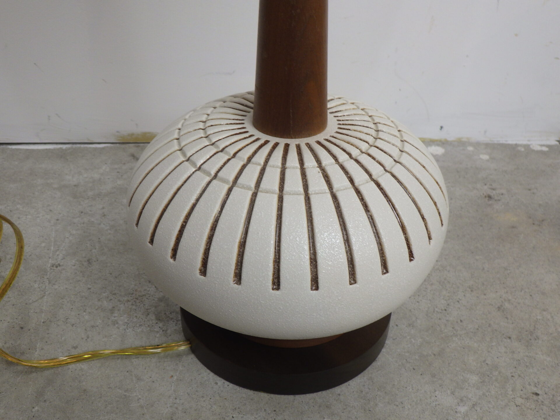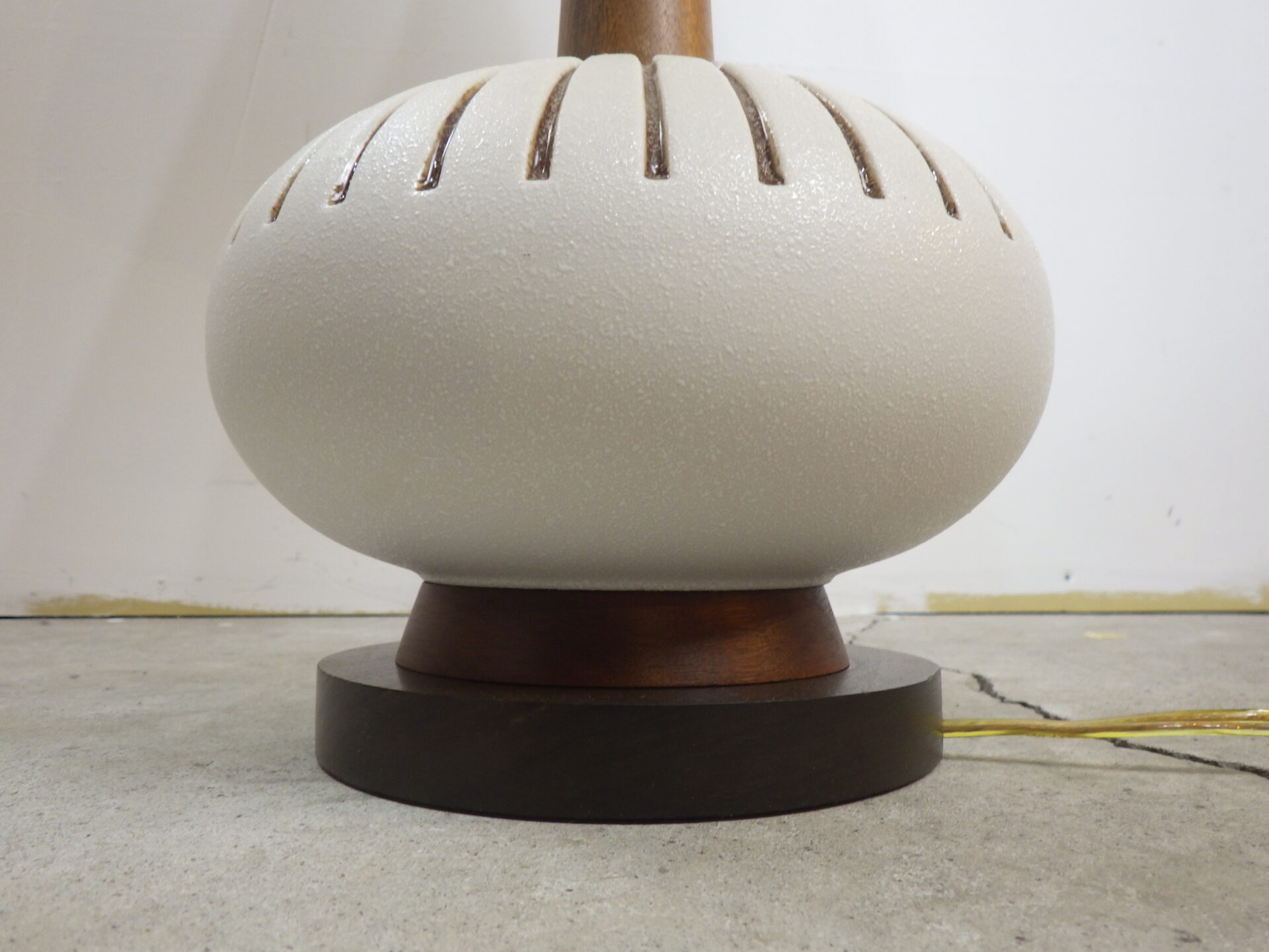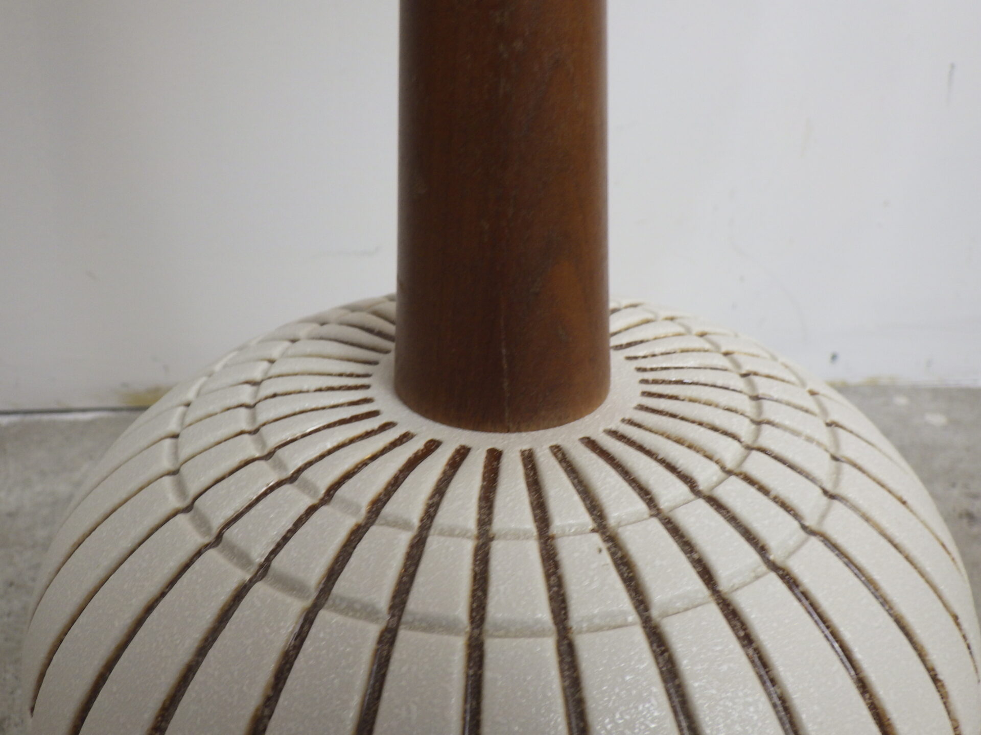 | アメリカで買い付けました。 ベースは陶器と木で出来ています。 ぽってりとしたポタリーベースに、すっと伸びたチーク材が洗練された大人の雰囲気を醸し出す、上品な佇まいのランプです。 高さがあるのでフロアランプの様に床に置いても良さそうです。 間接照明としての役割だけでなく、インテリアとしての存在感を如何なく発揮してくれるアイテムですね。 ソケット部分のスイッチでON/OFFが切り替えられます。 (電球の口金サイズ:E26 LED対応) |