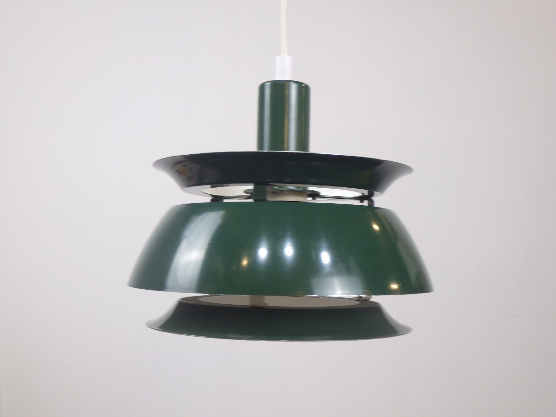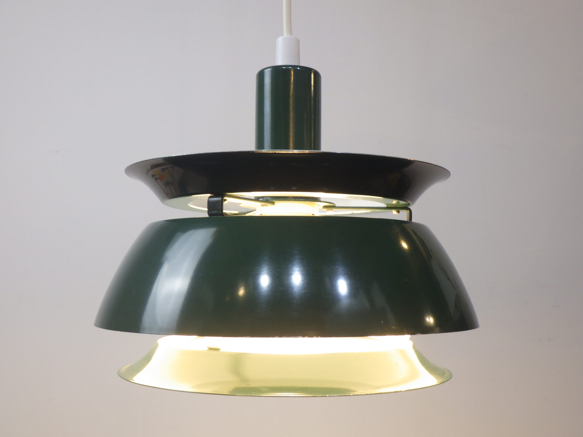 | ヨーロッパで買い付けました。 1948年創業「Vitrika社」のビンテージペンダントランプです。 上下にシェードが重なった、北欧モダンの代表的デザインで、重なったシェードに光が反射し、グラデーションを生み出します。 小ぶりなので、ダイニングやリビングスペースに最適です。 深みのある落ち着いたグリーンは、心穏やかにしてくれそうですね。 |