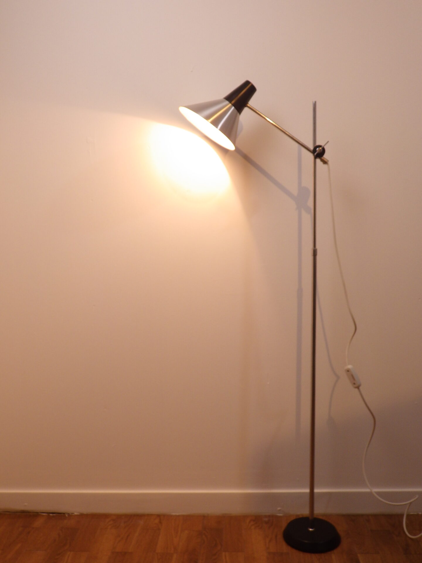 | ヨーロッパで買い付けました。 モダンスタイルなアルミシェードとすっきりしたシルエットが美しいデンマーク製のフロアランプです。 シェードは高さ、角度、方向の調節が可能。場面に合わせて様々な角度を照らすことが出来ます。 コードについているスイッチでON/OFFの切り替えが出来ます。 インテリアのアクセントにいかがですか? |