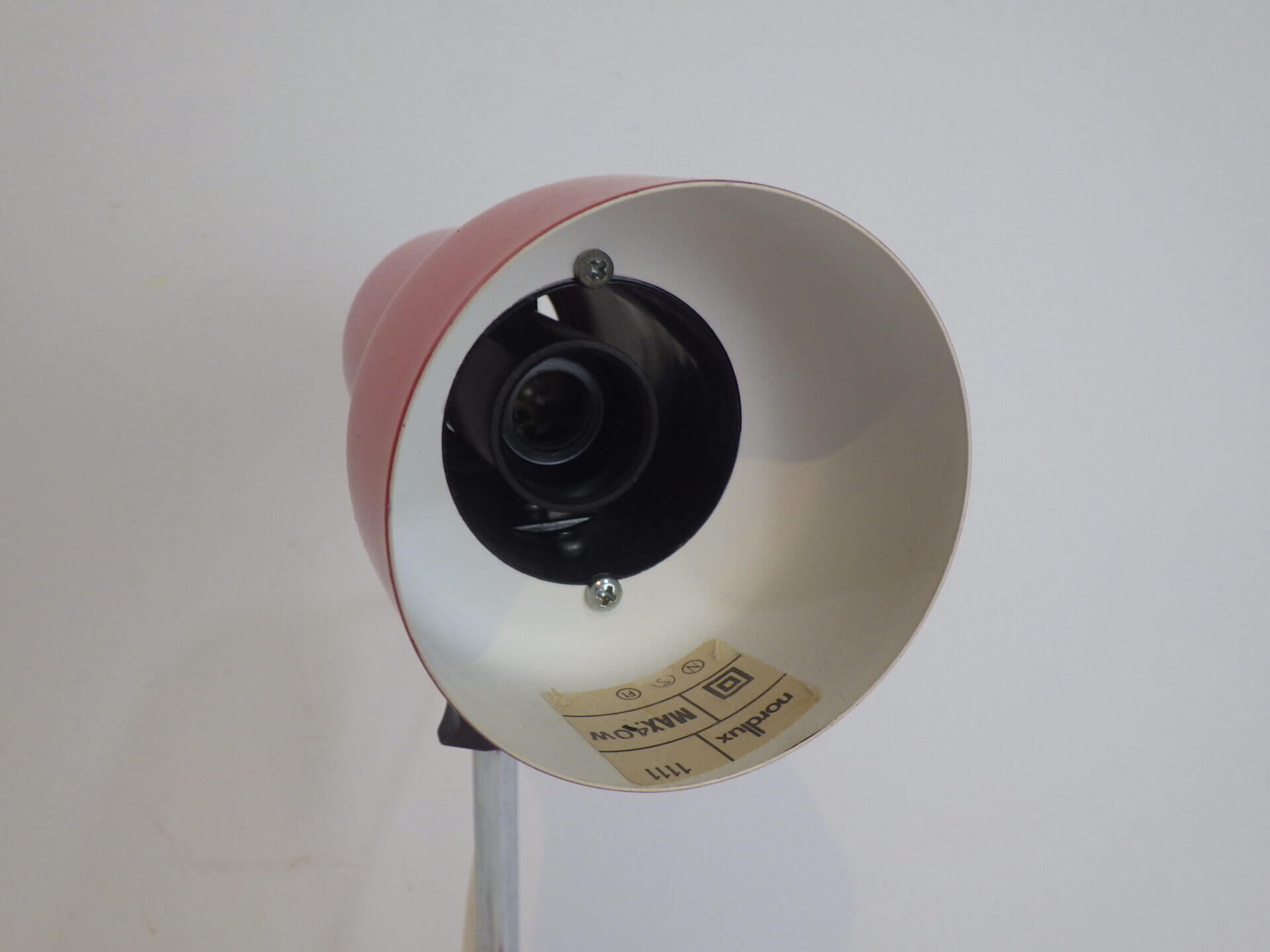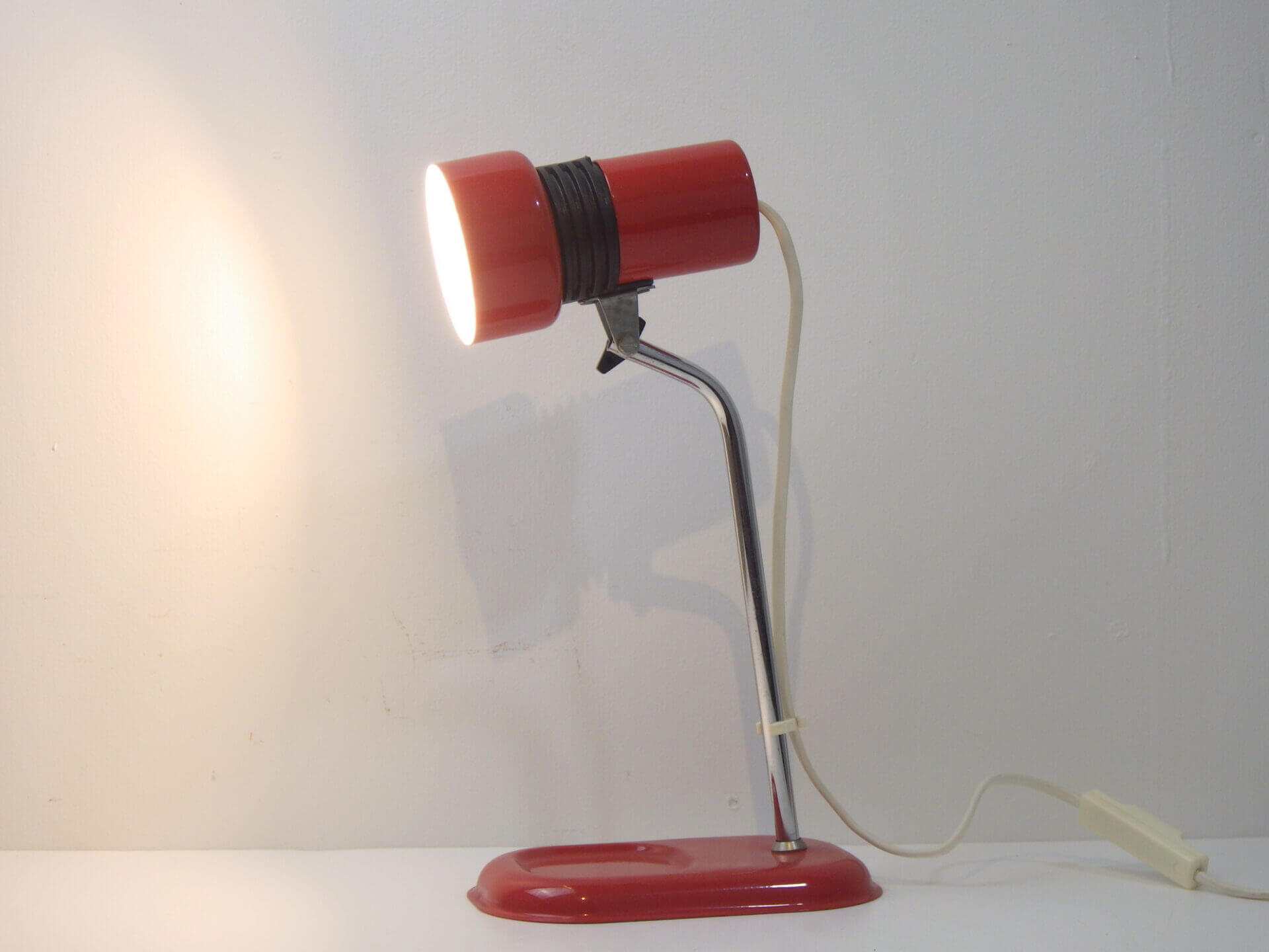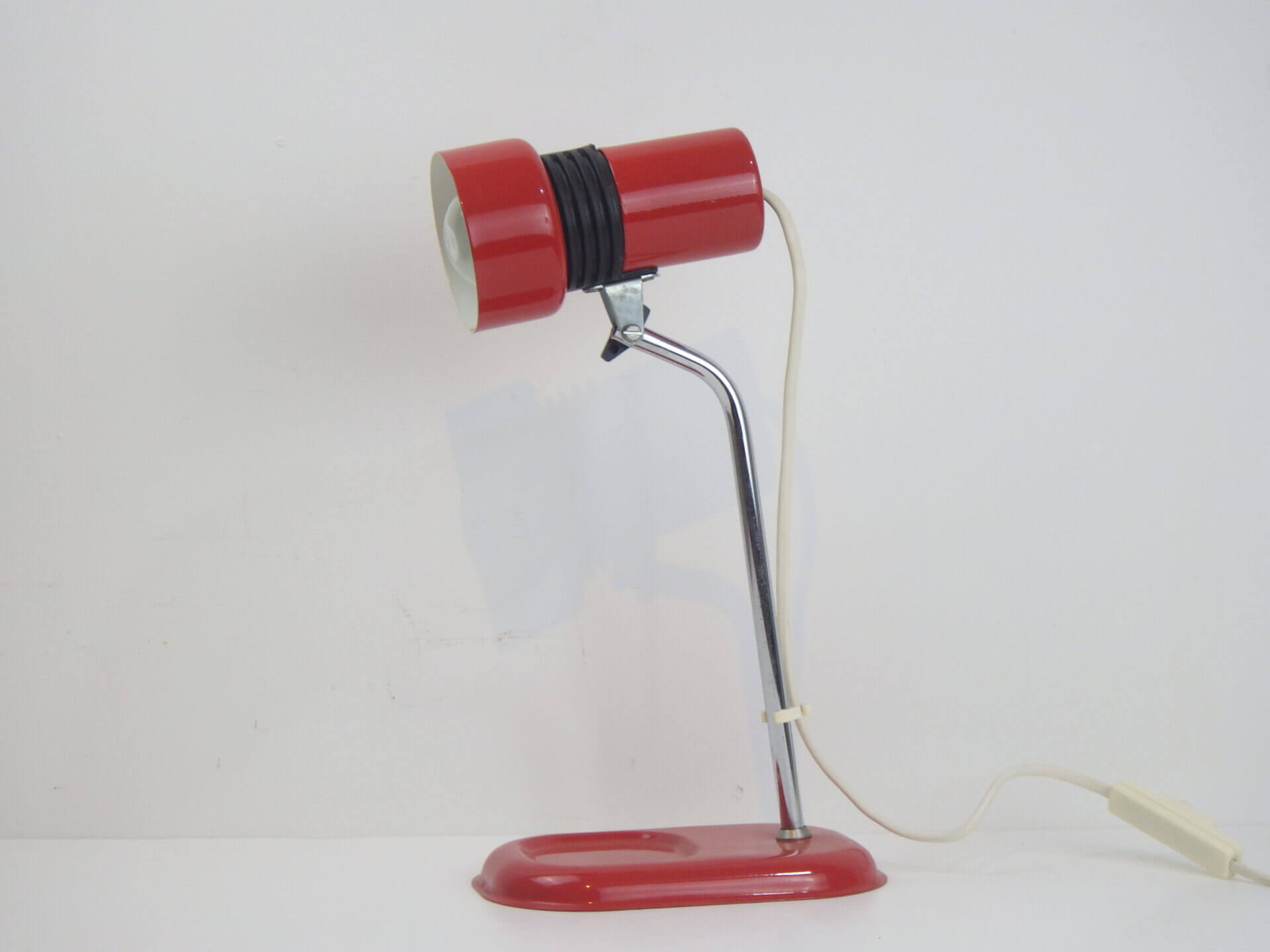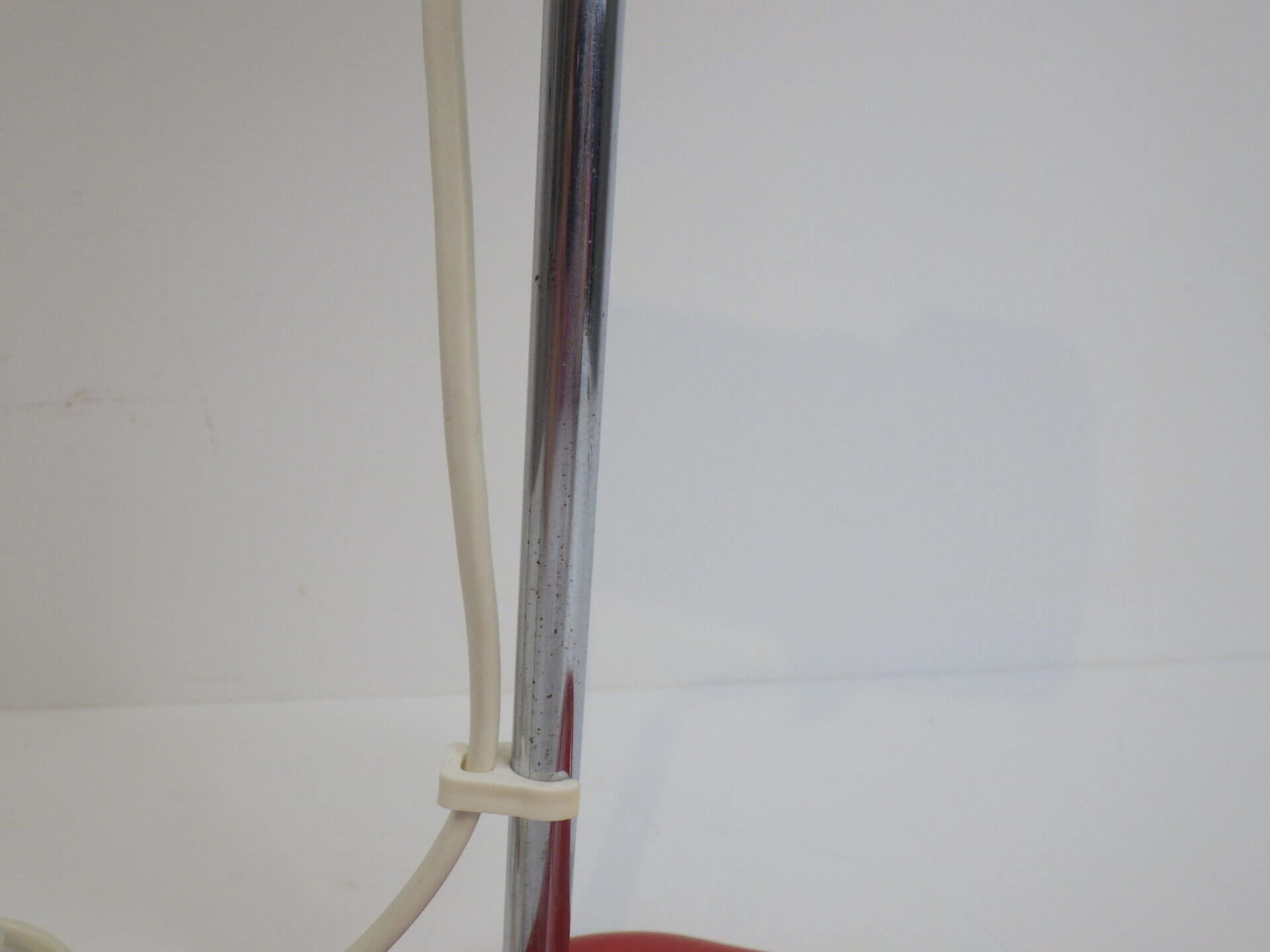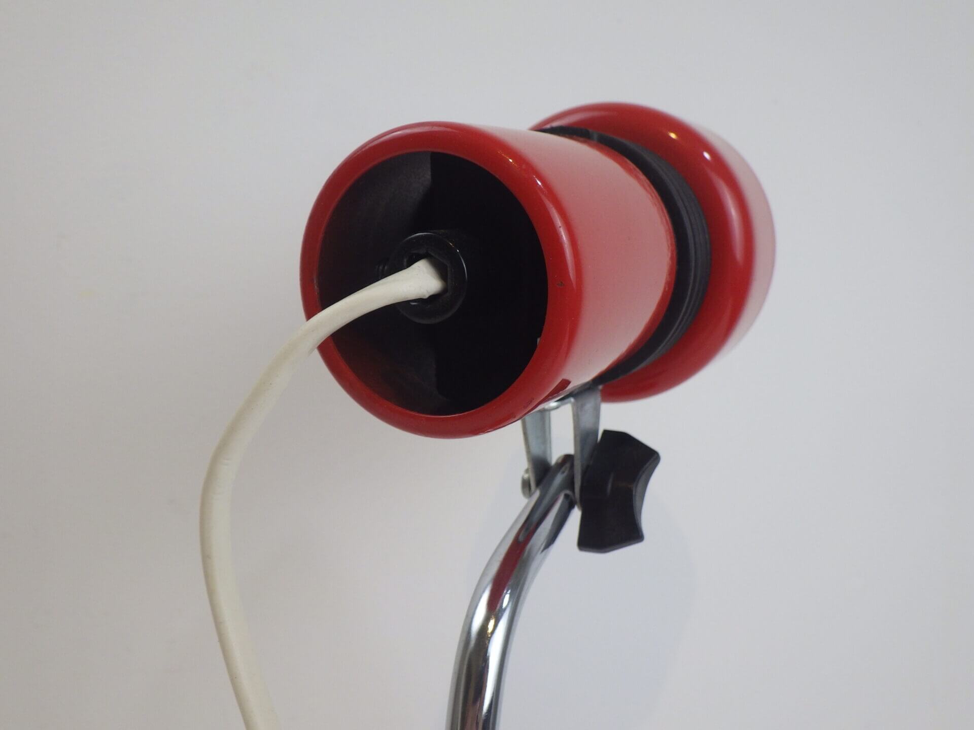 | ヨーロッパで買い付けました。 ちょっとした事務アイテムを置いておけるトレー付きのデスクランプです。 赤と黒のポップなカラーリングに、クロームの脚がよく馴染むデザインです。 デスク上だけでなく、棚に入れたり店舗什器として置いたり、様々な空間でインテリアのアクセントとしてお使いいただけそうです。 ネック部分の角度を調整出来ます。 コンセント部分のスイッチでON/OFFが切り替えられます。 (電球の口金サイズ:E14 LED対応) |