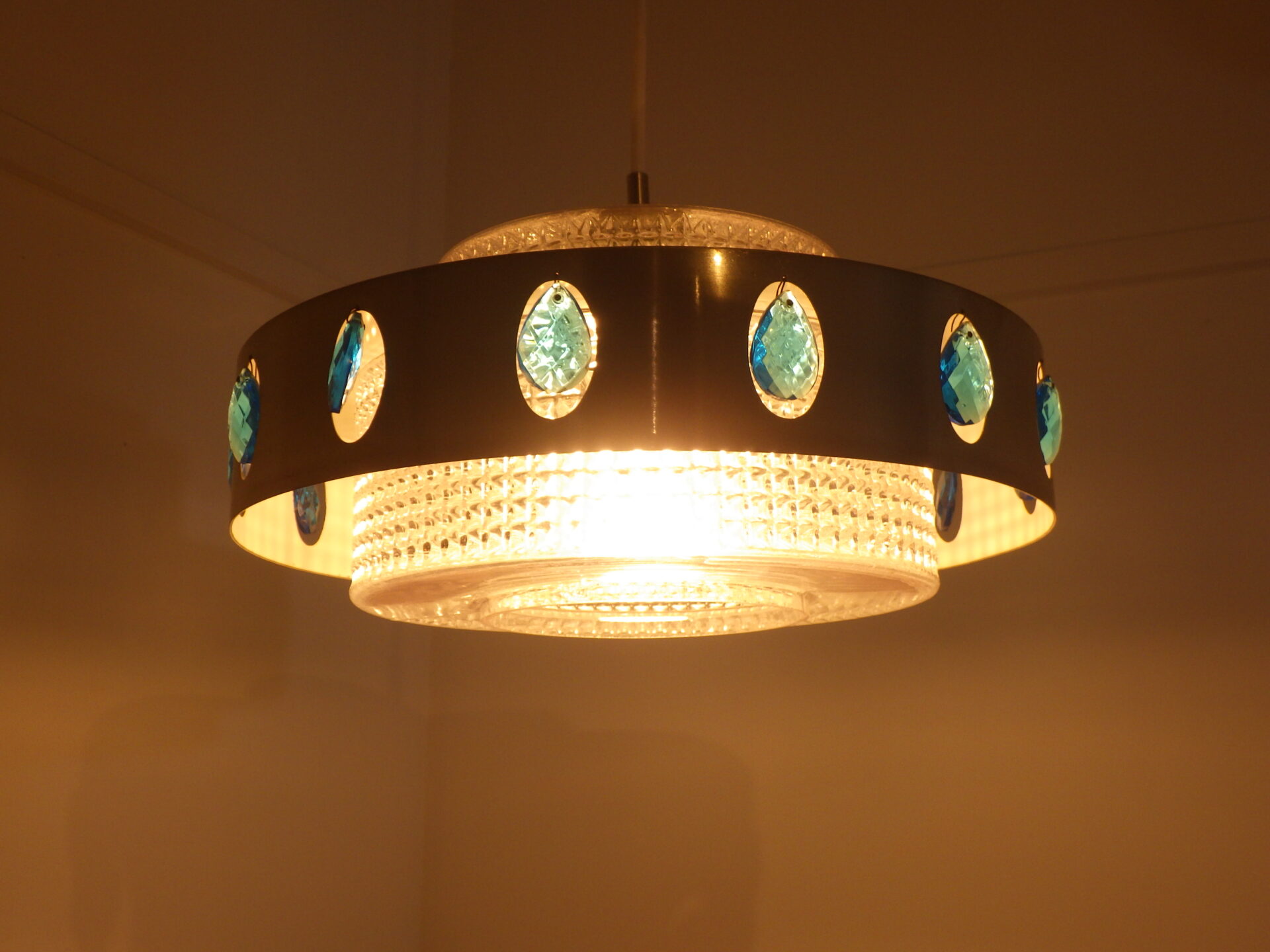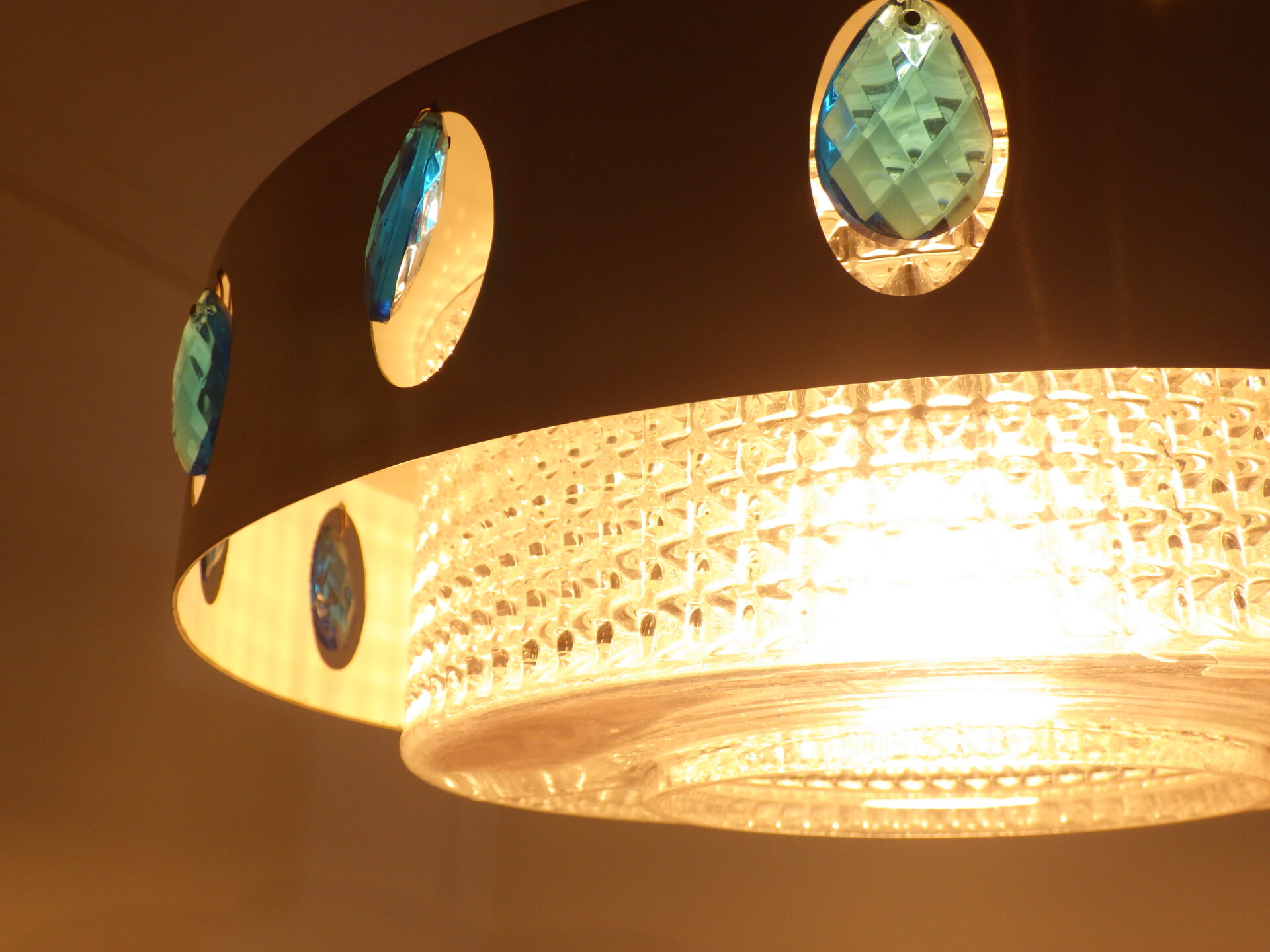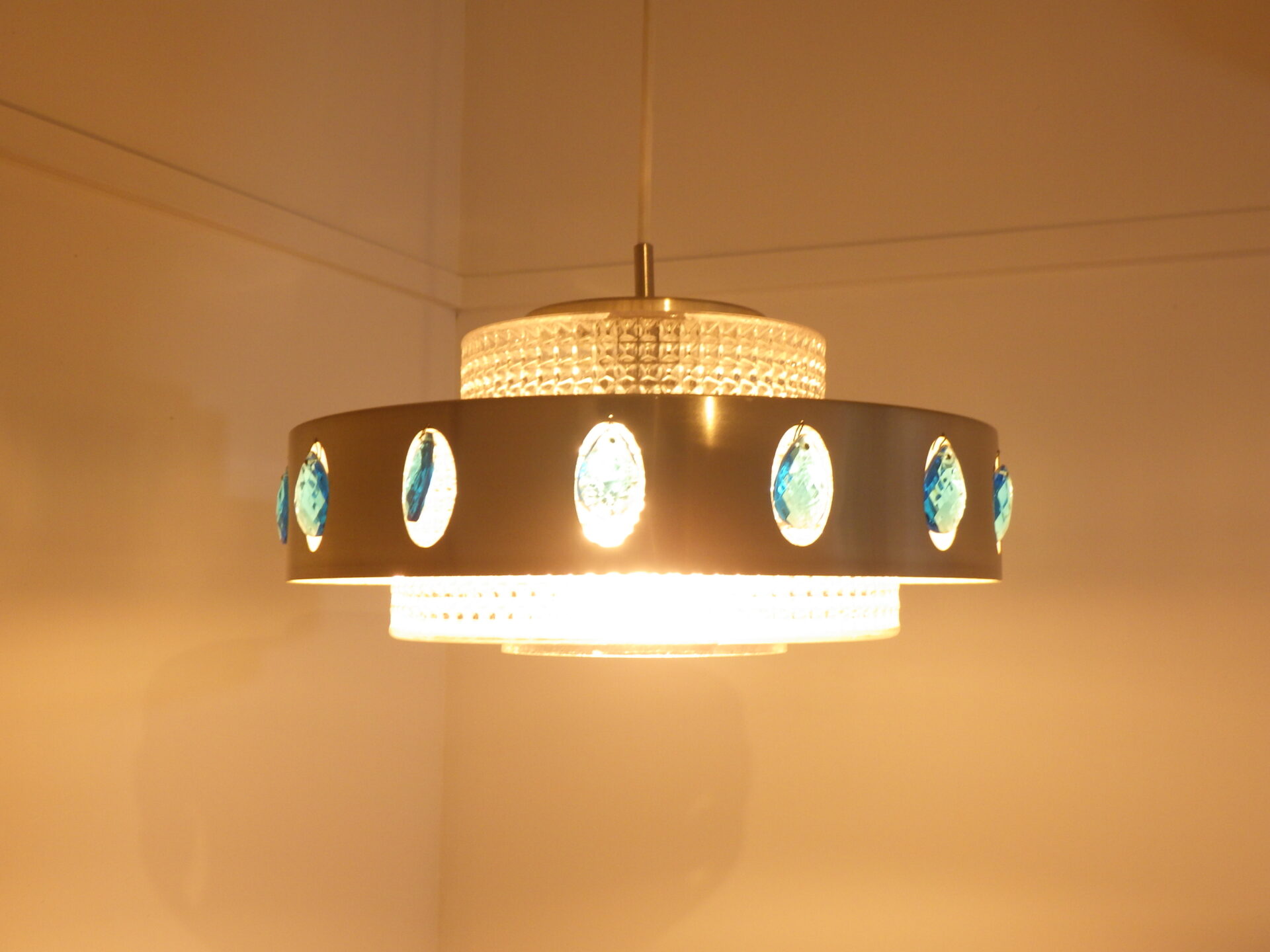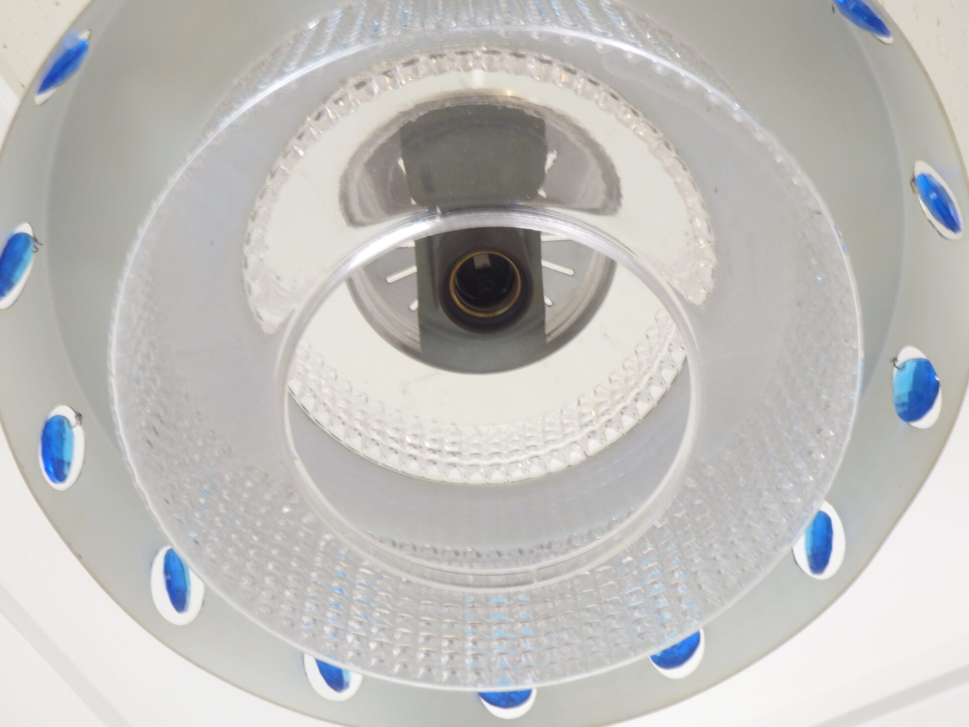 | ヨーロッパで買い付けました。 1948年創業「Vitrika社」のビンテージペンダントランプです。 シルバーのシェードの側面に、ブルーのアクリル飾りが施されており、点灯すると宝石のようにきらきらと透き通ってとても綺麗に輝きます。 シルバーのシェードを突き抜ける形で内側についているガラスのシェードは、分厚く、細かなカットが施されています。 こちらも点灯すると幾重にも反射して、優しい光を放ちます。 消灯時でも十分なゴージャスさを発揮してくれるデザインですので、昼間もインテリアのアクセントとして空間を彩ってくれること間違いないしでしょう。 |
