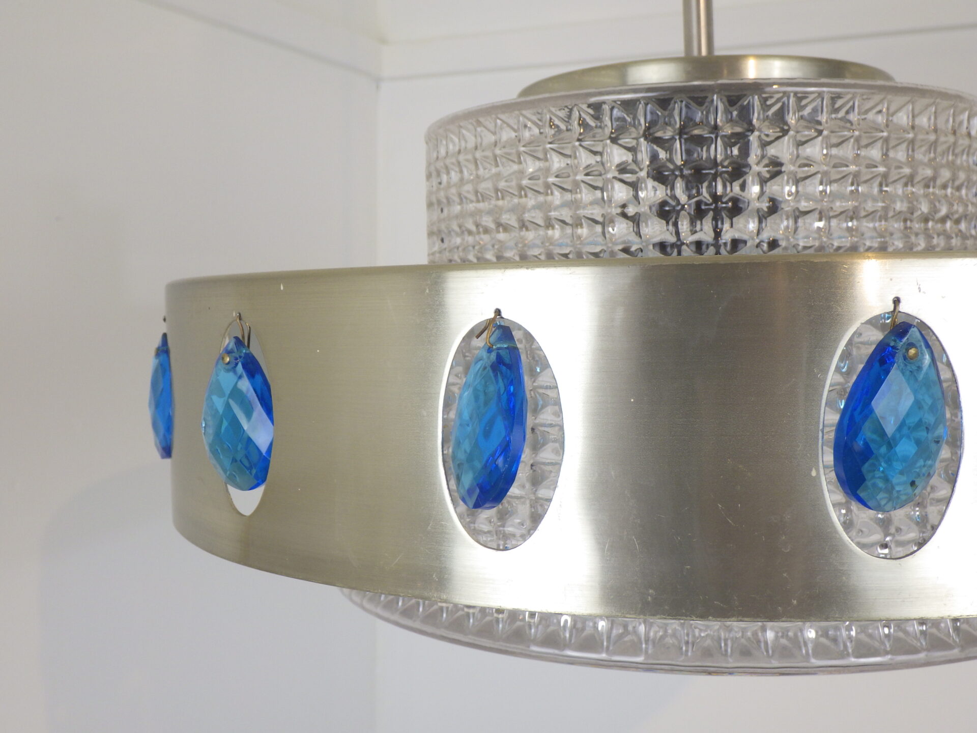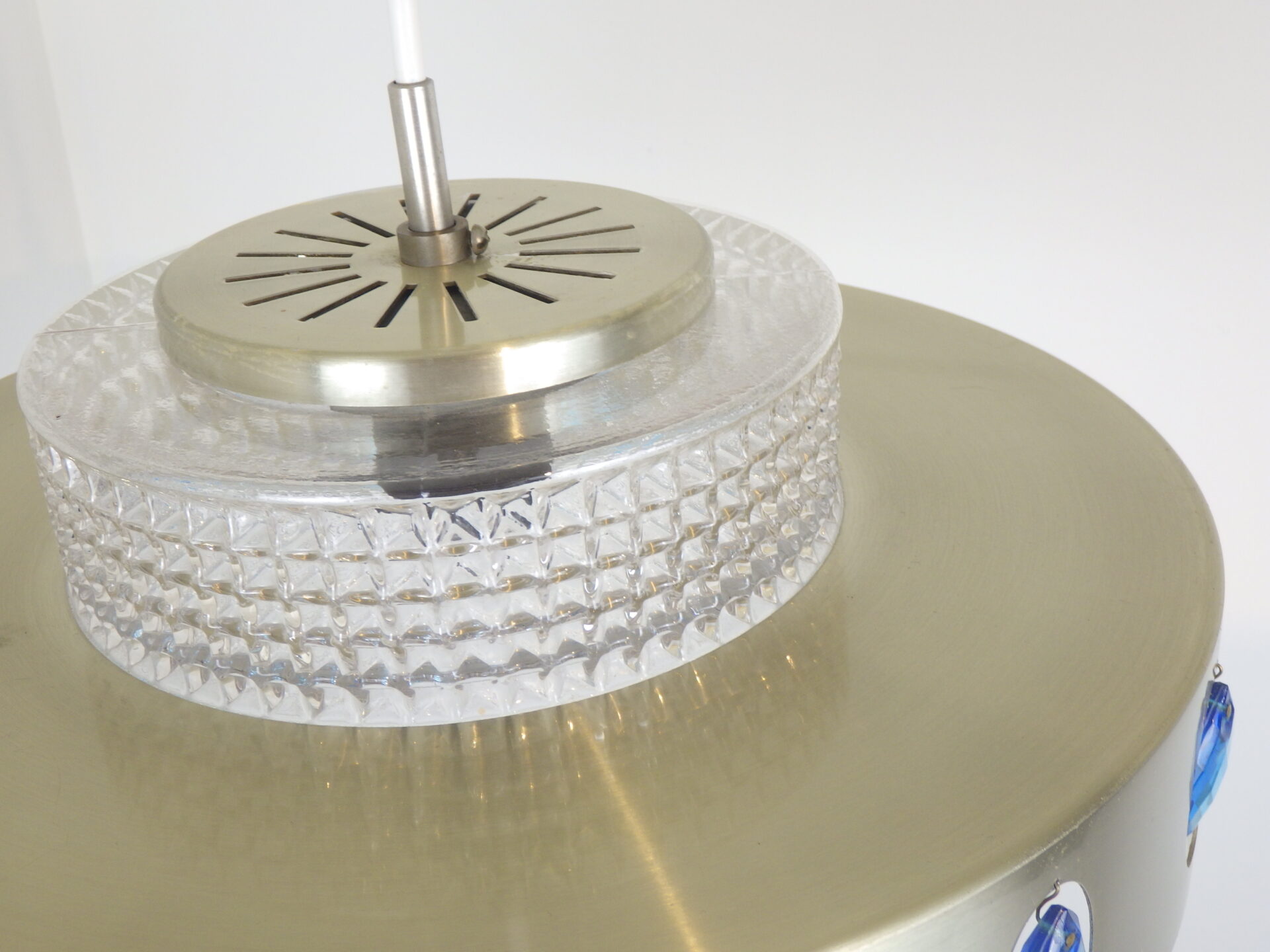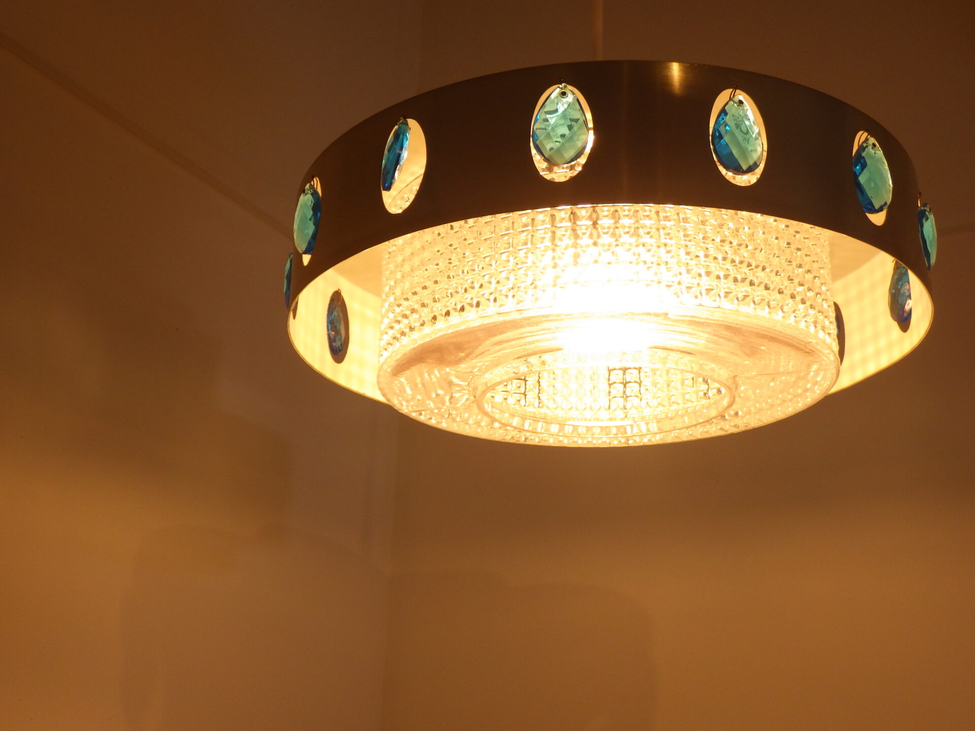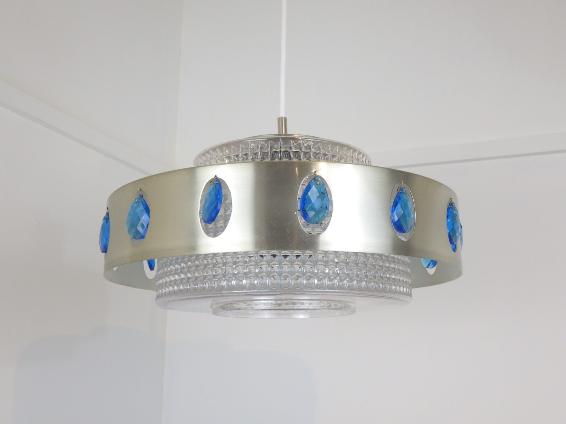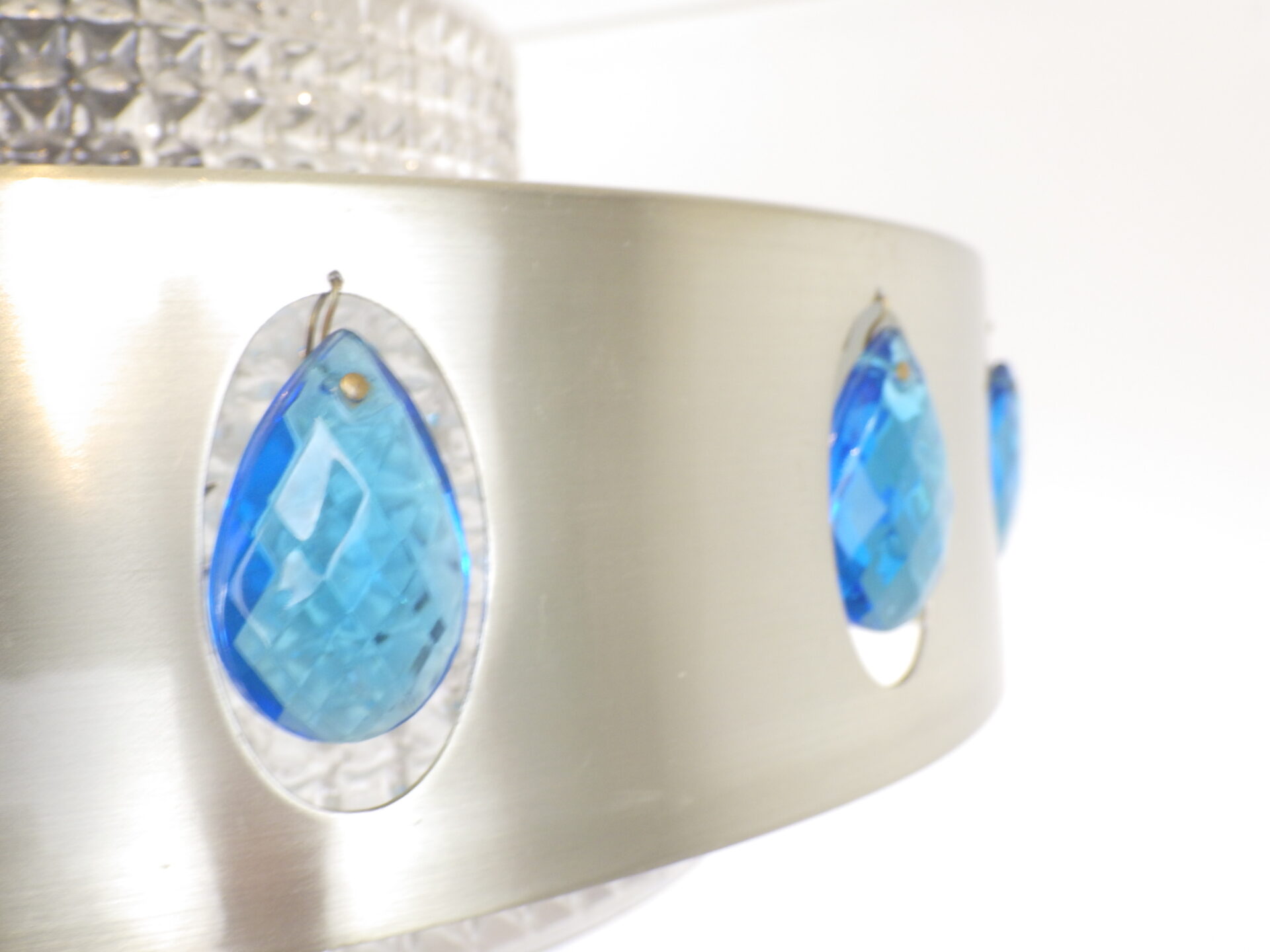 | ヨーロッパで買い付けました。 1948年創業「Vitrika社」のビンテージペンダントランプです。 シルバーのシェードの側面に、ブルーのアクリル飾りが施されており、点灯すると宝石のようにきらきらと透き通ってとても綺麗に輝きます。 シルバーのシェードを突き抜ける形で内側についているガラスのシェードは、分厚く、細かなカットが施されています。 こちらも点灯すると幾重にも反射して、優しい光を放ちます。 消灯時でも十分なゴージャスさを発揮してくれるデザインですので、昼間もインテリアのアクセントとして空間を彩ってくれること間違いないしでしょう。 |