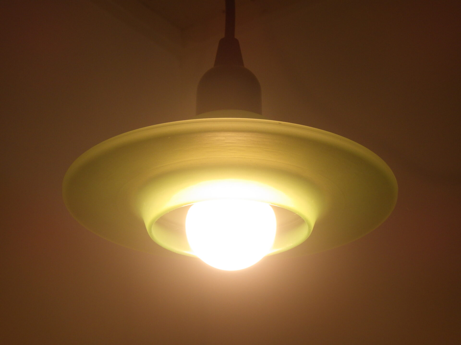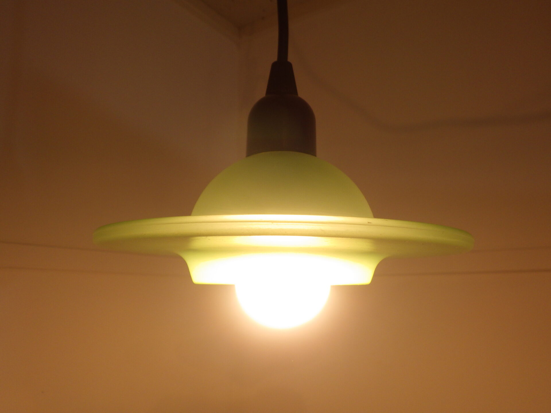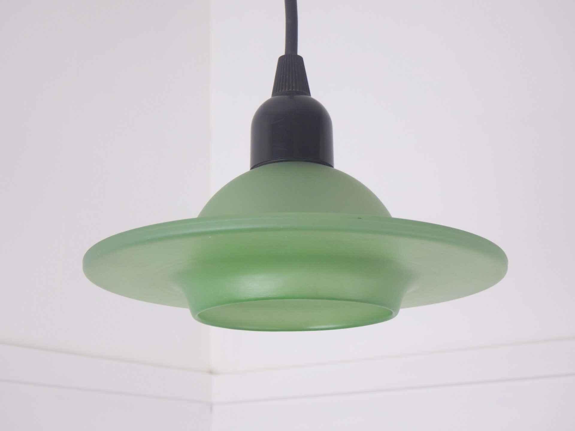 | ヨーロッパで買い付けしました。 手のひらサイズの小ぶりなガラスシェードが可愛い、デンマークのペンダントランプです。 UFOのような形のガラスシェードはかなり厚みがあり、フロスト加工されています。 灯りをつけるとふんわりと光が広がり、良い雰囲気です。 小ぶりなので、ダイニング、キッチン、ちょっとした作業スペースなど様々な空間でご使用いただけそうです。 |