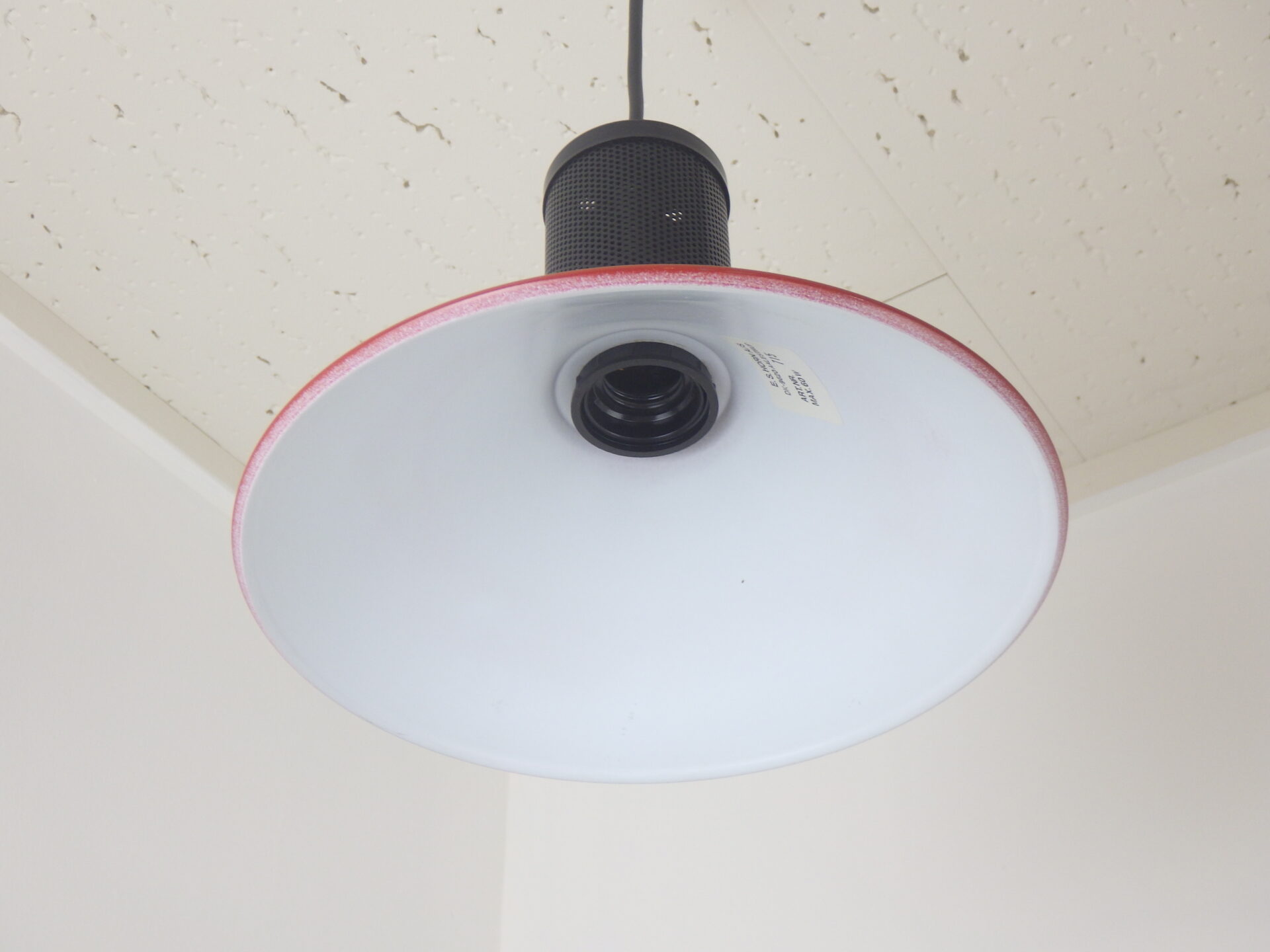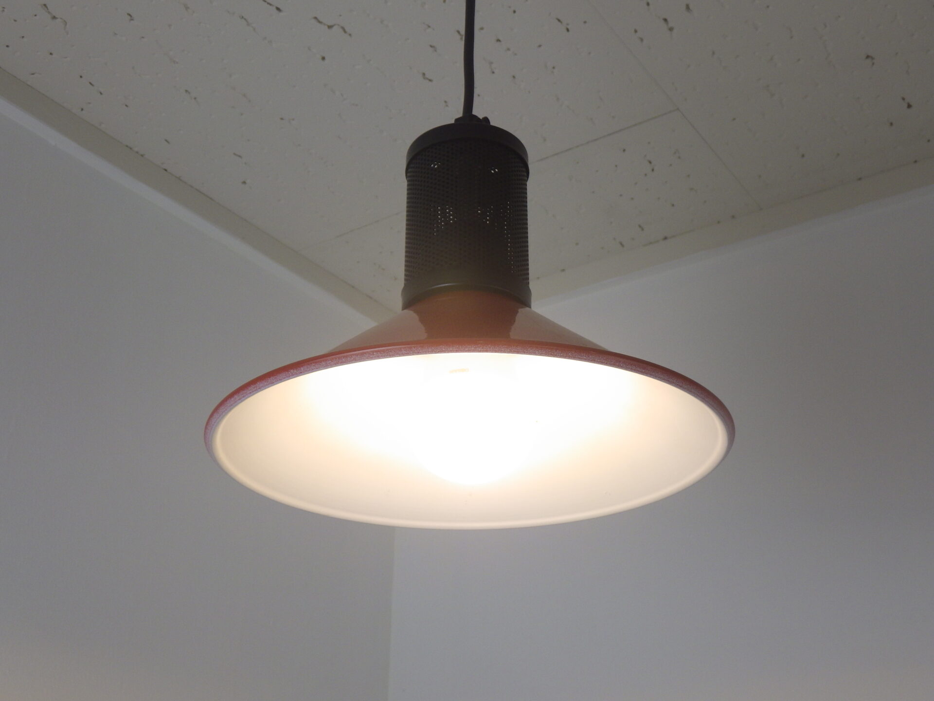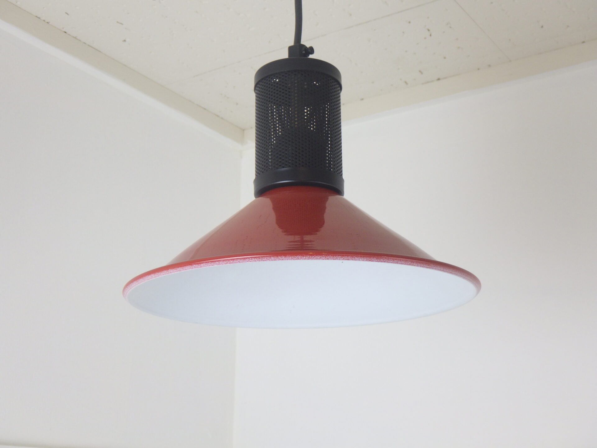 | ヨーロッパで買い付けしました。 E.S.HORN(E.Sホーン)製のペンダントランプです。 1952年に創業し、60~70年代にかけて急成長をとげたデンマークのブランドです。 レッドに塗装されたアルミシェードと、トップについた黒のメッシュのカバーとのコントラストが印象的ですね。 小ぶりなのでわずかなスペースにも吊り下げられますし、ダウンライトと併用してダイニングや寝室などにも合わせられます。 (電球サイズ E26 LED電球対応) |