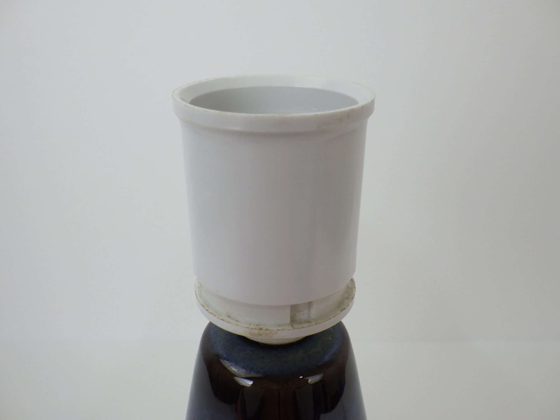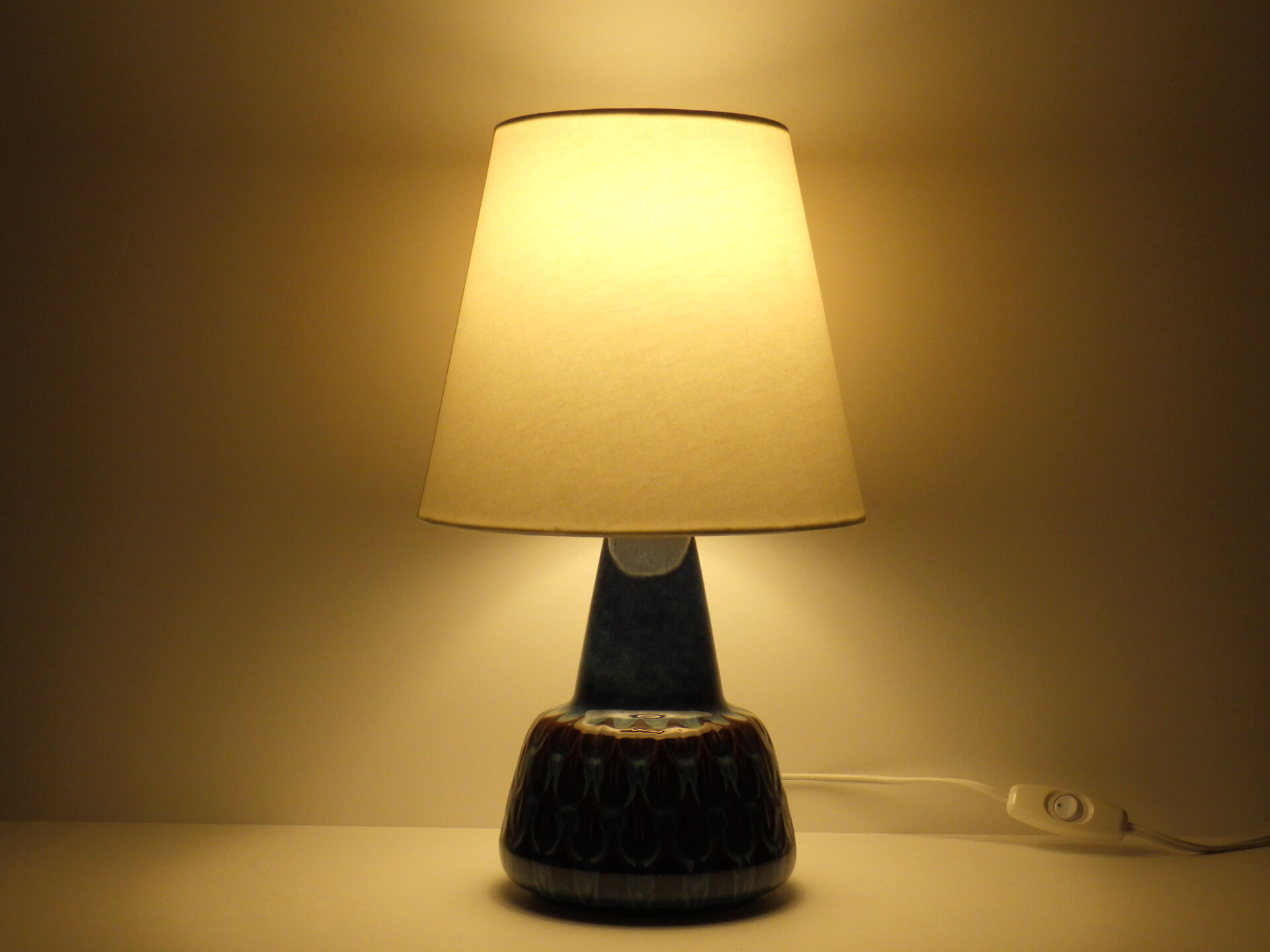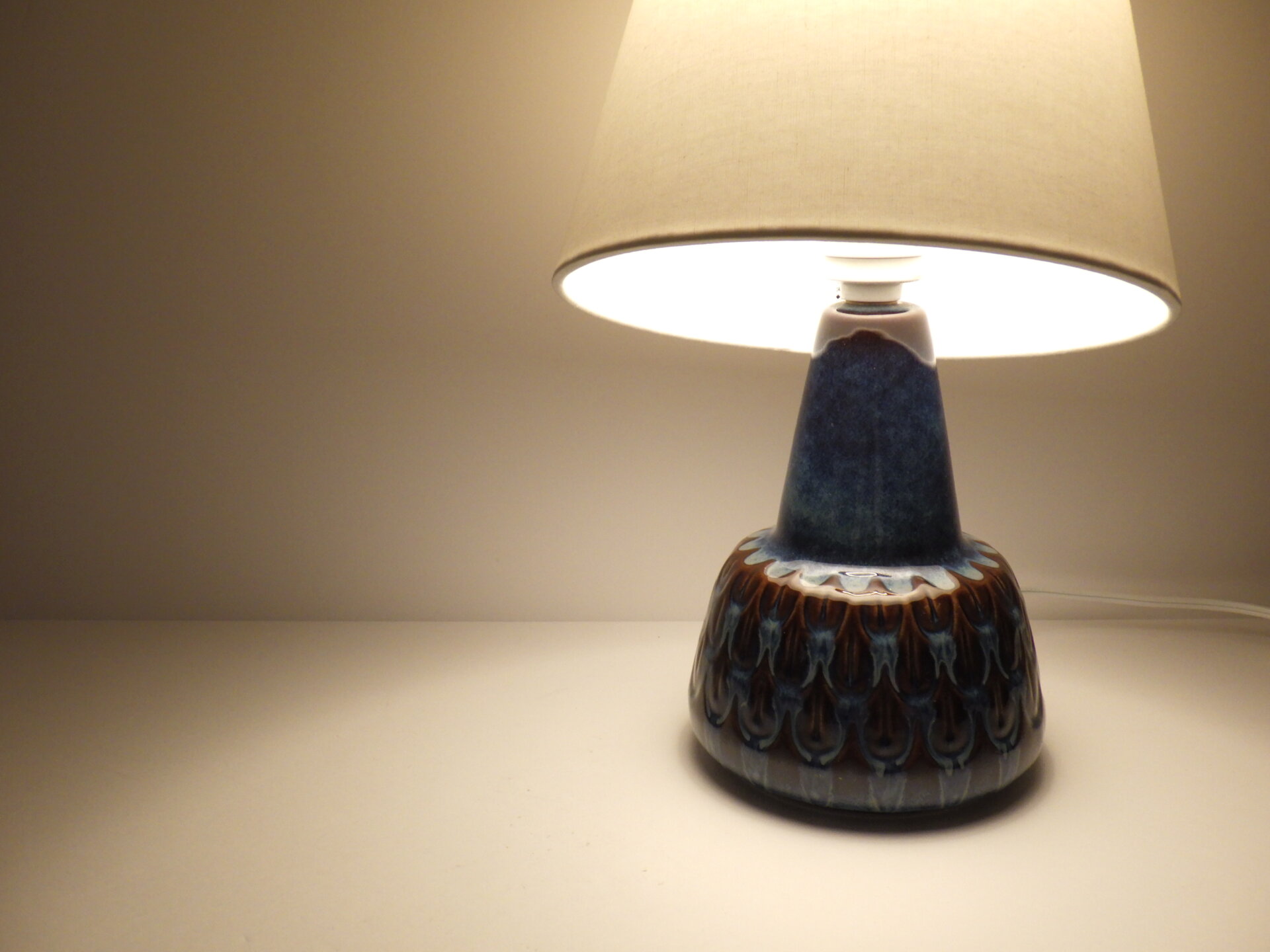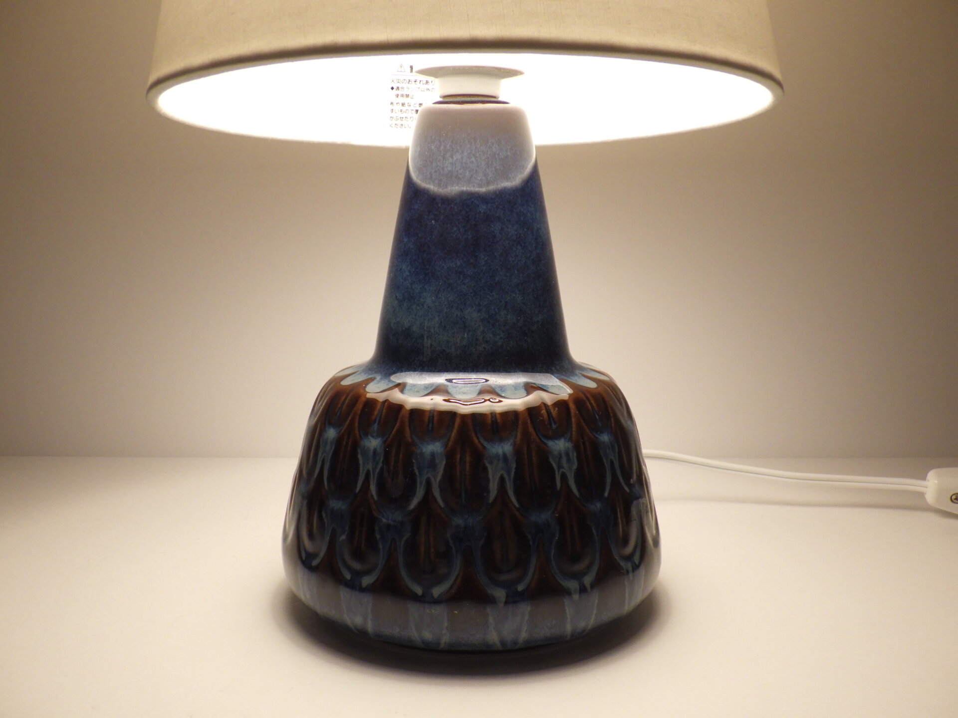 | ヨーロッパで買い付けました。 デンマーク、ボーンホルム島で1835年に創業した「Soholm」のテーブルランプです。 こちらはスーホルムで多くのデザインを手掛けたEinar Johansenのデザイン。 羽のような模様と、深みのあるブルーとブラウンが混ざり合う独特な釉薬の表情が美しい逸品。 光が当たることで釉薬の濃淡が美しく浮かび上がり、点灯時・消灯時で異なる表情を楽しめます。 土のあたたかみを残しつつもモダンな佇まいなので、北欧インテリアはもちろん、USミッドセンチュリーや和の空間にも自然に溶け込みます。 小ぶりながらも存在感があり、置くだけで空間の温度が一段上がるような、北欧陶器ならではの質感と美しさが際立つランプですね。 コード部分のスイッチでON/OFFが切り替えられます。 (電球の口金サイズ:E26 LED対応) |