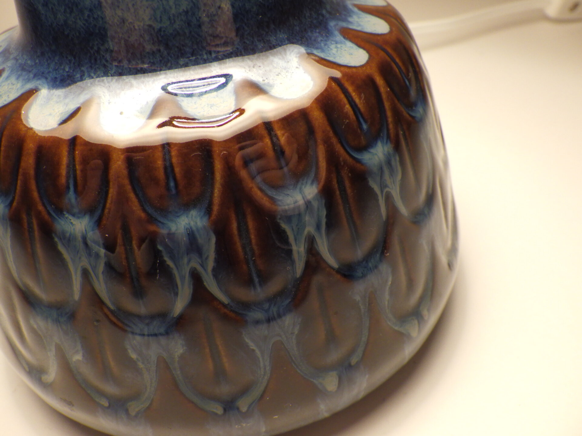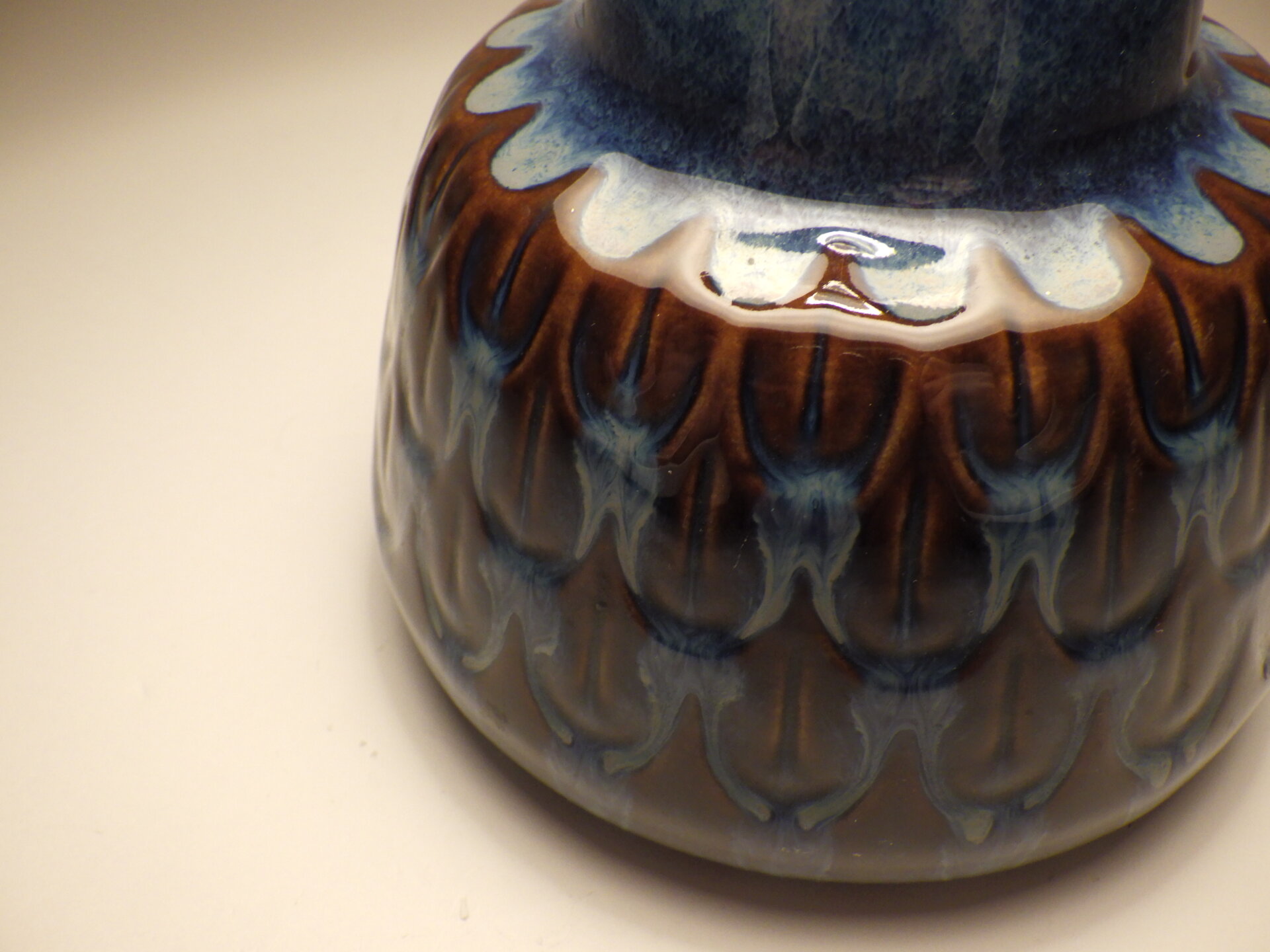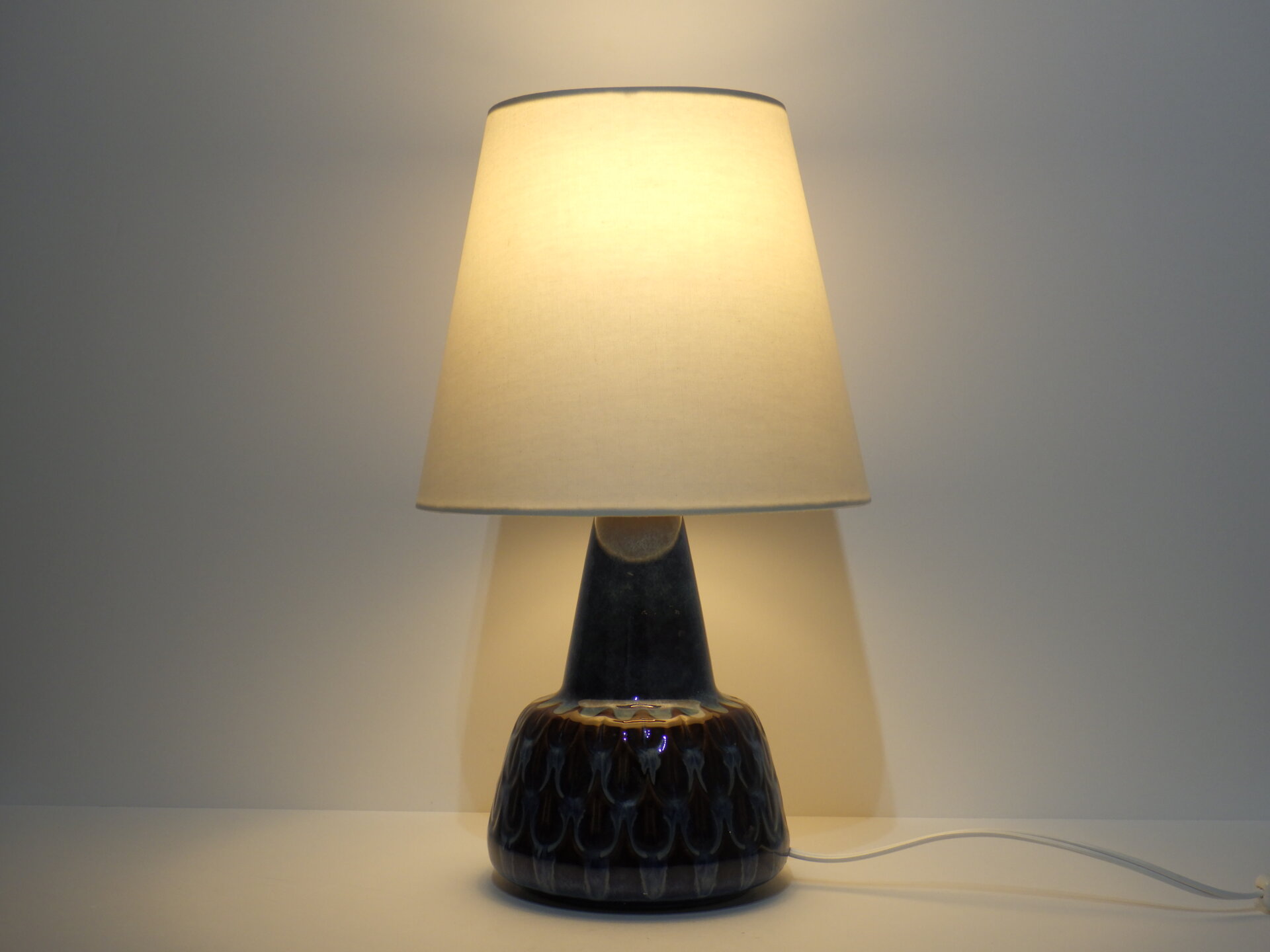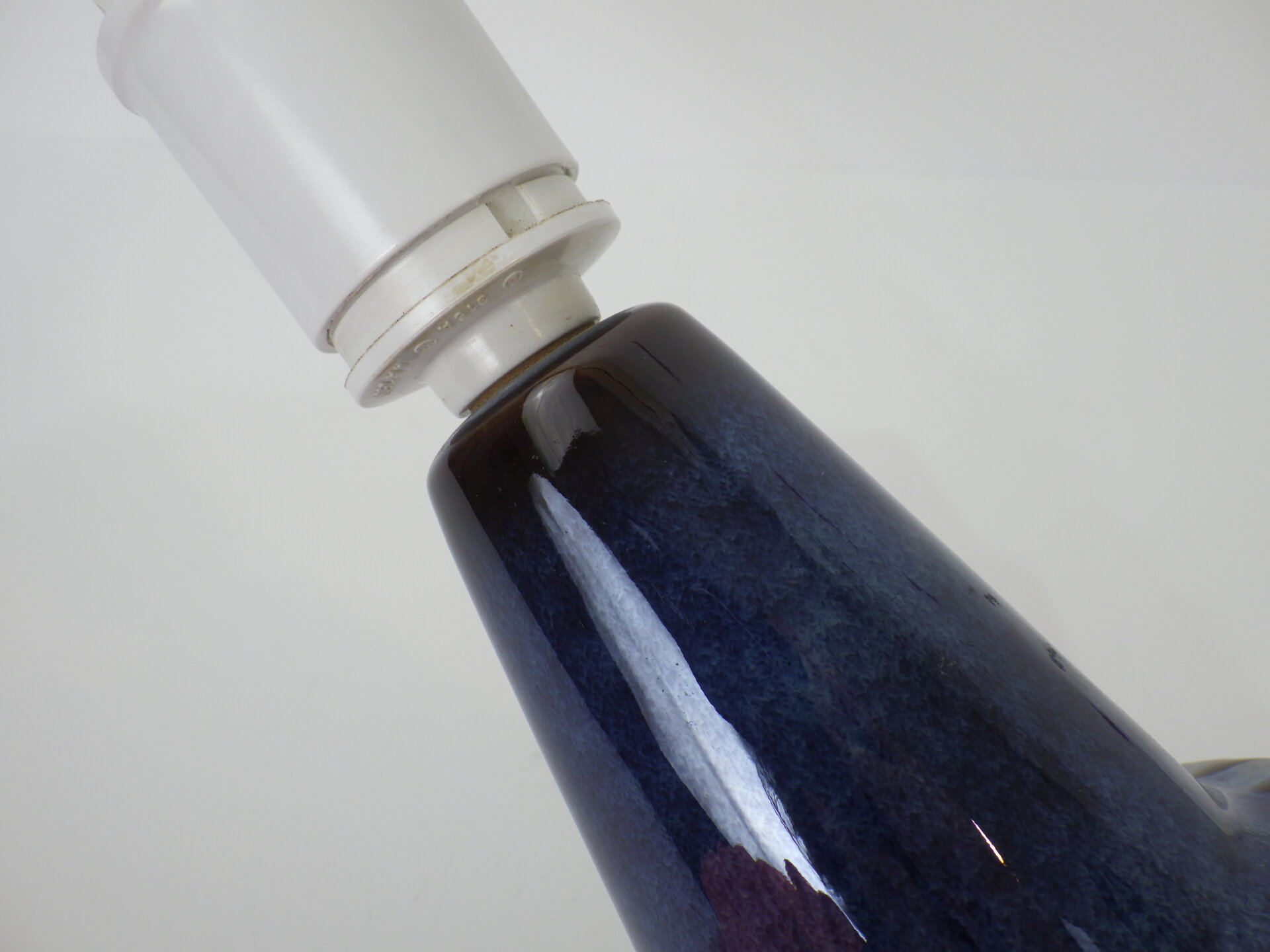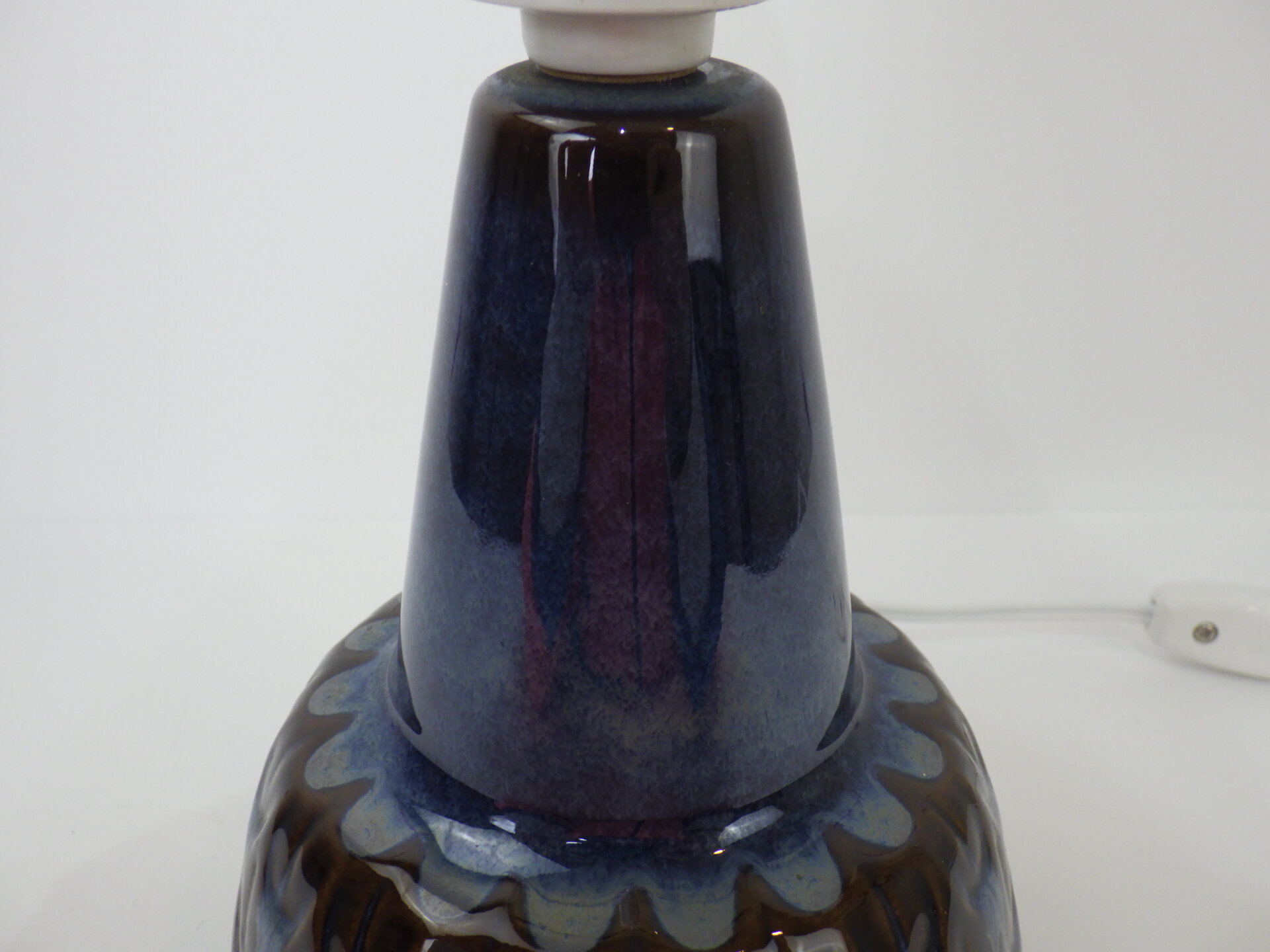 | ヨーロッパで買い付けました。 デンマーク、ボーンホルム島で1835年に創業した「Soholm」のテーブルランプです。 こちらはスーホルムで多くのデザインを手掛けたEinar Johansenのデザイン。 羽のような模様と、深みのあるブルーとブラウンが混ざり合う独特な釉薬の表情が美しい逸品。 光が当たることで釉薬の濃淡が美しく浮かび上がり、点灯時・消灯時で異なる表情を楽しめます。 土のあたたかみを残しつつもモダンな佇まいなので、北欧インテリアはもちろん、USミッドセンチュリーや和の空間にも自然に溶け込みます。 小ぶりながらも存在感があり、置くだけで空間の温度が一段上がるような、北欧陶器ならではの質感と美しさが際立つランプですね。 コード部分のスイッチでON/OFFが切り替えられます。 (電球の口金サイズ:E26 LED対応) |