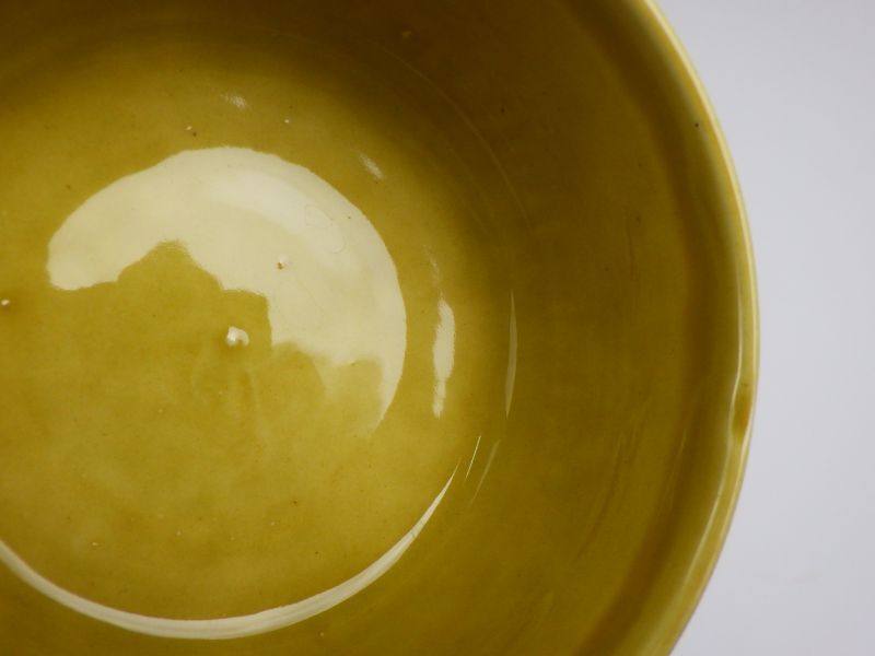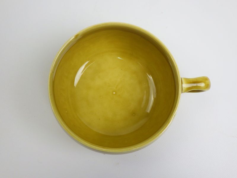 | 1939年から1959年に製造されたSteubenville(スチューベンヴィル)社製のアメリカンモダンシリーズです。 丸みがあり、縁がぽってりしているデザインで、とても可愛いですね。 シャルトリューズはフランスを代表するリキュールの一つで、輝くようなイエローが綺麗ですね。 |