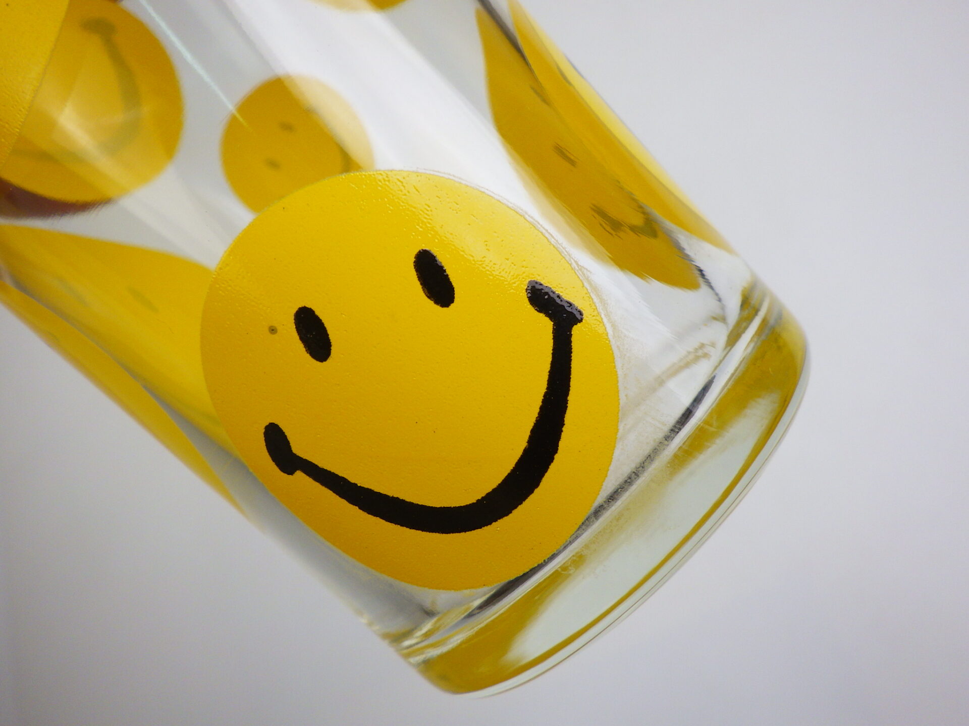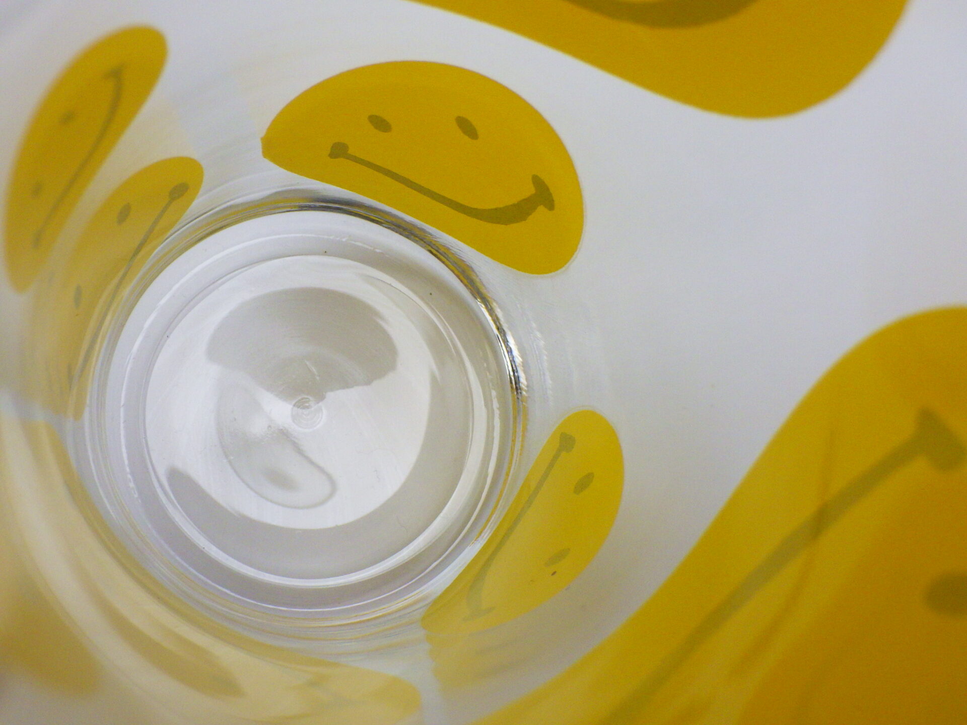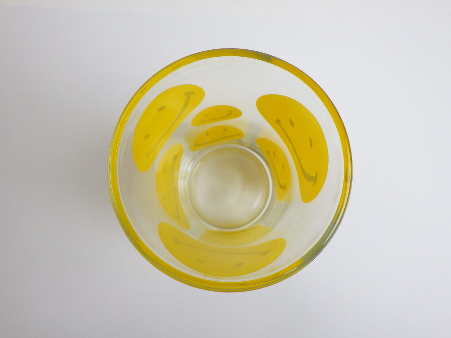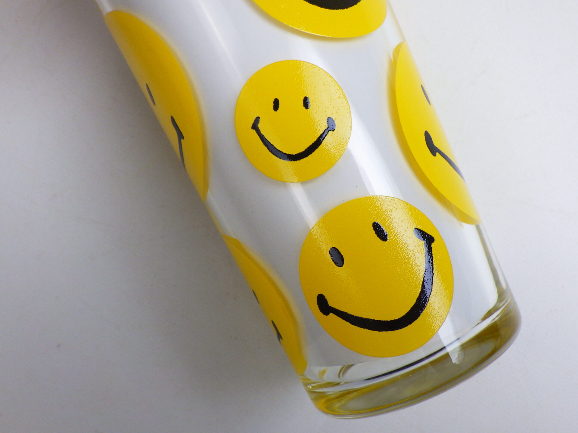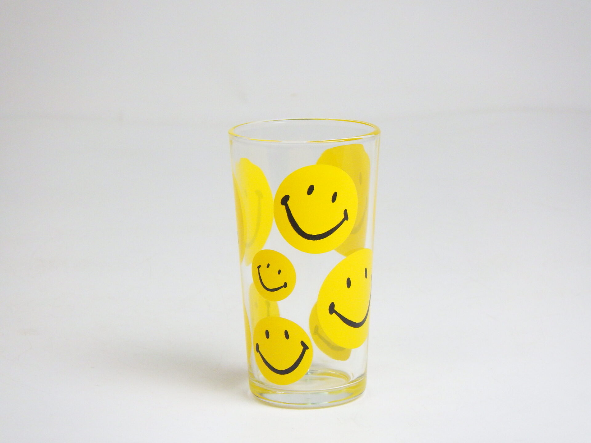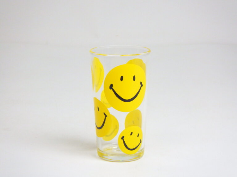 | スマイリーフェイスが沢山プリントされたヘーゼルアトラスのタンブラーです。 黄色の他に、赤、青、緑が存在します。 刻印はHAではなくCCC。後期ヘーゼルアトラスの親会社のものです。 |