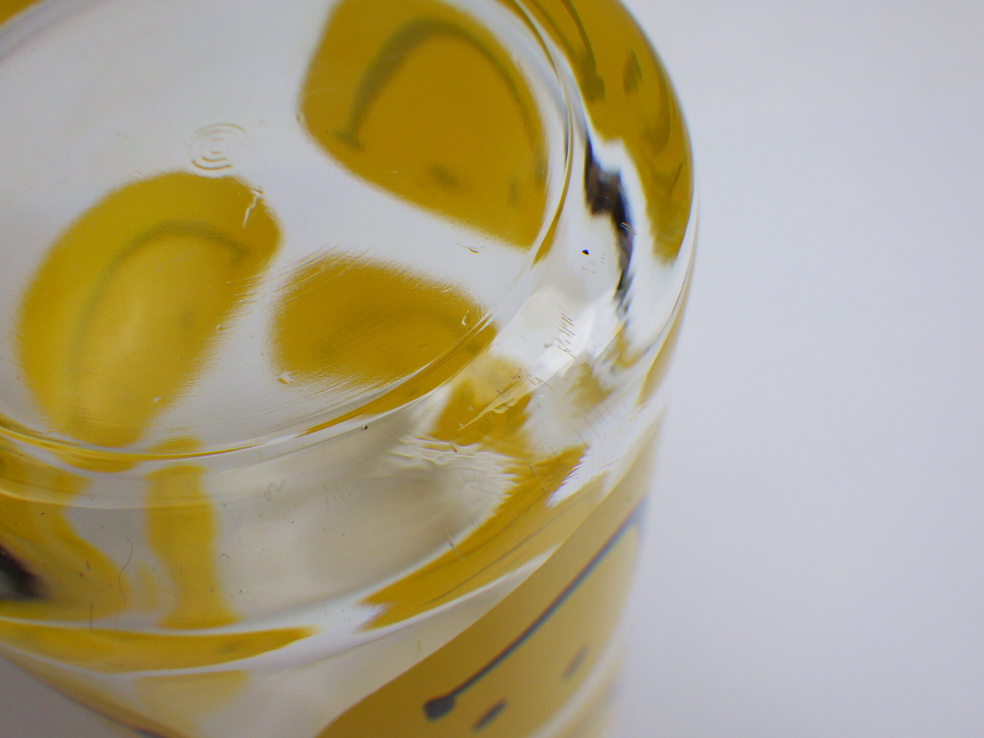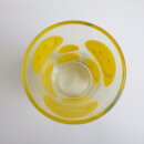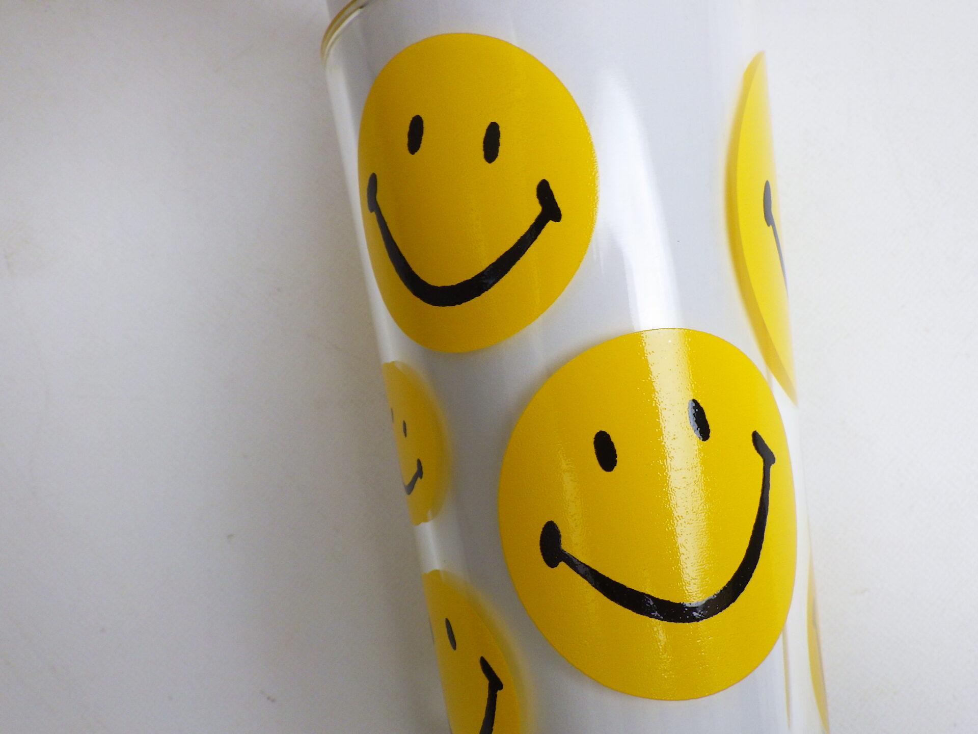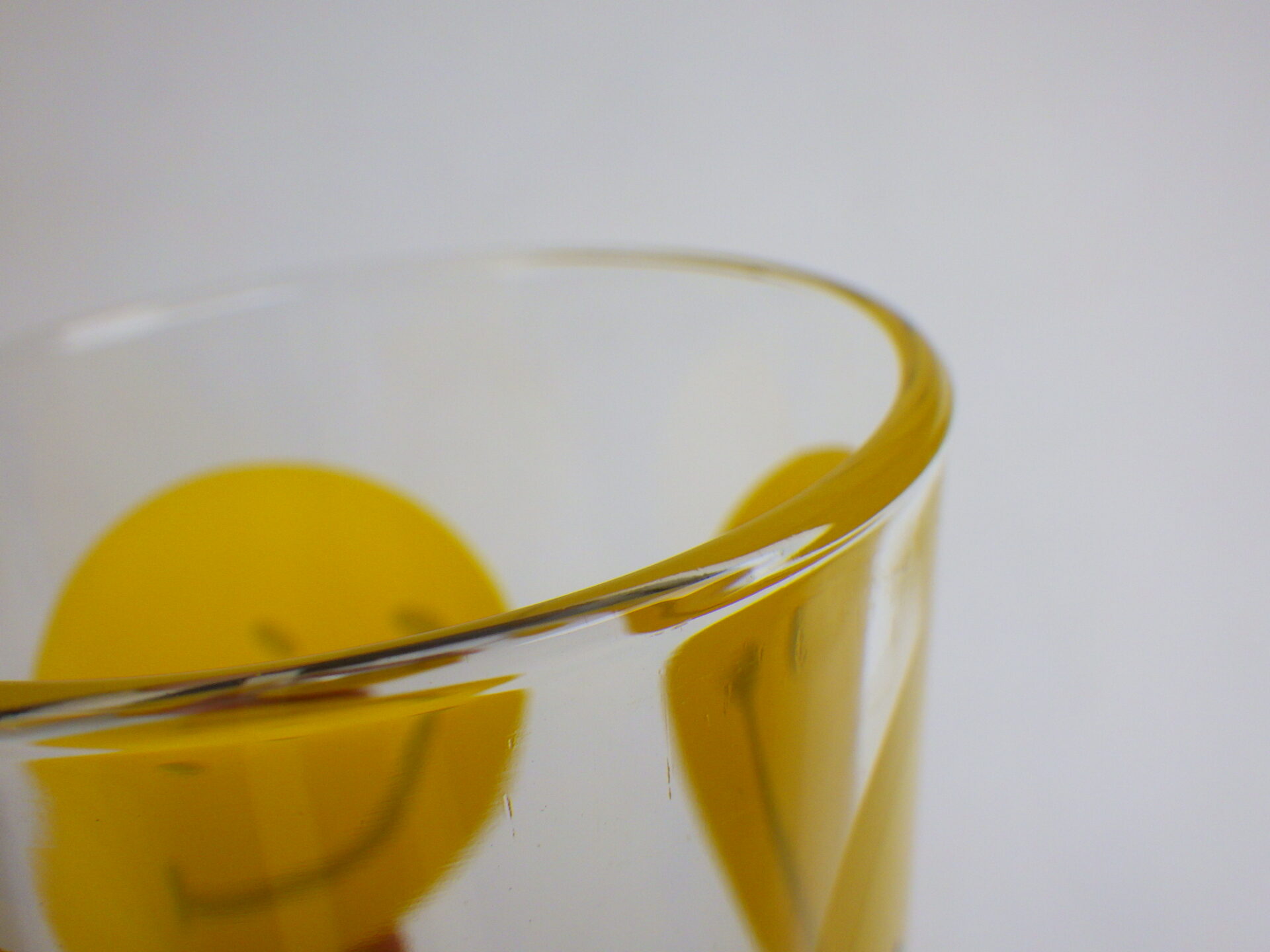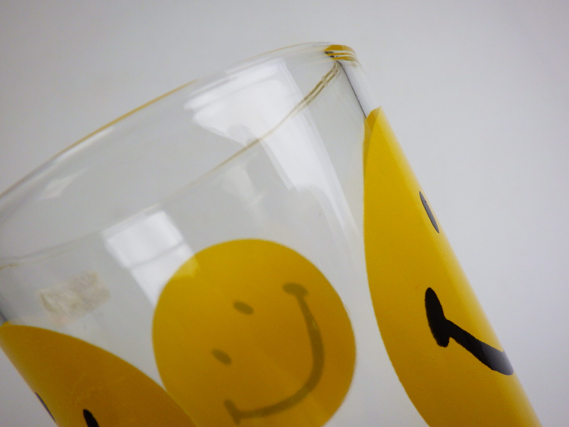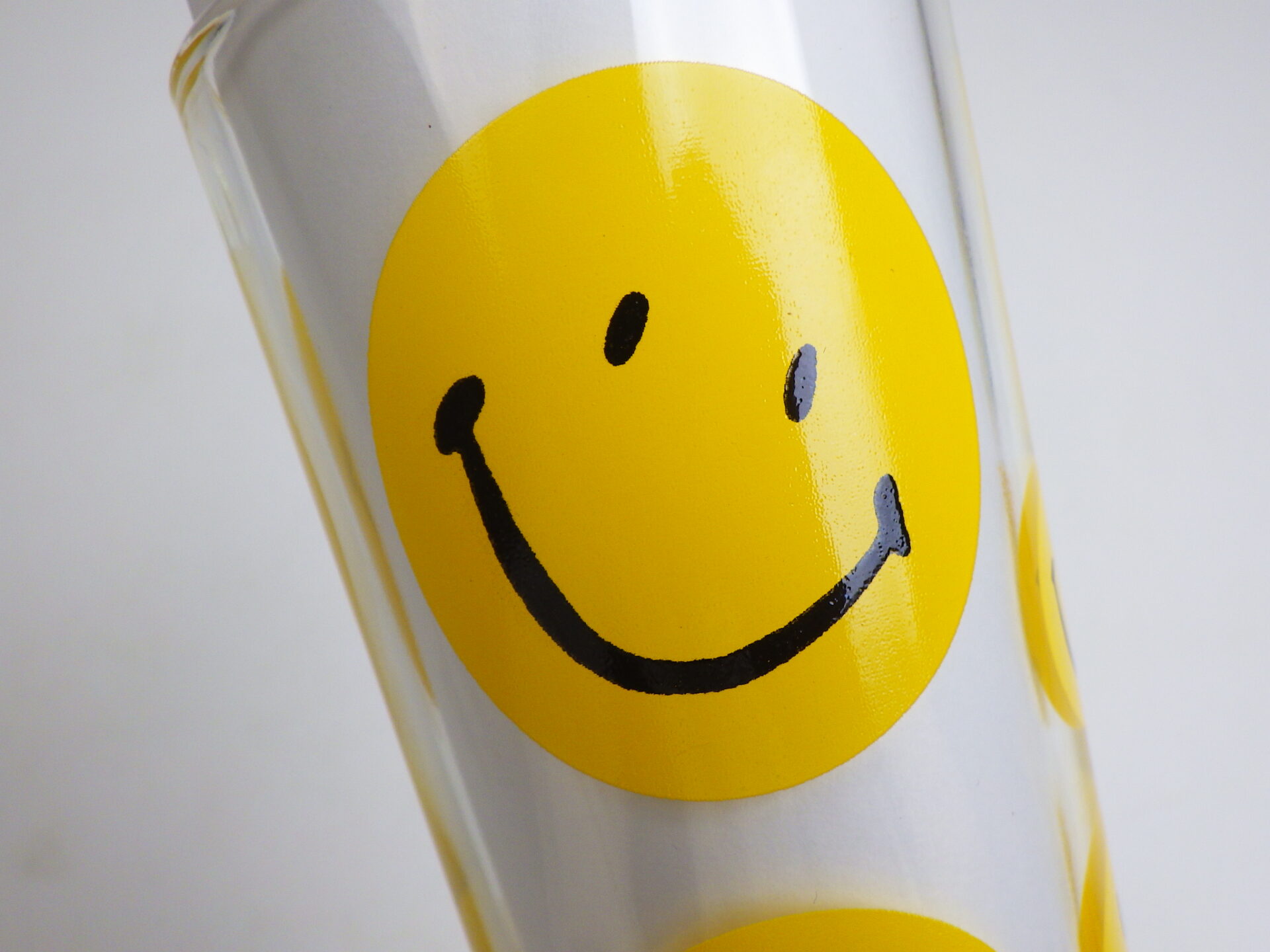 | スマイリーフェイスが沢山プリントされたヘーゼルアトラスのタンブラーです。 黄色の他に、赤、青、緑が存在します。 刻印はHAではなくCCC。後期ヘーゼルアトラスの親会社のものです。 |