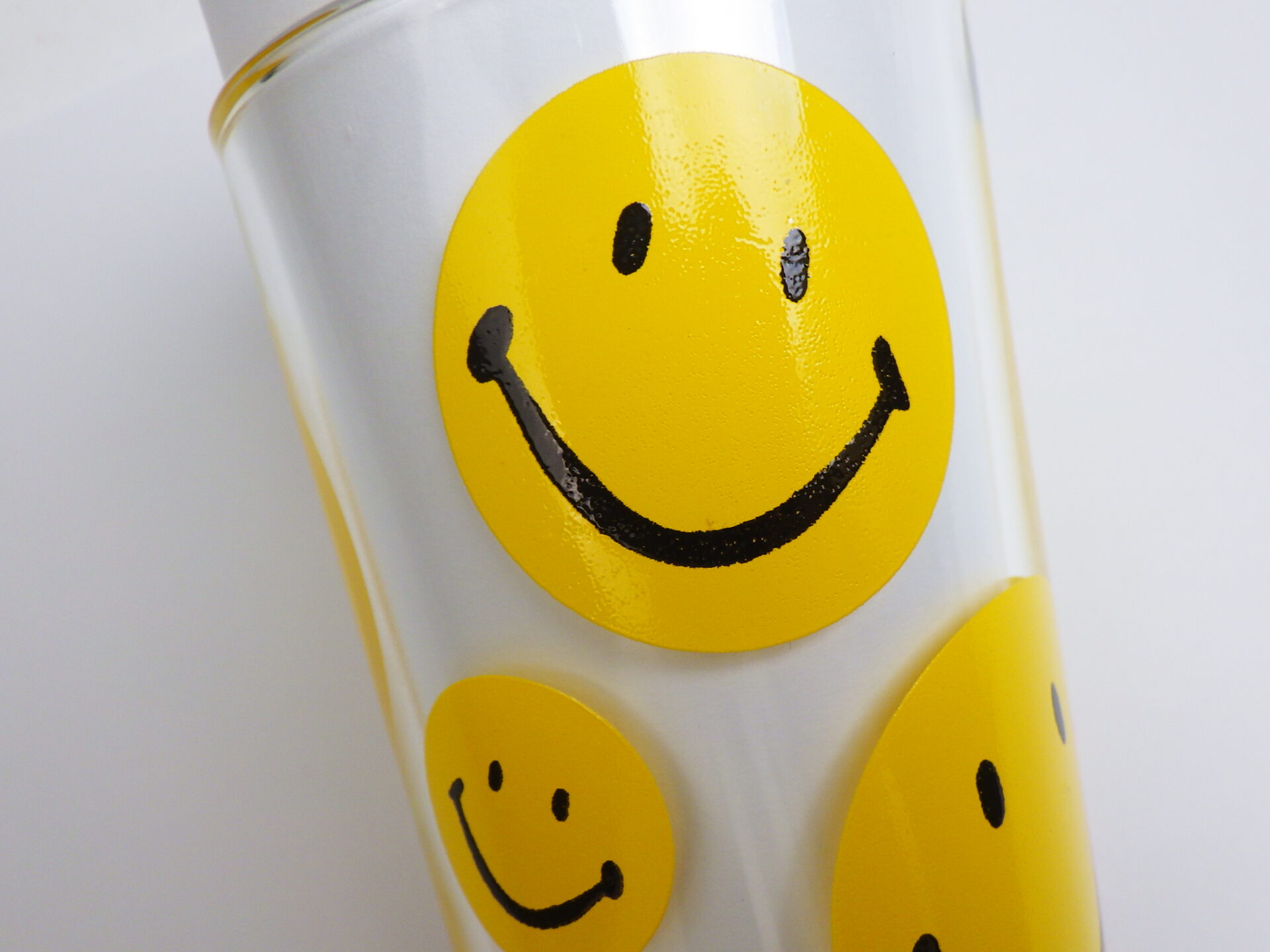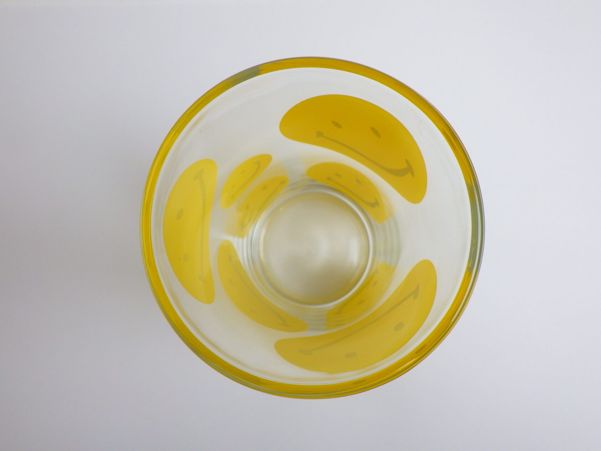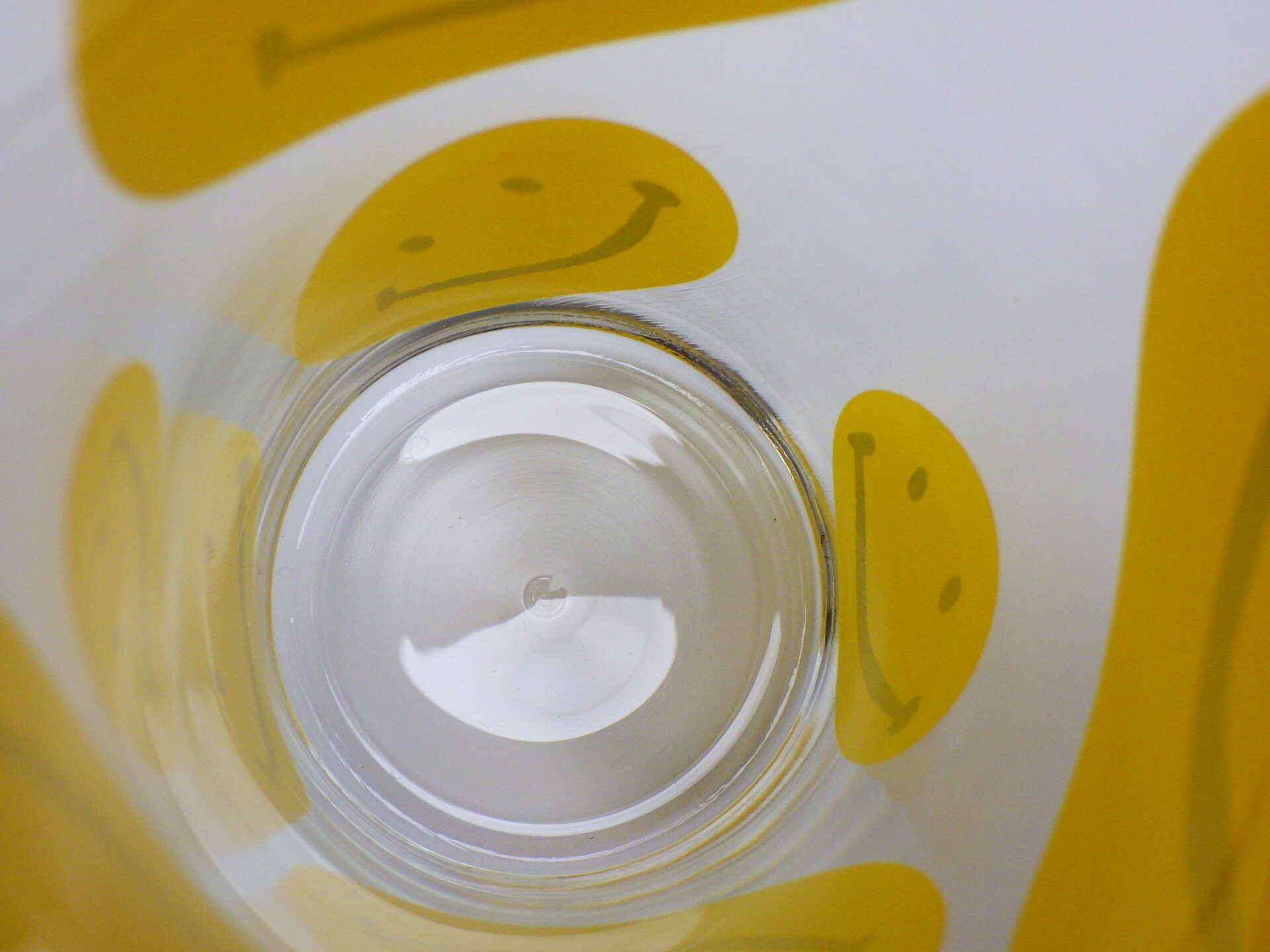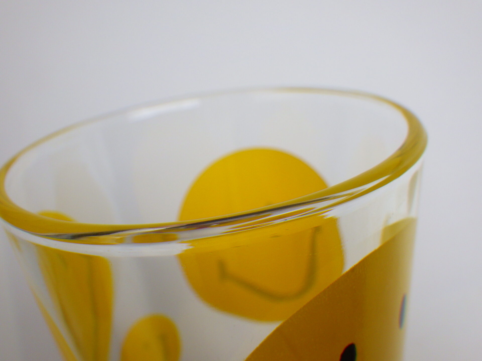 | スマイリーフェイスが沢山プリントされたヘーゼルアトラスのタンブラーです。 黄色の他に、赤、青、緑が存在します。 刻印はHAではなくCCC。後期ヘーゼルアトラスの親会社のものです。 |