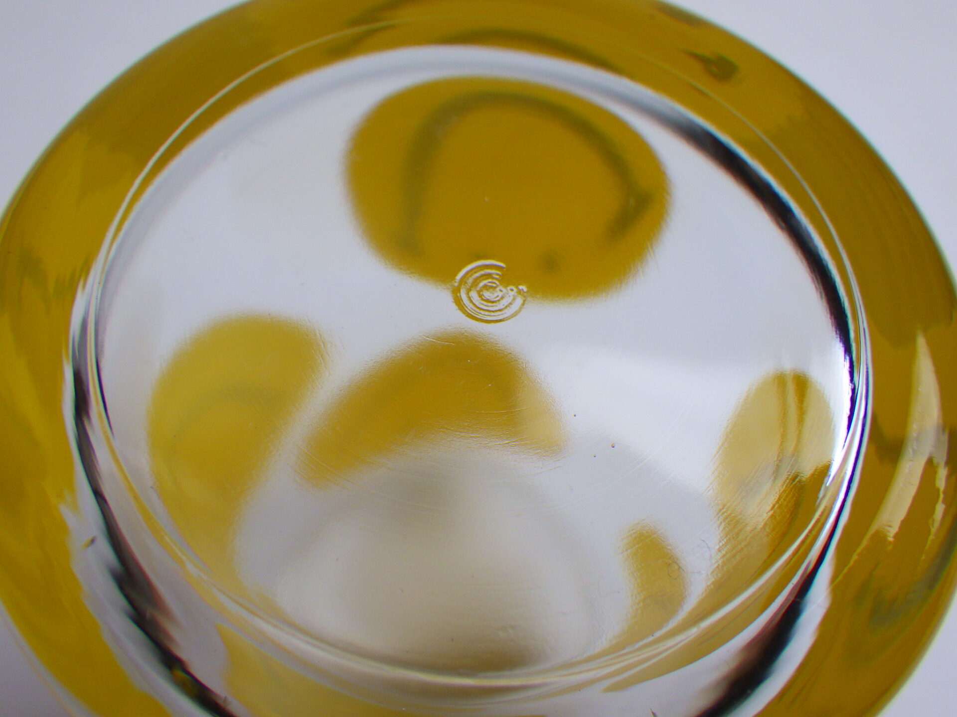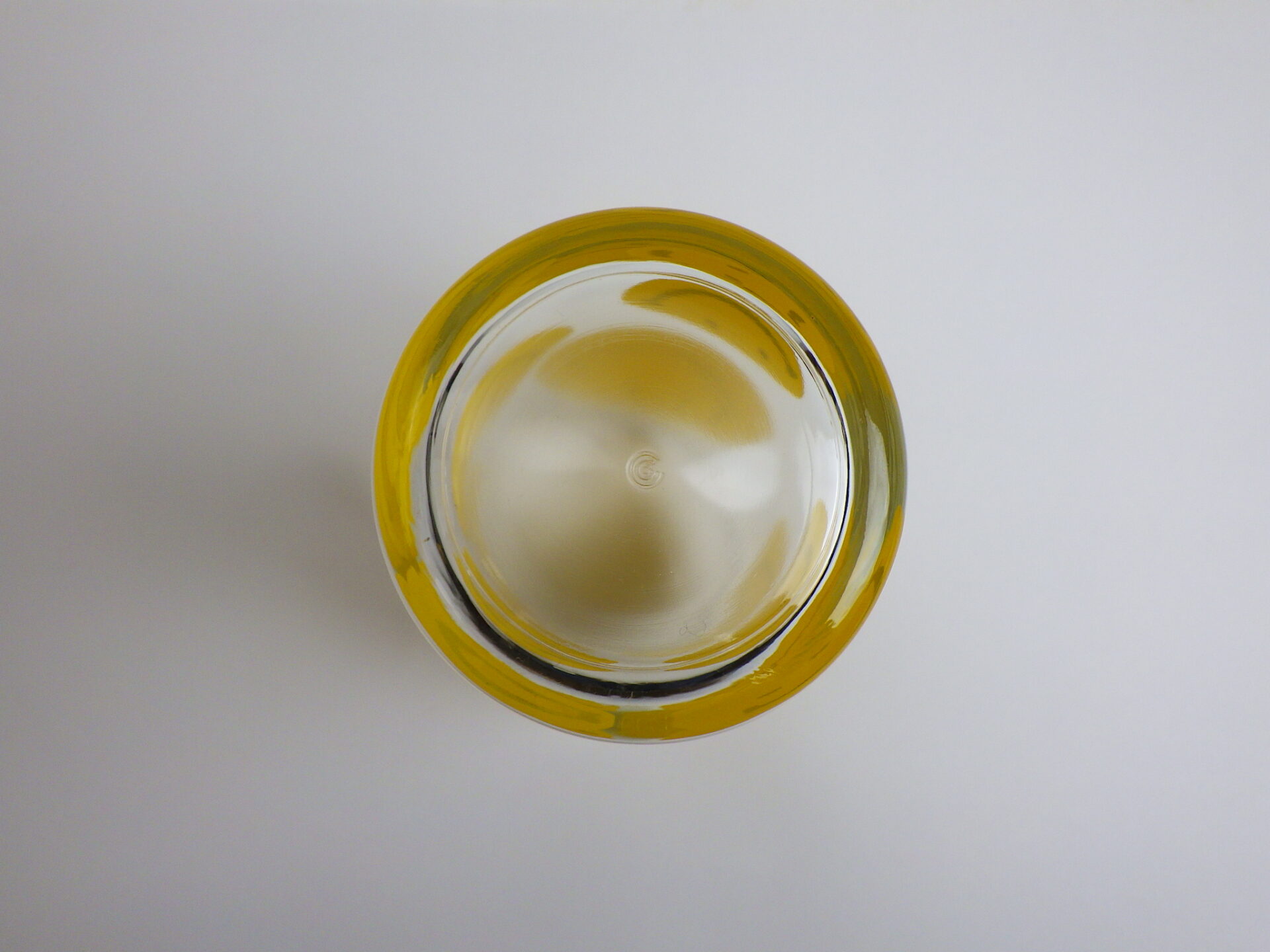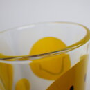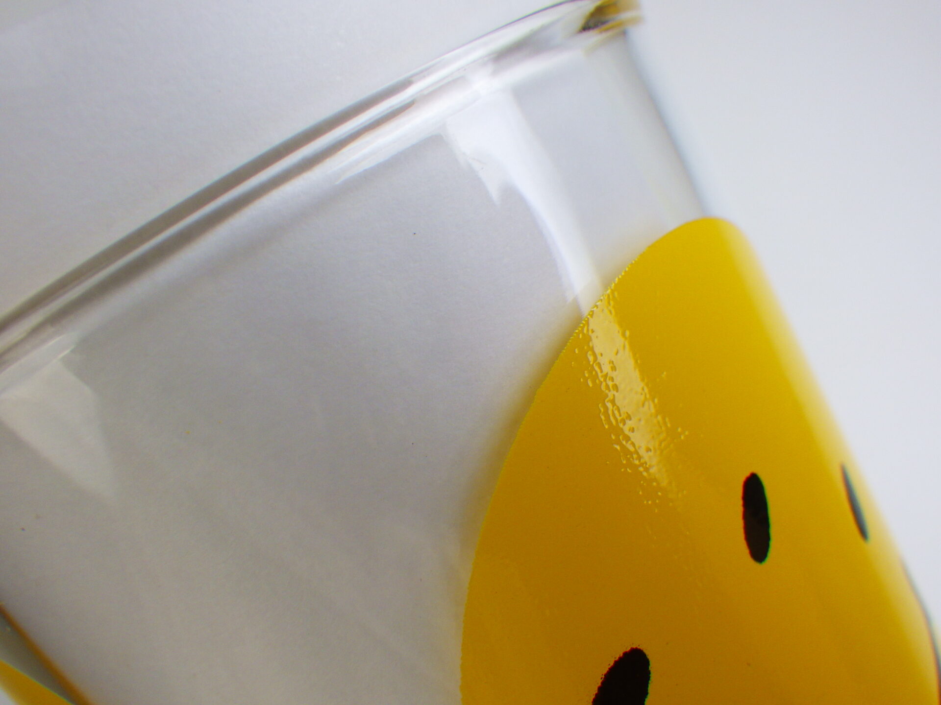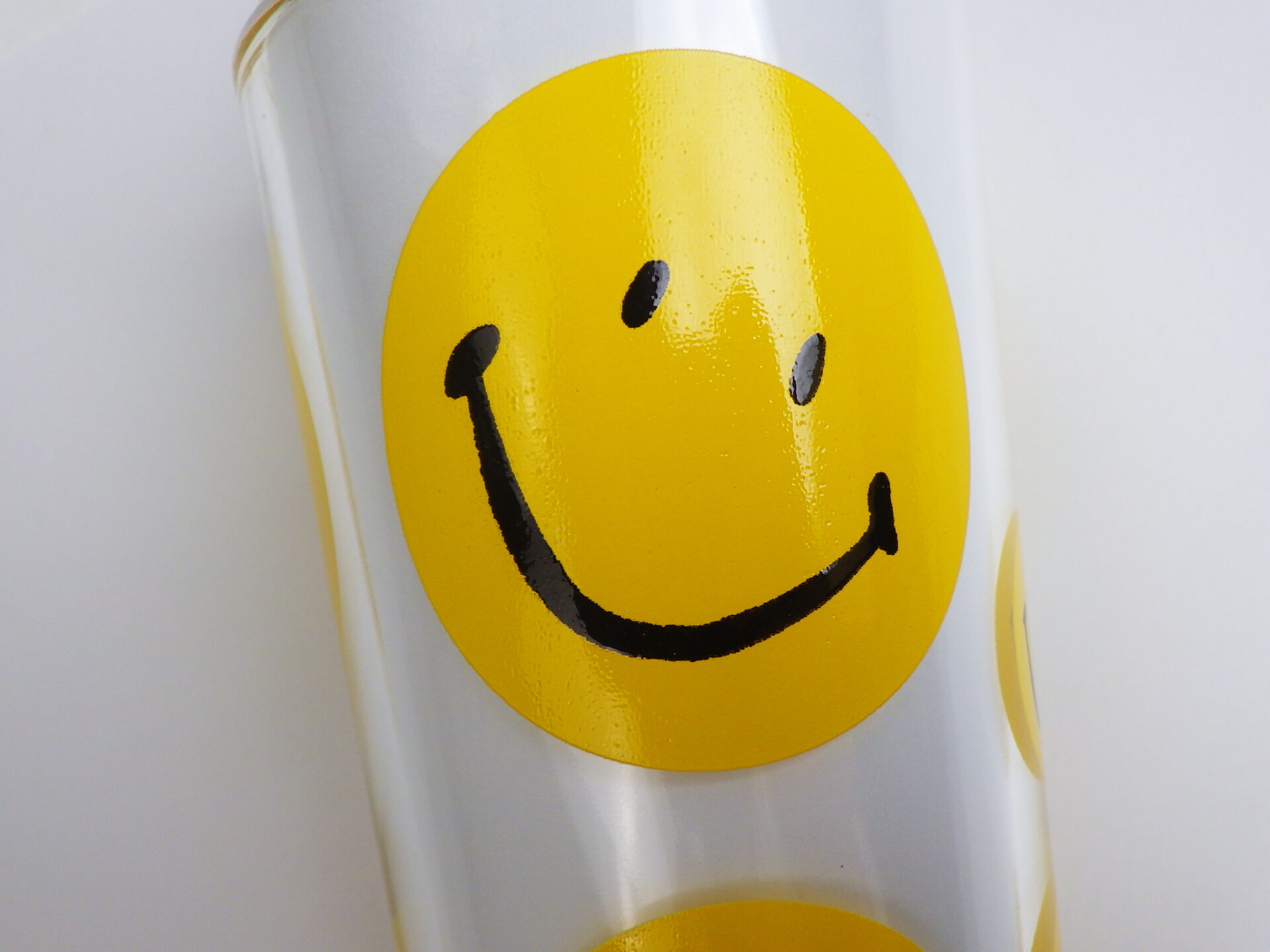 | スマイリーフェイスが沢山プリントされたヘーゼルアトラスのタンブラーです。 黄色の他に、赤、青、緑が存在します。 刻印はHAではなくCCC。後期ヘーゼルアトラスの親会社のものです。 |