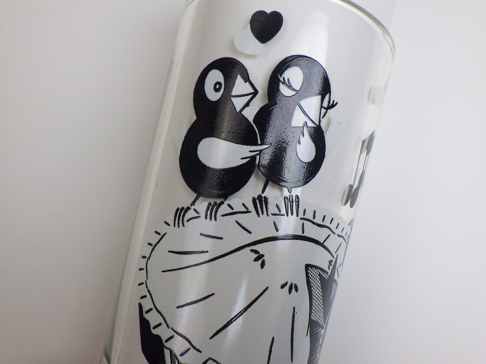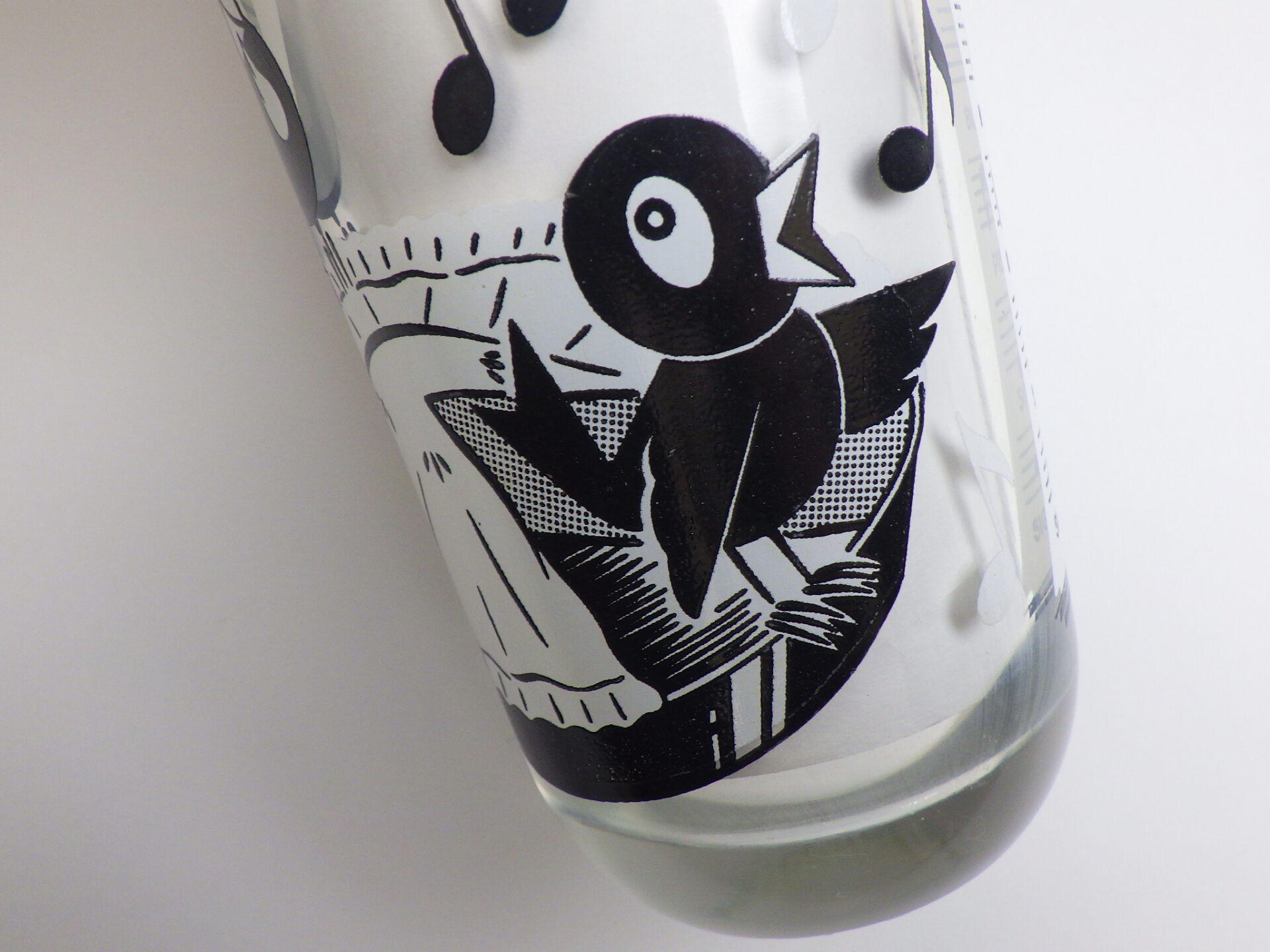 | マザーグースの中でも五指に入るほど愛唱されている「6ペンスの唄」がモチーフのビンテージグラスです。 パイから飛び出した黒ツグミの歌う表情が、とても可愛らしいアイテムですね。 |