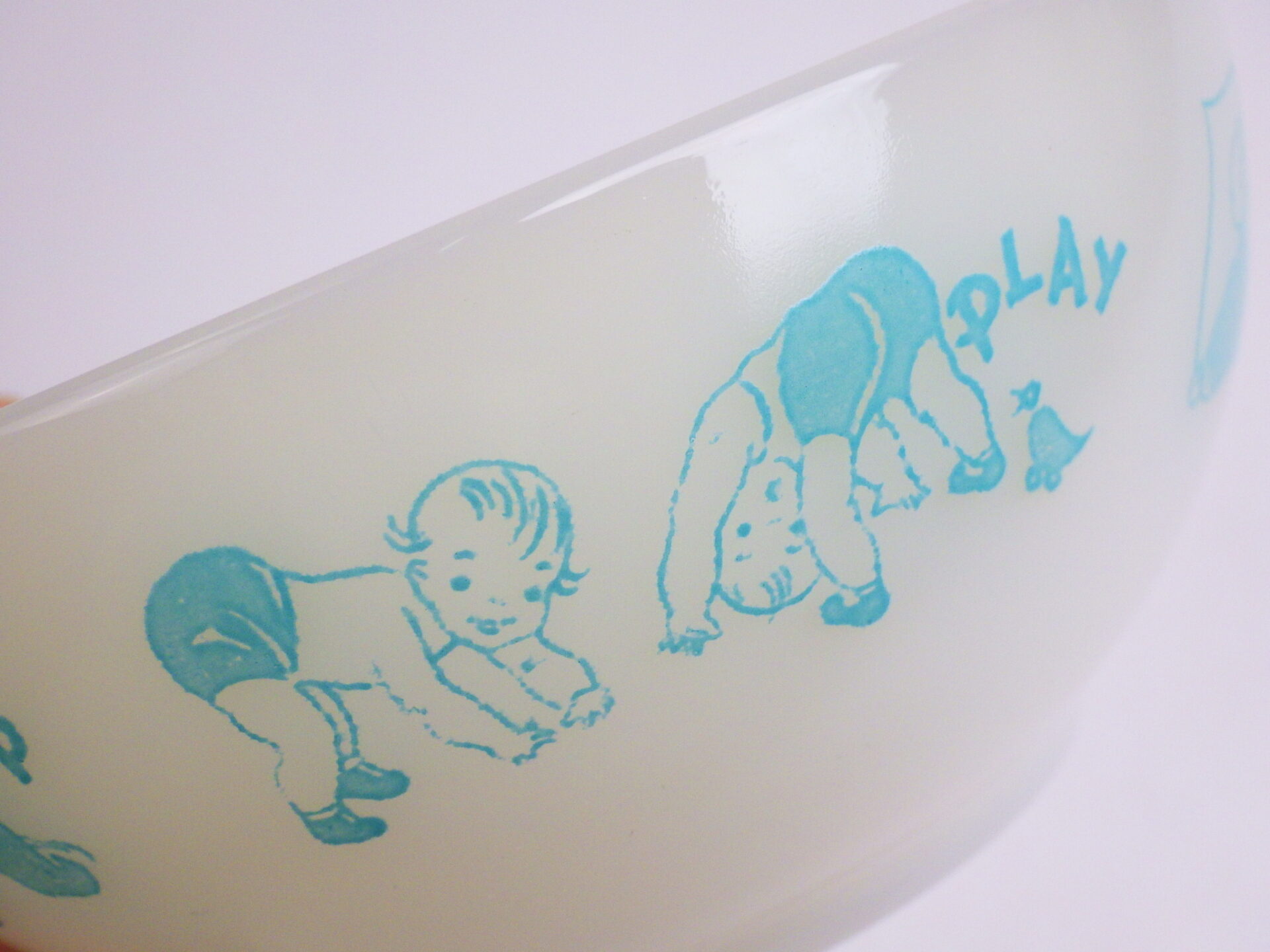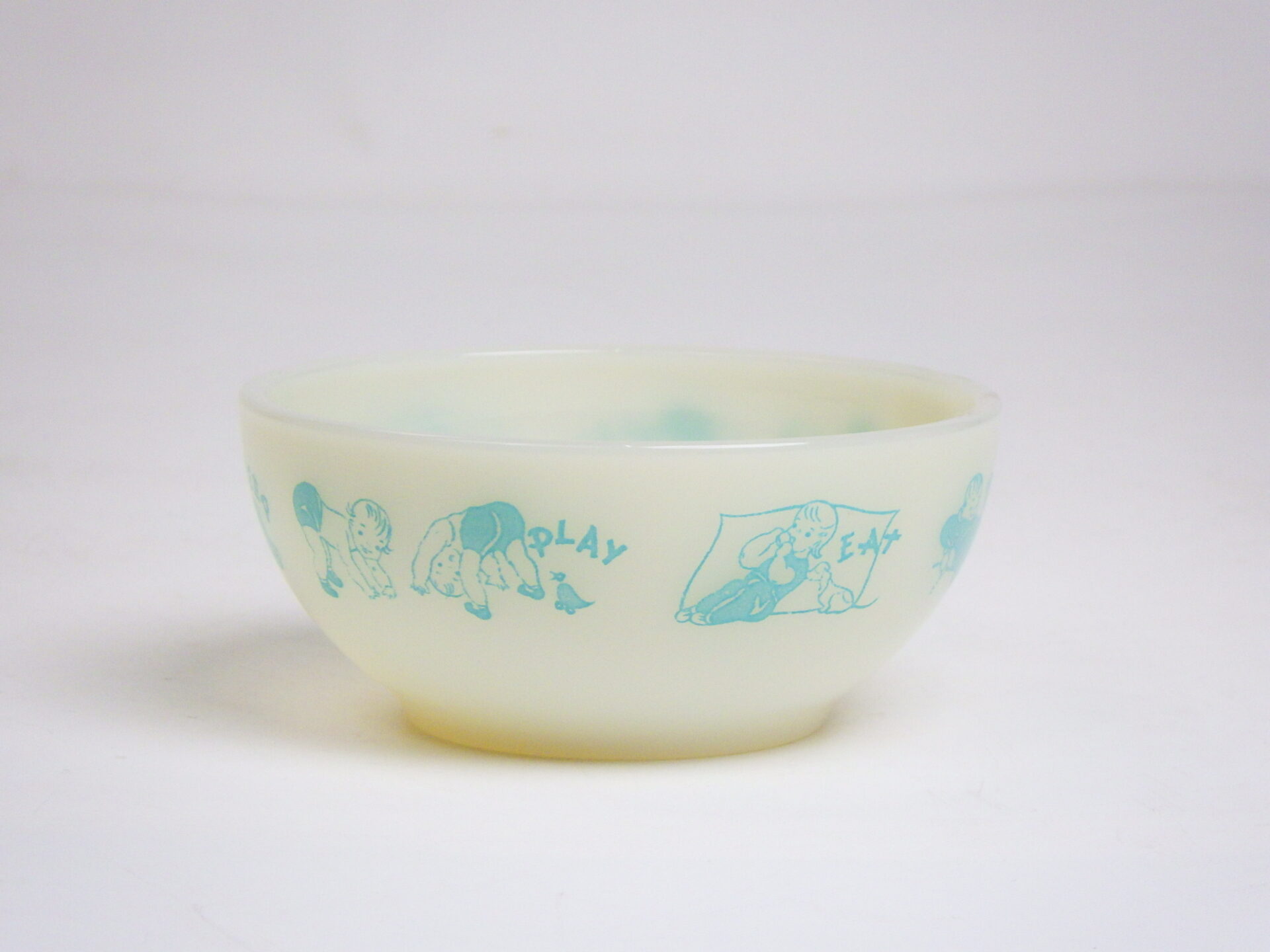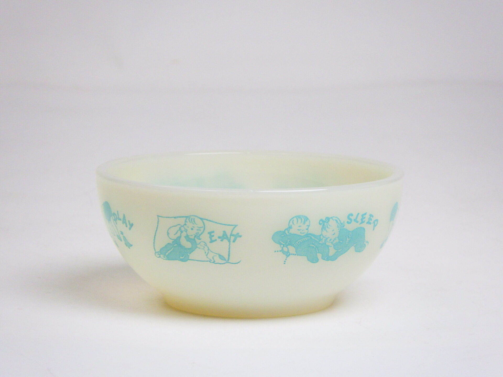 | 赤ちゃん柄がとても可愛らしいレアなプリントのチャイルドボウルです。 元はラバーのホルダー(ボウルを置く台)もセットで売られていたようです。 アイボリー地にターコイズブルーのプリントがビンテージらしく、オススメのアイテムです。 |