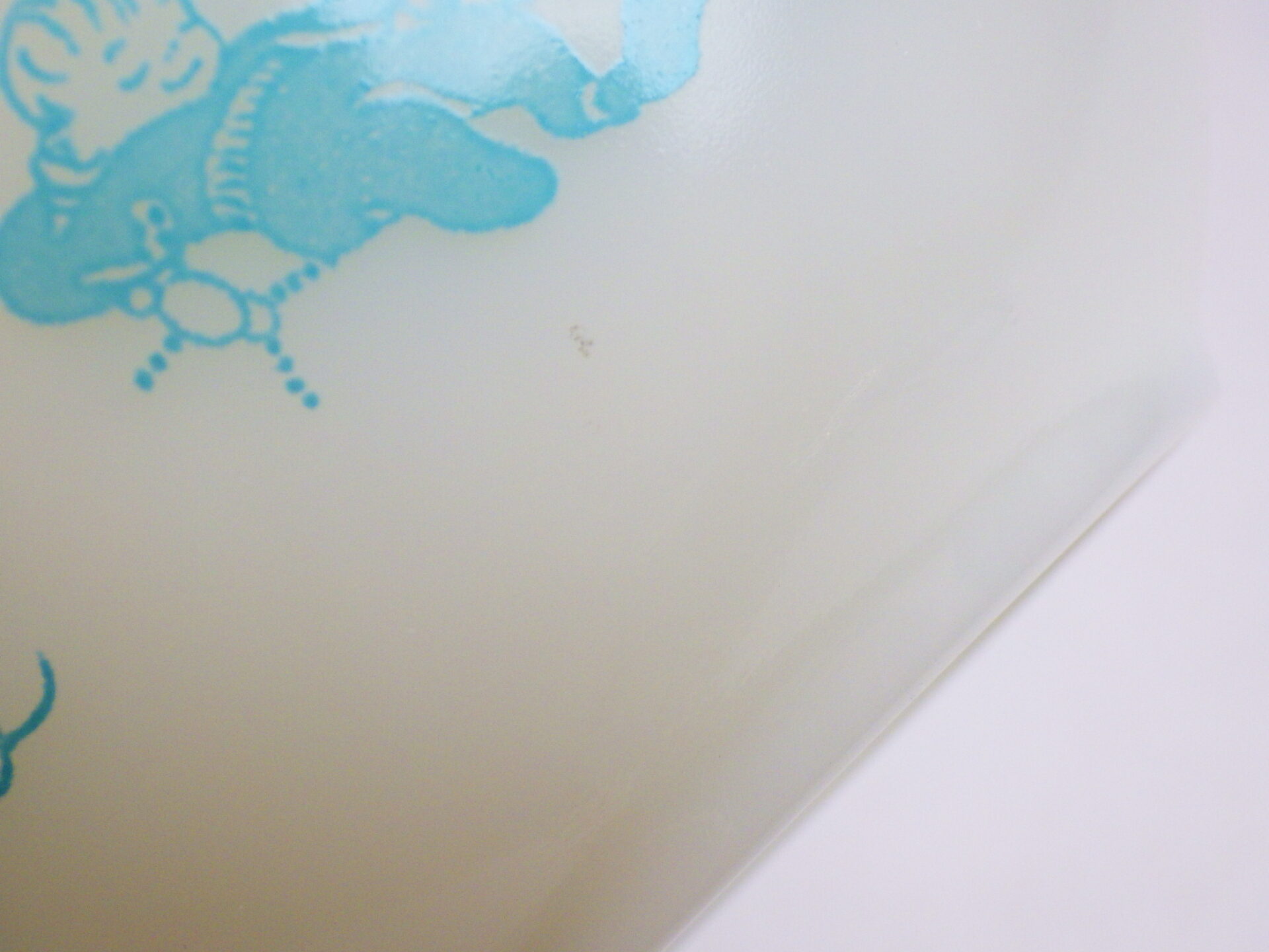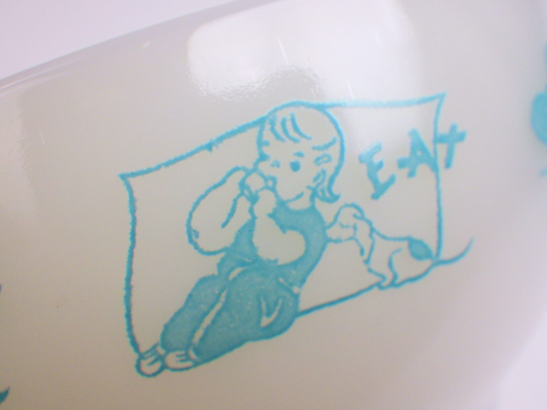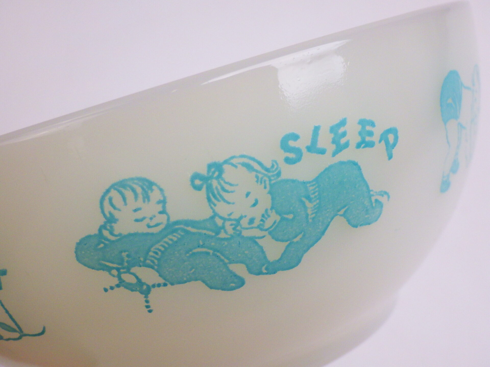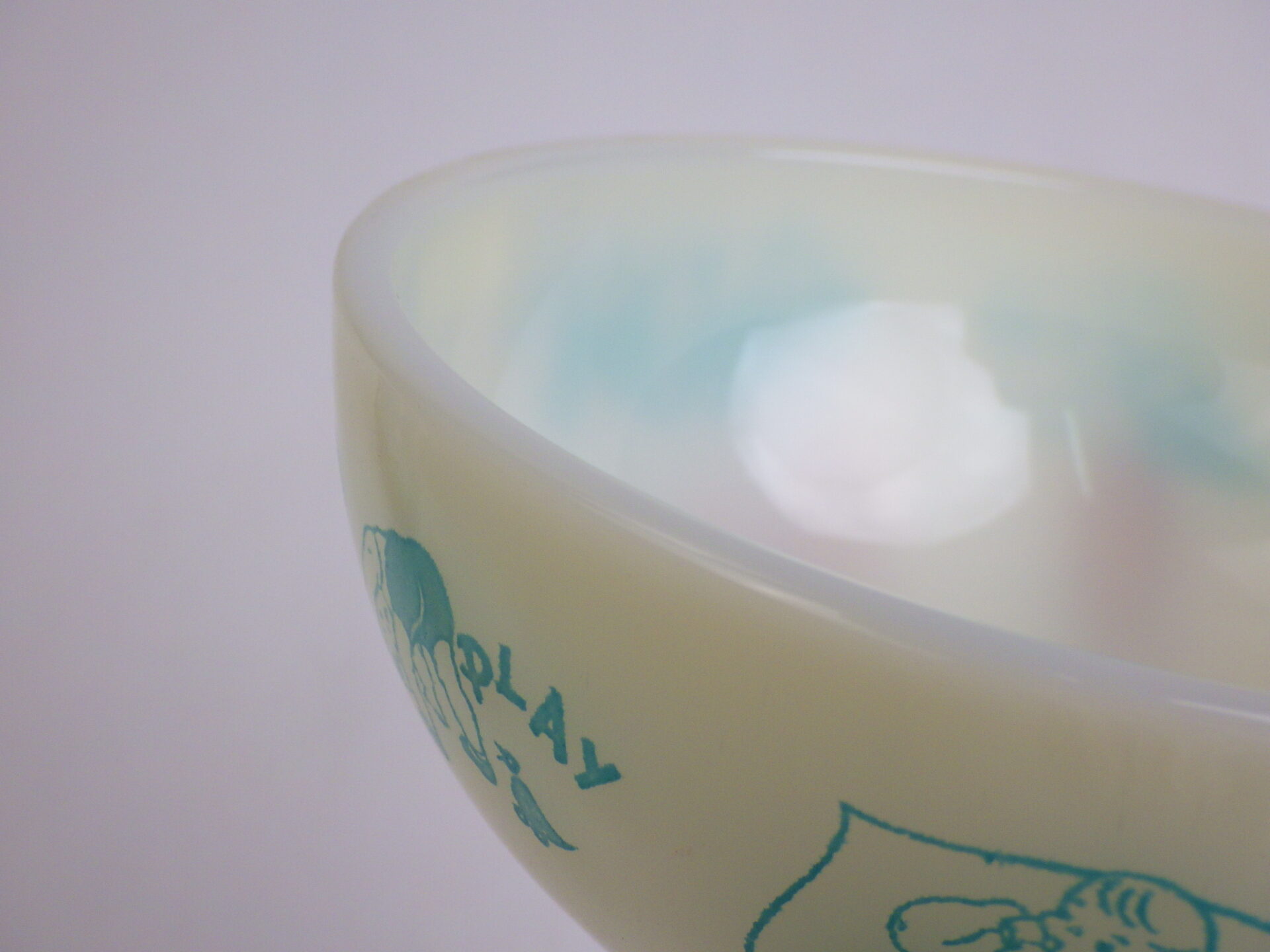 | 赤ちゃん柄がとても可愛らしいレアなプリントのチャイルドボウルです。 元はラバーのホルダー(ボウルを置く台)もセットで売られていたようです。 アイボリー地にターコイズブルーのプリントがビンテージらしく、オススメのアイテムです。 |