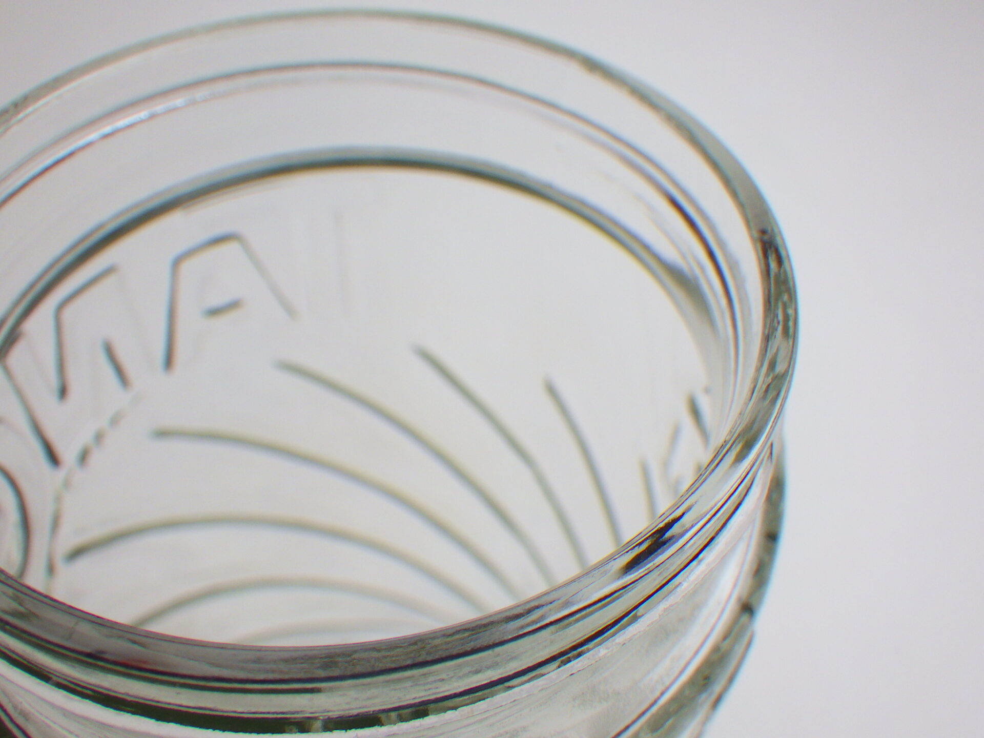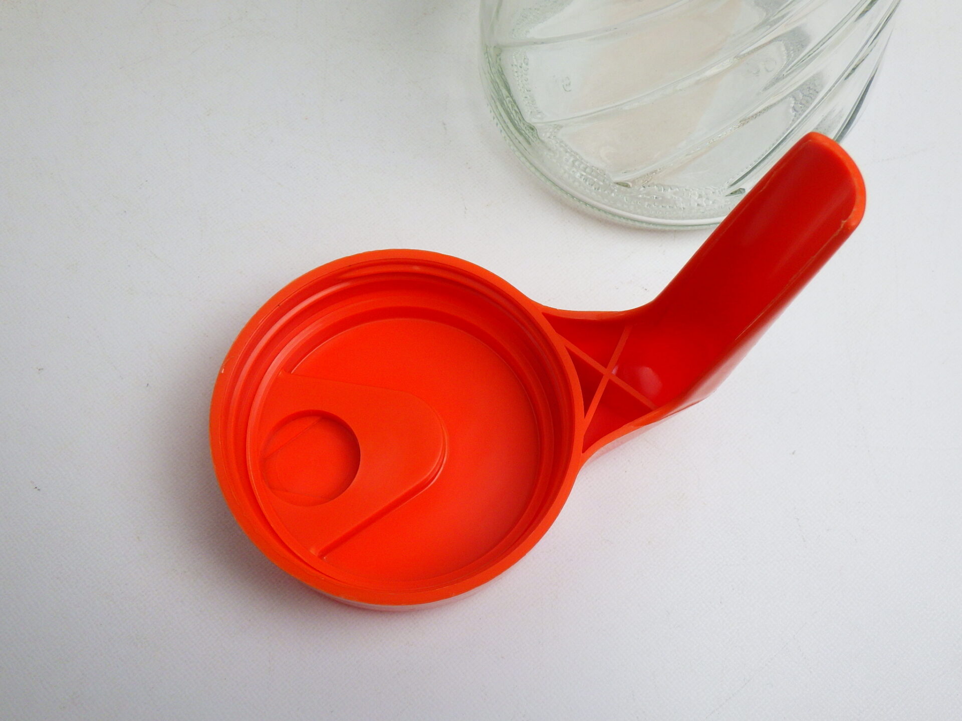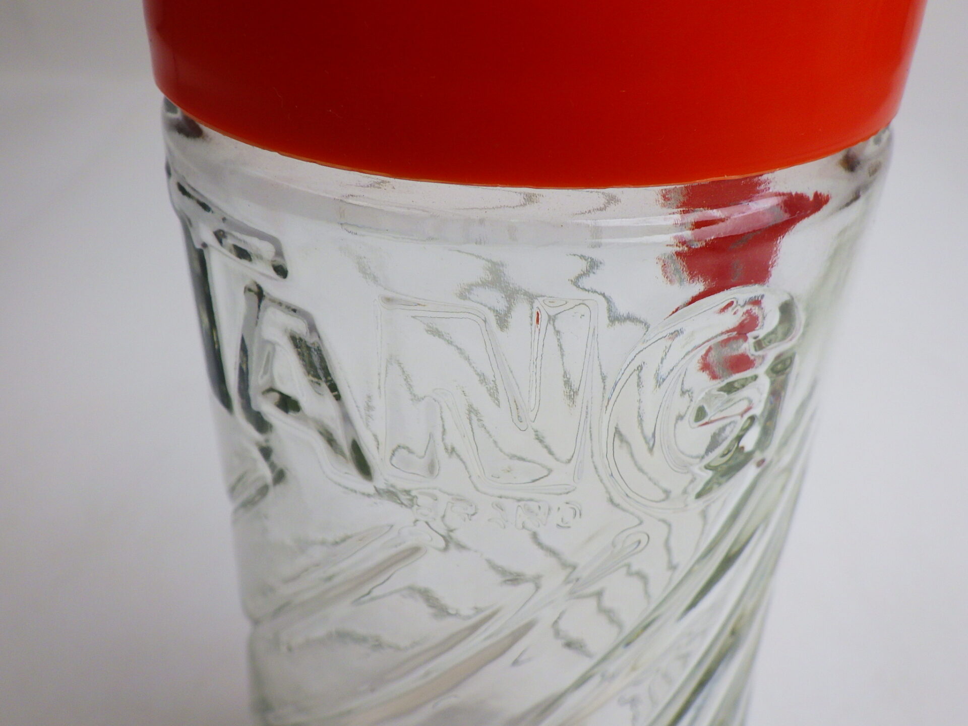 | TANGはアメリカで1959年から販売開始された粉末タイプのジュースの会社です。 こちらはその販促商品としてファイヤーキングでお馴染みのアンカーホッキング社が製造したジュースサーバーです。 夏は麦茶などをいれてそのまま冷蔵庫で冷やせます。 食卓に置いても絵になるアイテムです。 |