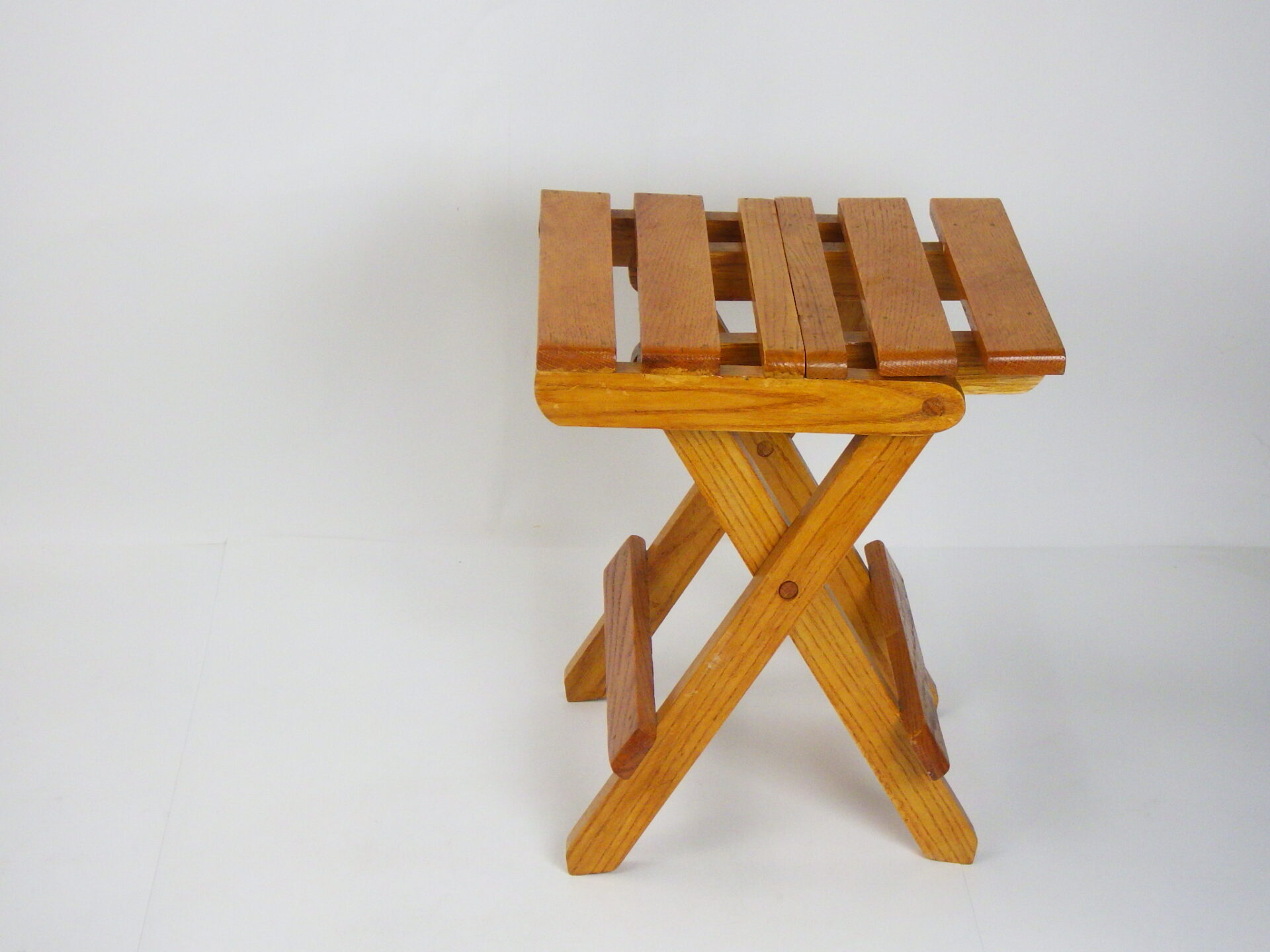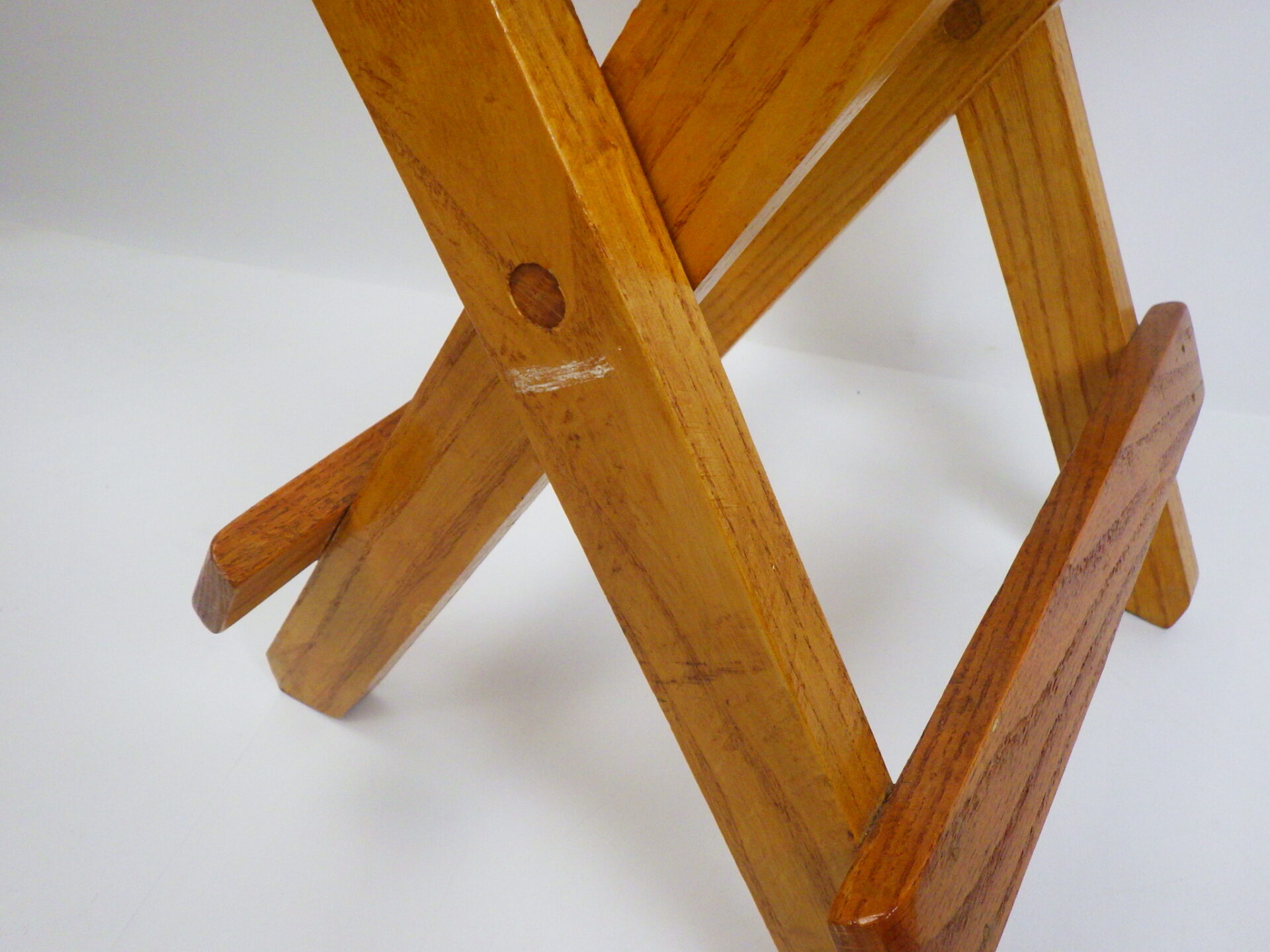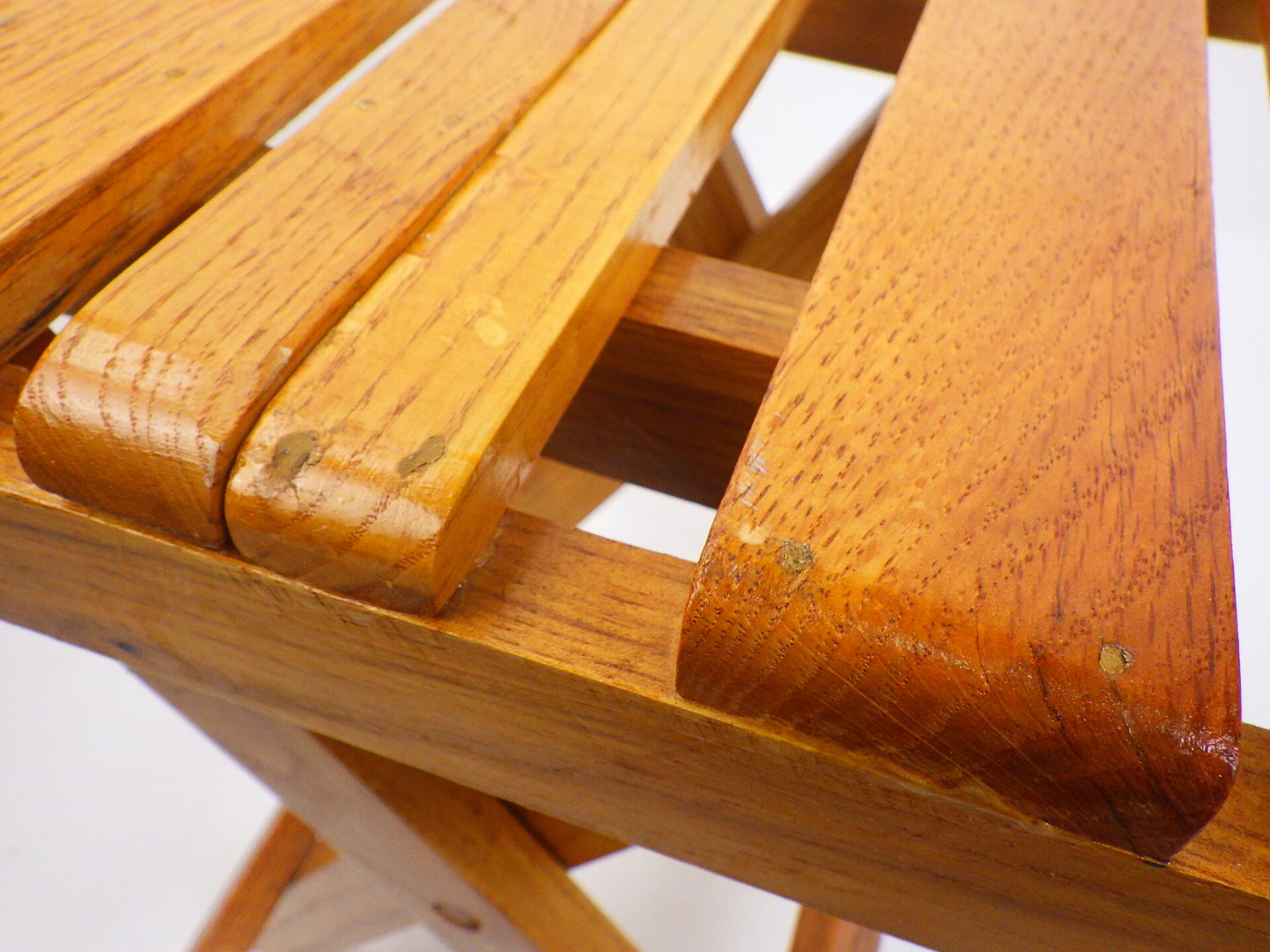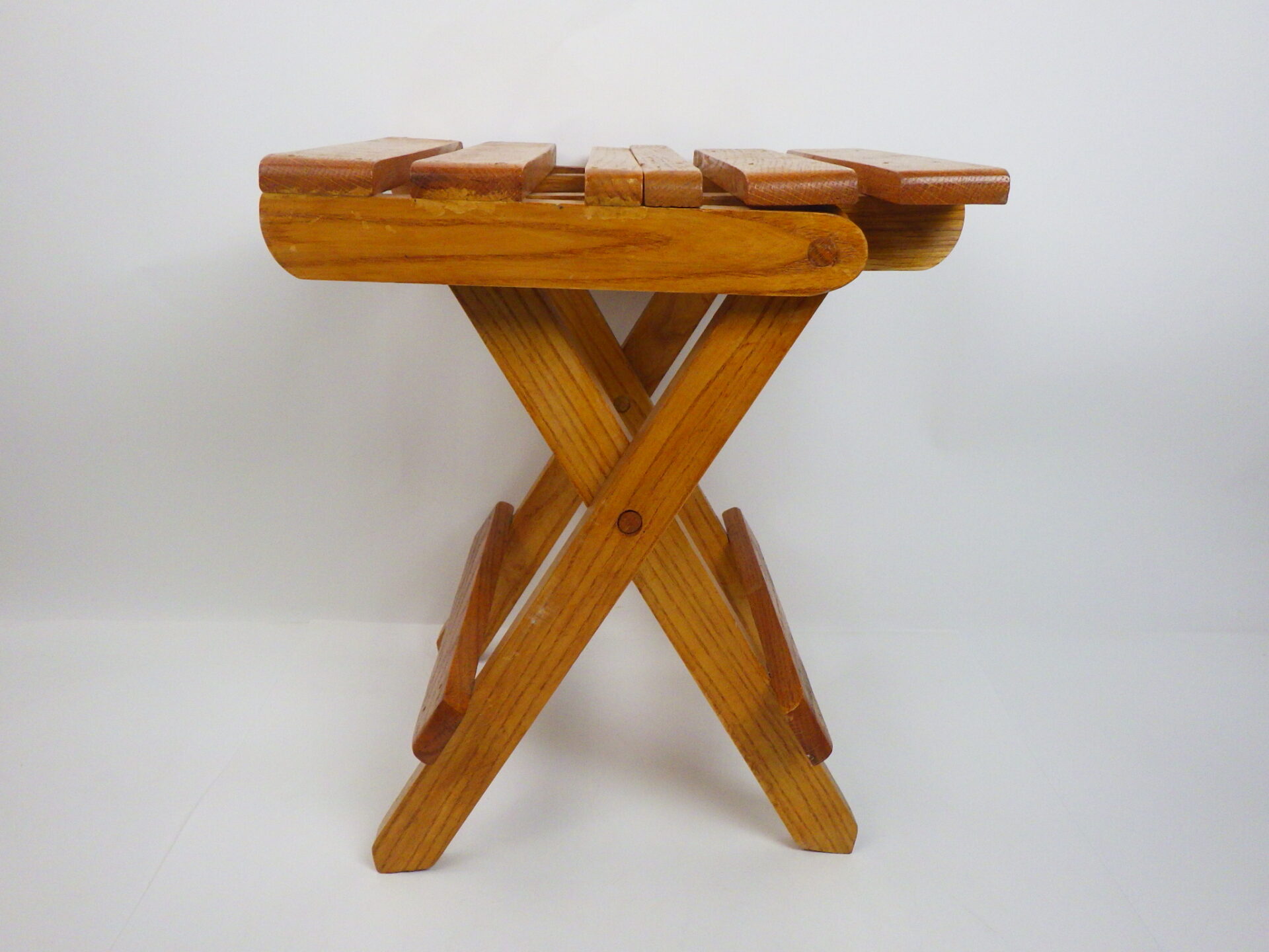 | アメリカで買い付けました。 ビンテージのフォールディング木製スツールです。 折り畳む際は座面を左右にスライドさせて折り畳みます。 状態も良く腰掛けても使えますし、キャンプ等に持ち出してクーラー等を置くのにも良い雰囲気です。 |