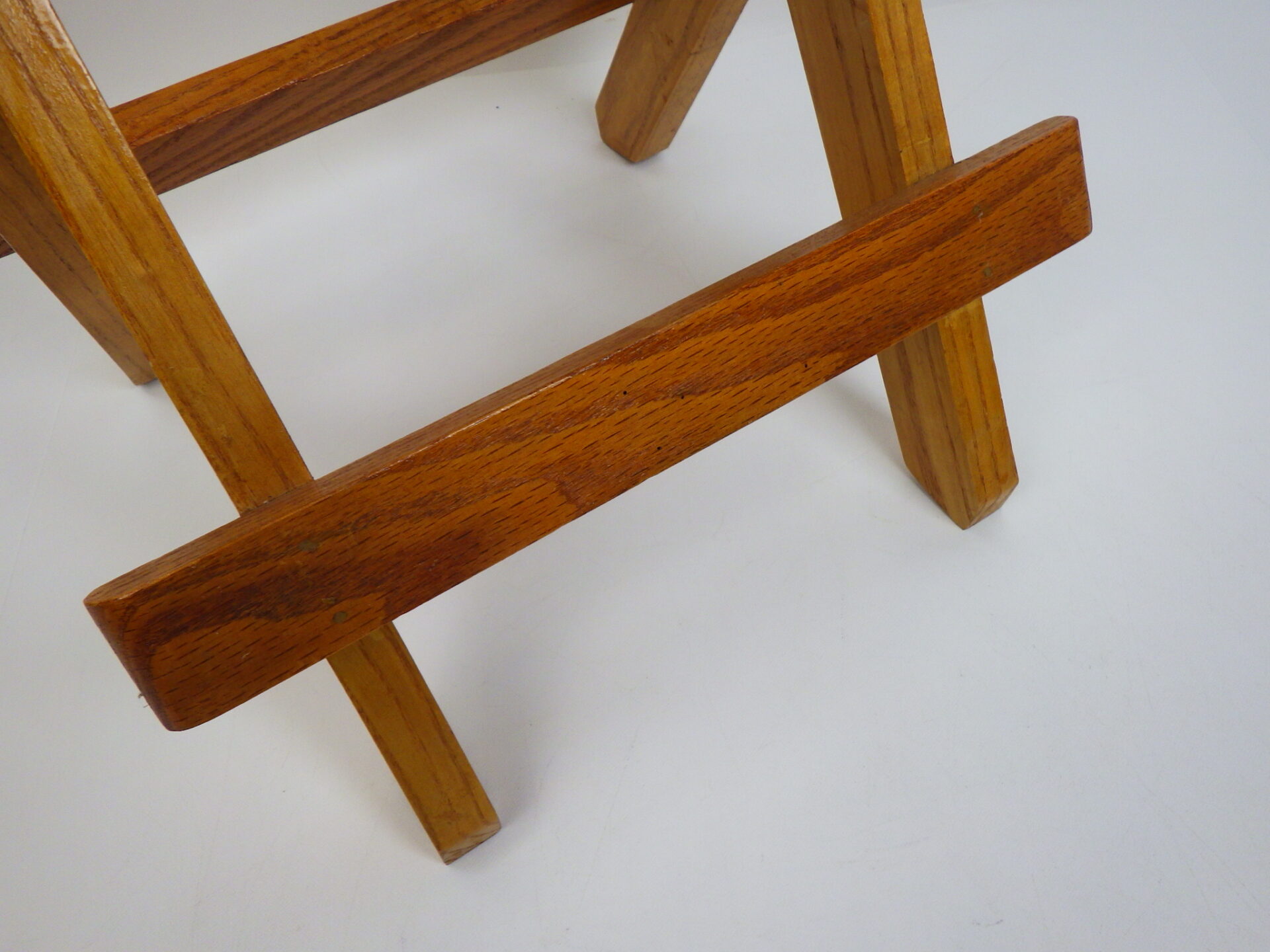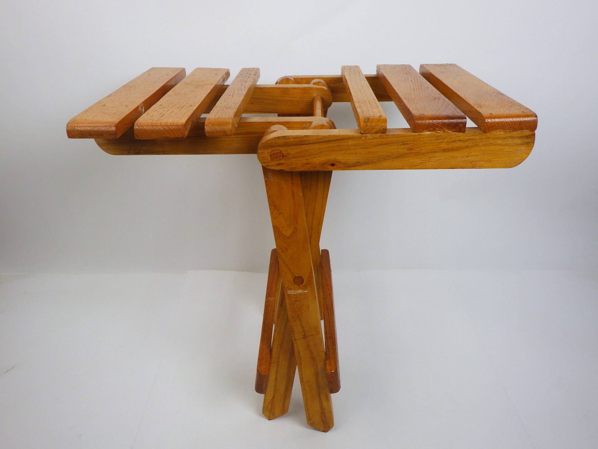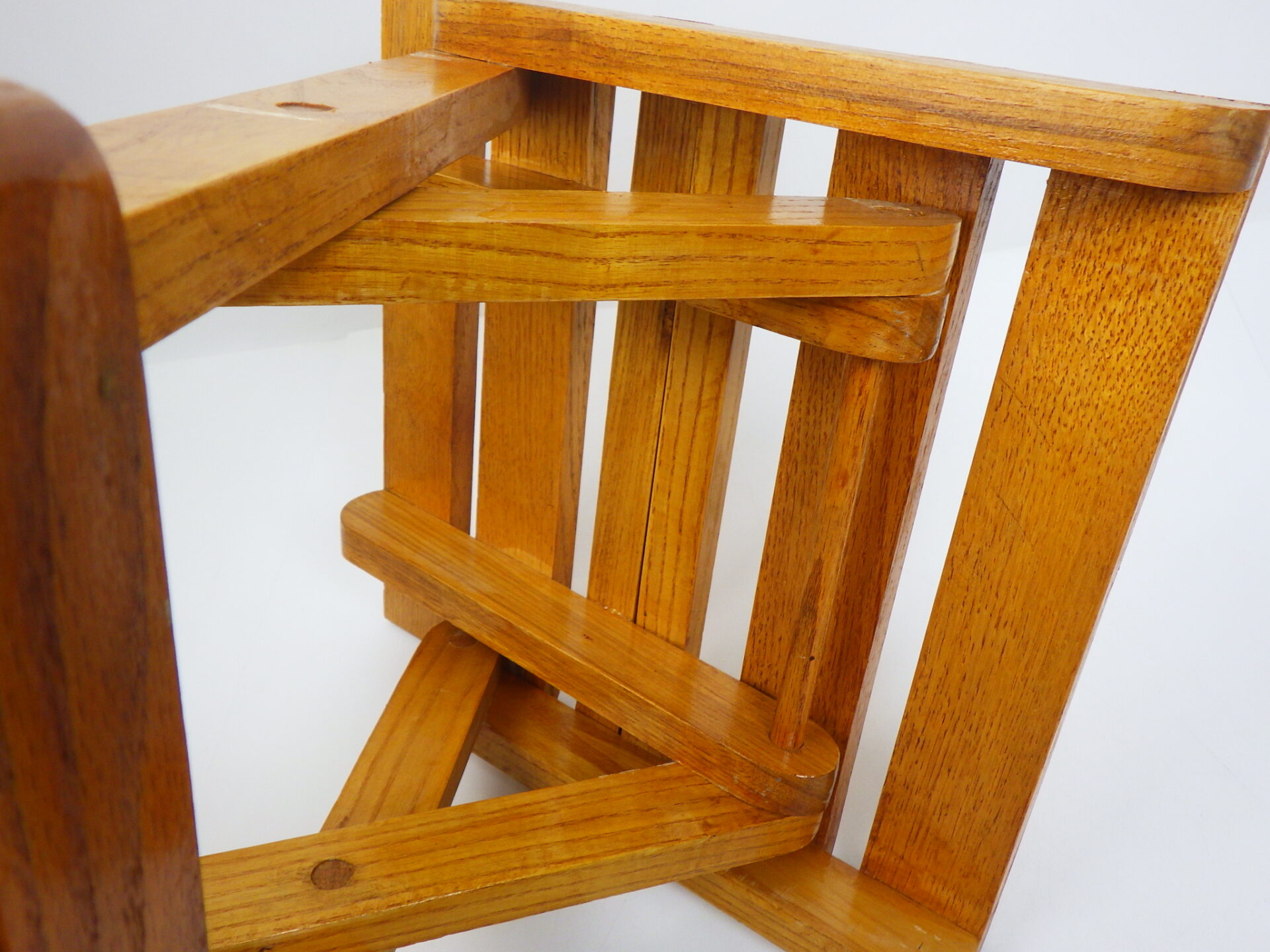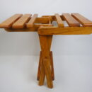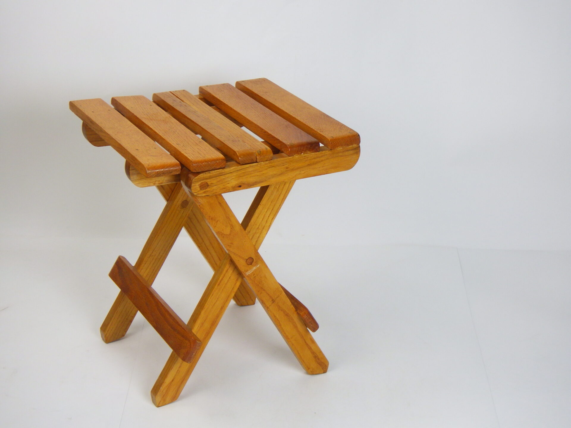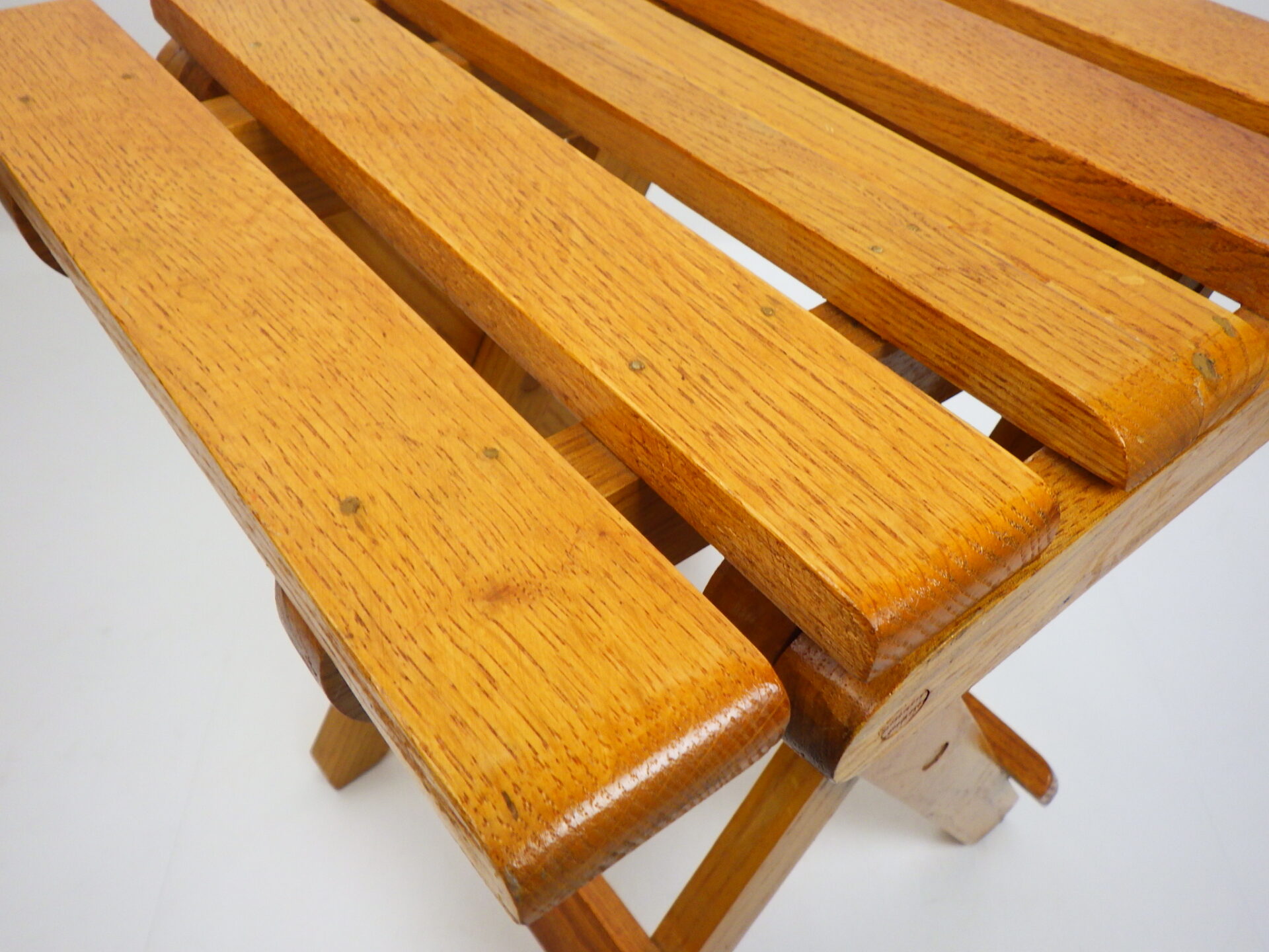 | アメリカで買い付けました。 ビンテージのフォールディング木製スツールです。 折り畳む際は座面を左右にスライドさせて折り畳みます。 状態も良く腰掛けても使えますし、キャンプ等に持ち出してクーラー等を置くのにも良い雰囲気です。 |